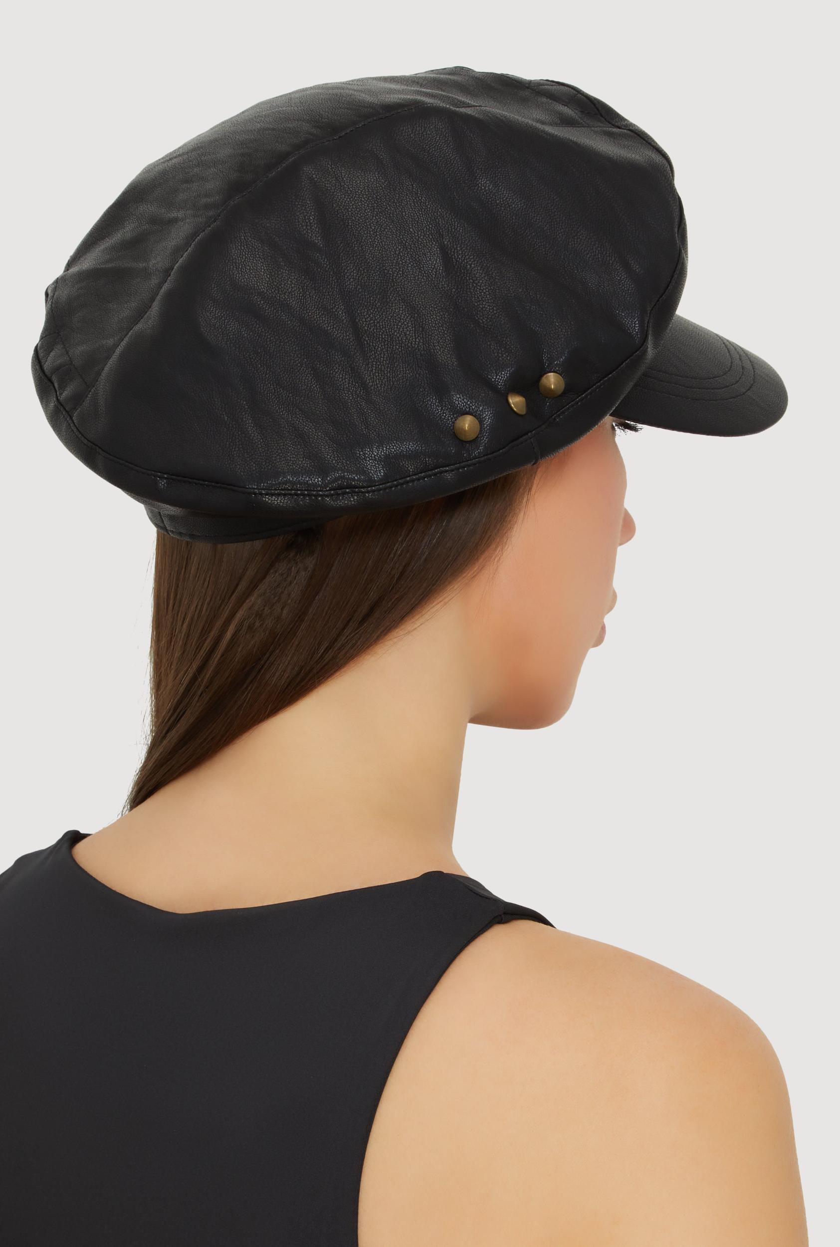 This slouchy cabbie hat features a faux leather build that adds a sleek edge to casual outfits. Its relaxed silhouette offers an effortlessly cool vibe, perfect for everyday wear. Soft faux leather material delivers a stylish, durable finish Slouchy shape creates a laid-back, versatile look Studded details for extra pop Ideal for casual occasions, elevating simple outfits with ease MeasurementsCircumference: 24 inContent and Care Material: 100% Polyurethane Country Of Origin: China Rainbow Item Number 1129074395840 BLACK - 1129074395840001