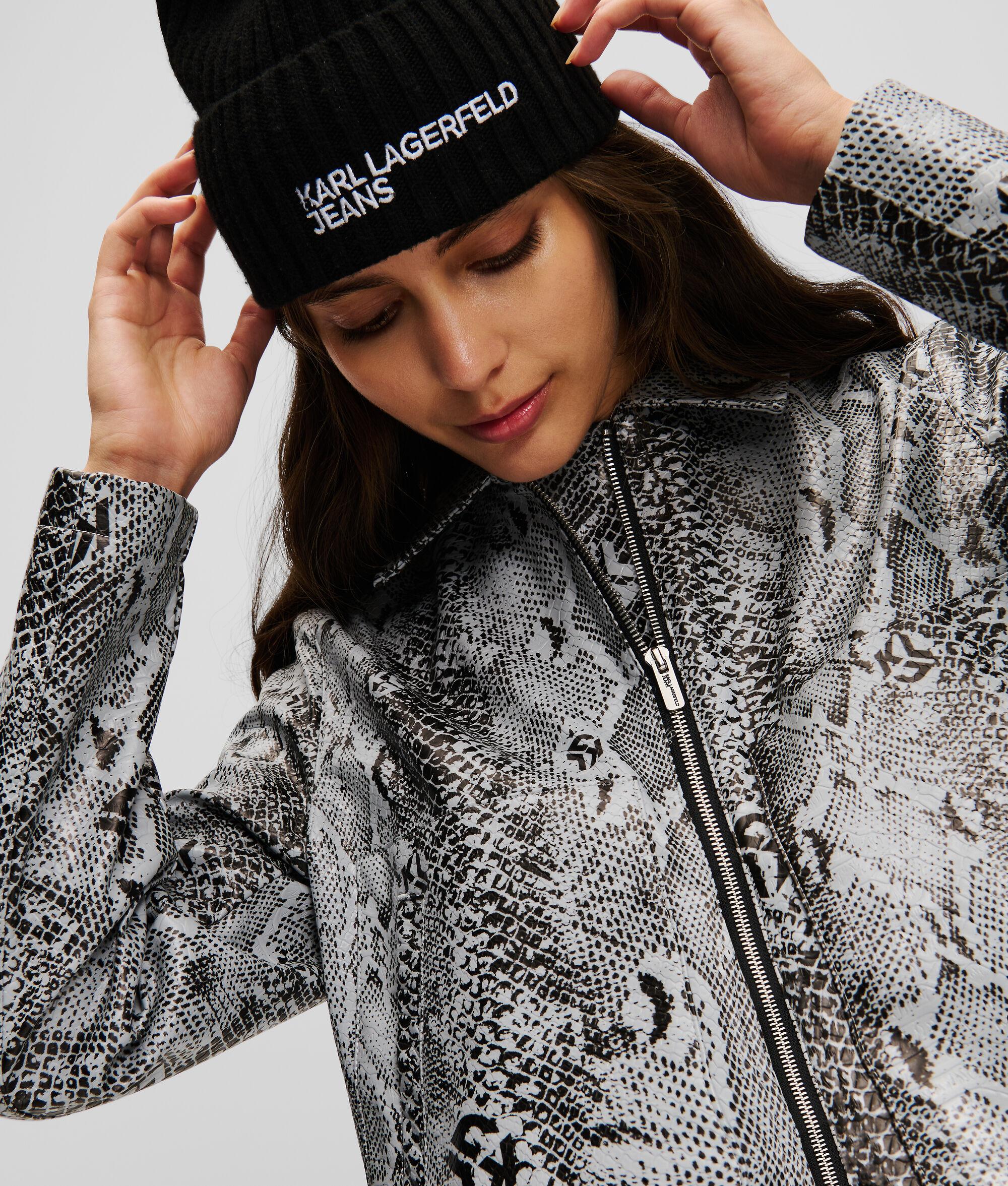 Elevate your street style with this snakeskin-inspired jacket from KARL LAGERFELD JEANS, featuring a shiny metal zip closure and convenient snap-button pockets for essential practicality.