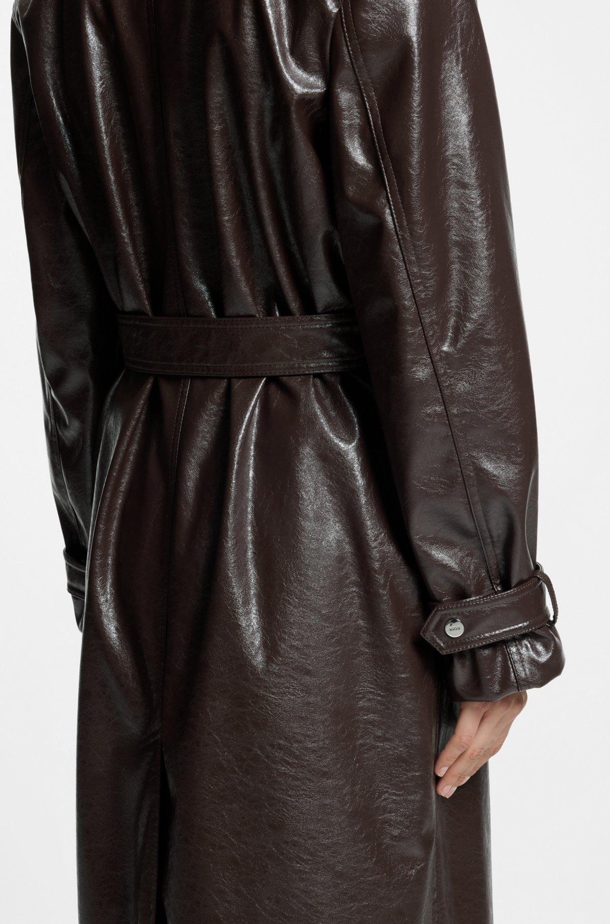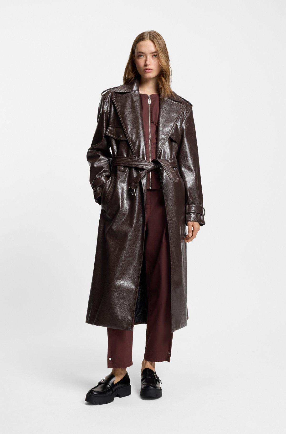 With its relaxed cut and creative styling, this HUGO Womenswear trench coat is a modern take on a classic. Crafted in soft synthetic coated fabric. Synthetic coated fabric, sometimes referred to as faux leather, is a fabric designed to resemble real leather, and/or display a matte, glossy, smooth, or textured, coated appearance.