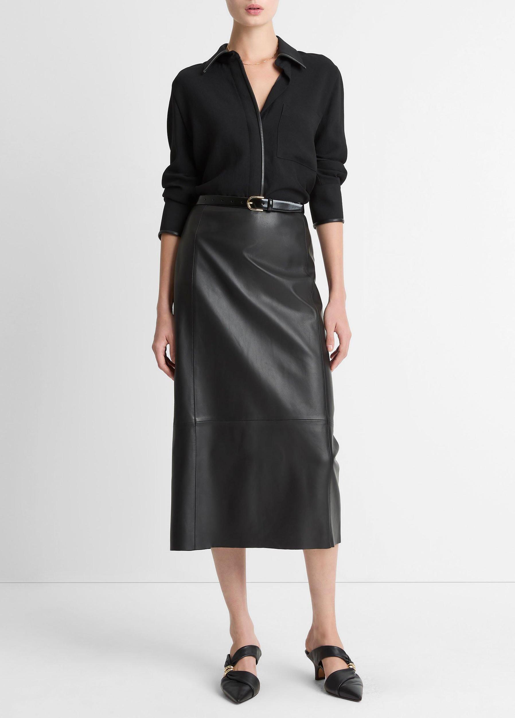 Nods to vintage car interiors pepper our lineup this fall. Spy them in the faux-leather trims that frame this matte crepe button-up. A hidden placket lends a clean finish.
