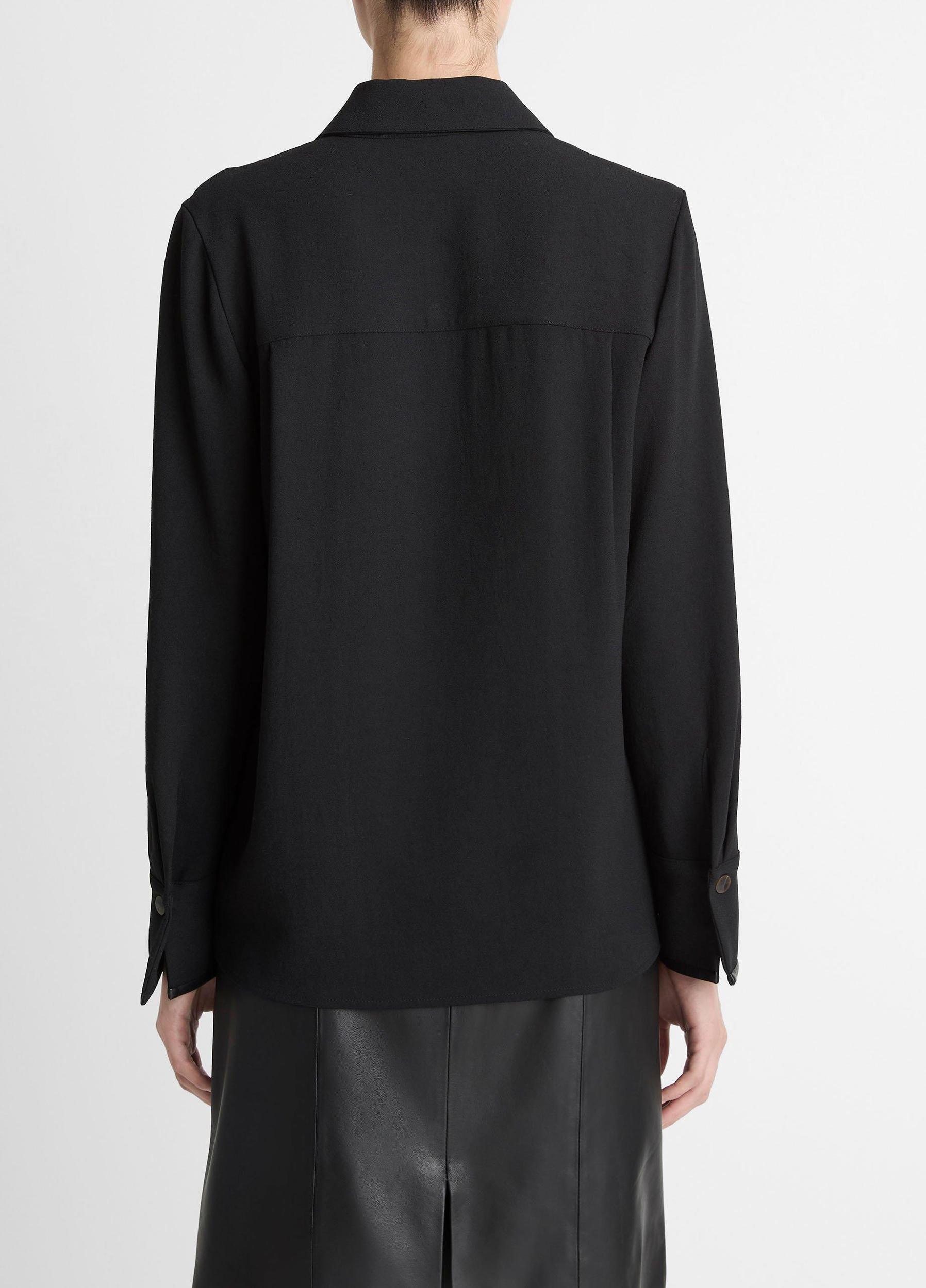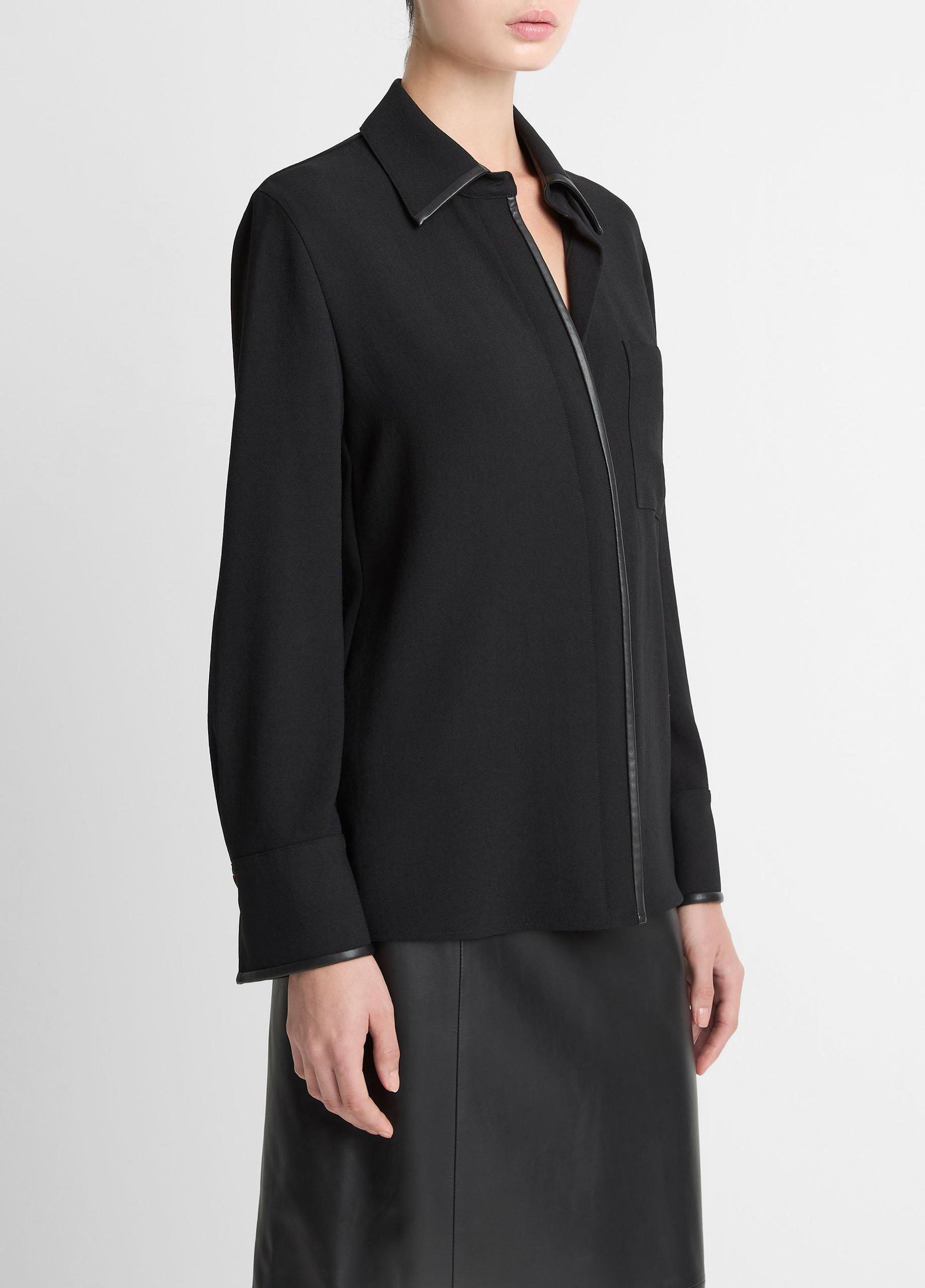 Faux-Leather-Trim Crepe Button-Front Shirt