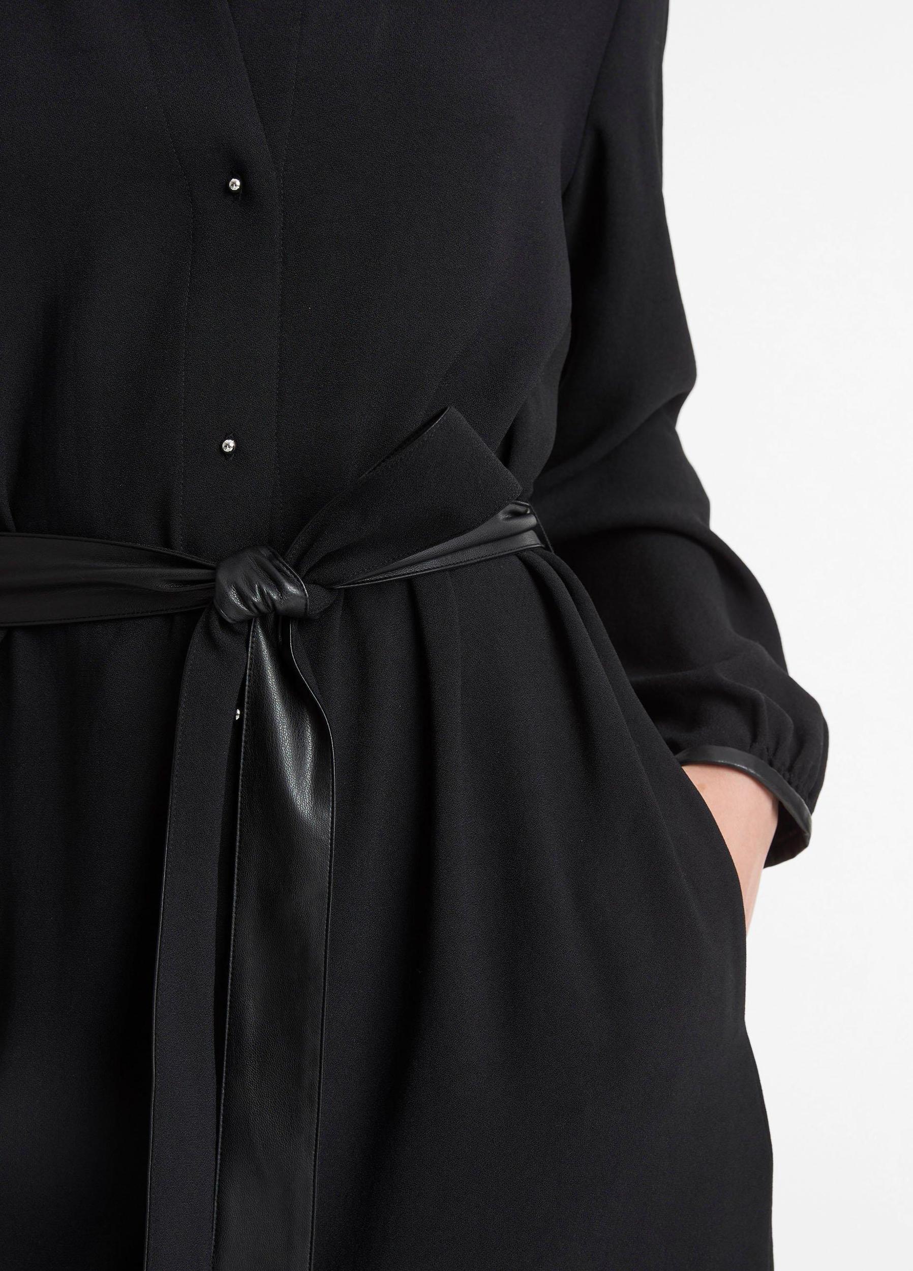Nods to vintage car interiors pepper our lineup this fall. Spy them in the faux-leather trims and refined metal-ball details that frame this matte crepe shirt dress. Pay close attention also to the nape and cuffs, which get their soft volume from a touch of smocked ruching. We finished the silhouette with a removable self-tie belt — cinch it to your desired fit or leave it behind for a more relaxed look.