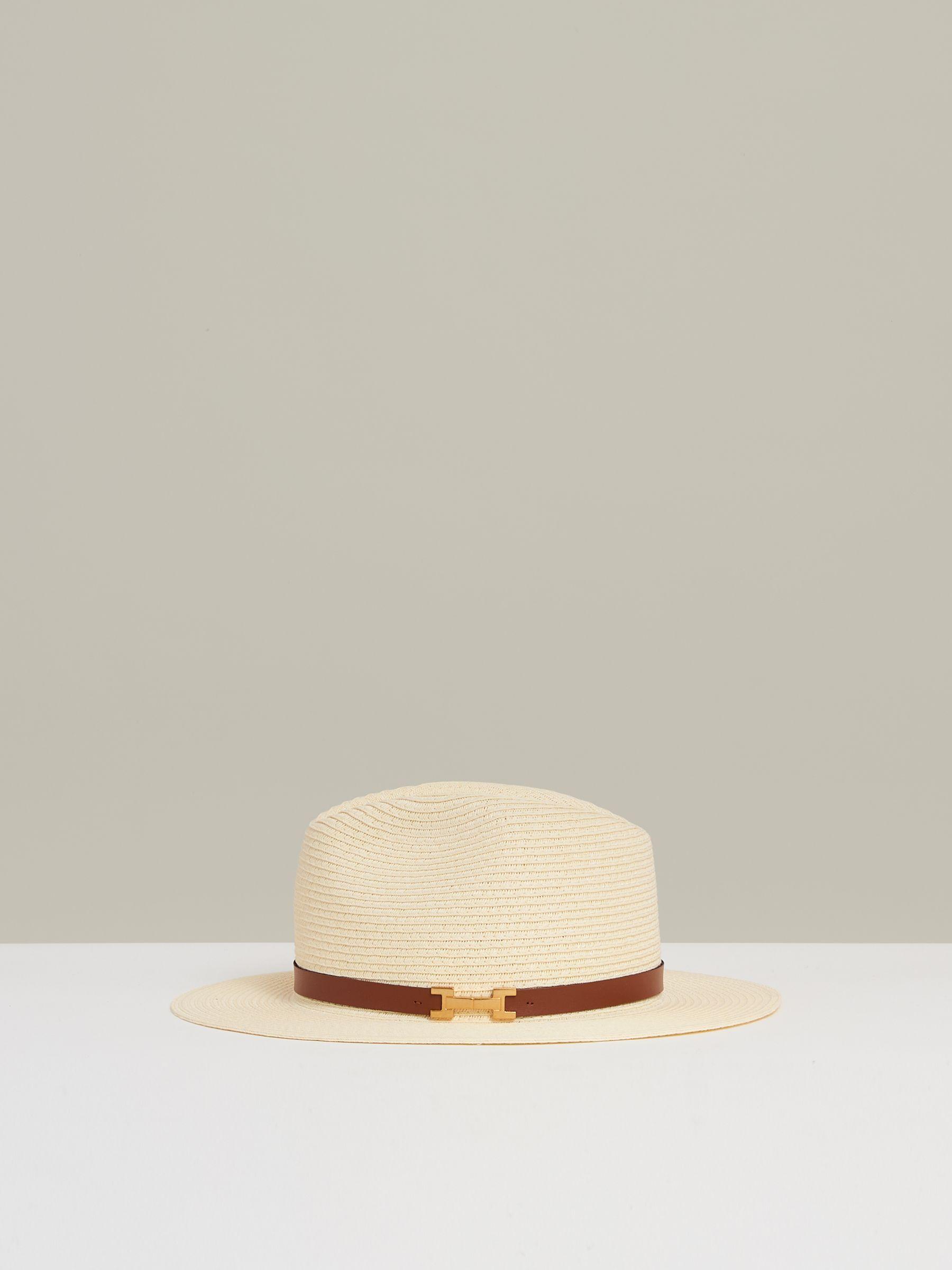 The Gigi hat has a woven construction and a medium-sized brim. A faux leather trim secures the base of the hat, finishing with gold-tone hardware. Woven paper construction Faux leather trim Gold-tone hardware