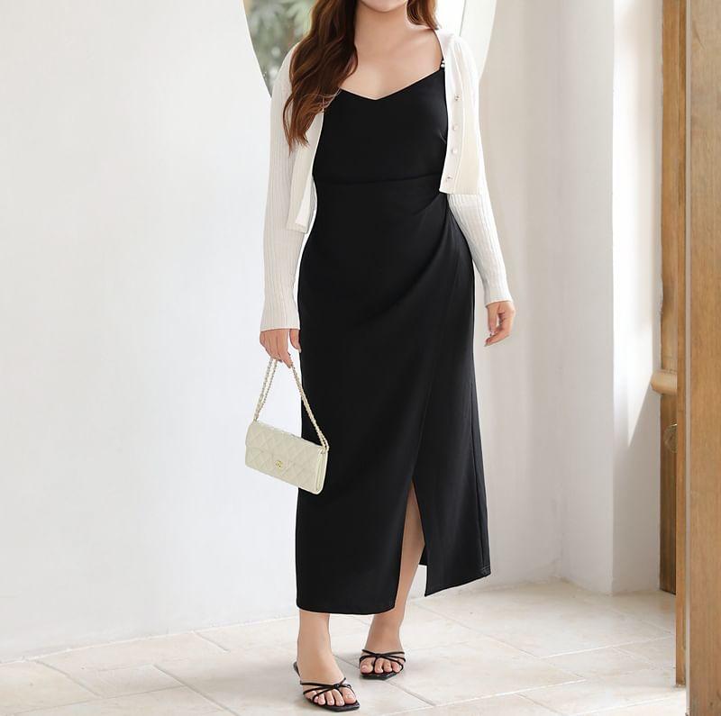 Faux Pearl Spaghetti Strap Plain Ruched Slit Maxi Sheath Dress / V-Neck Plain Ribbed Cardigan