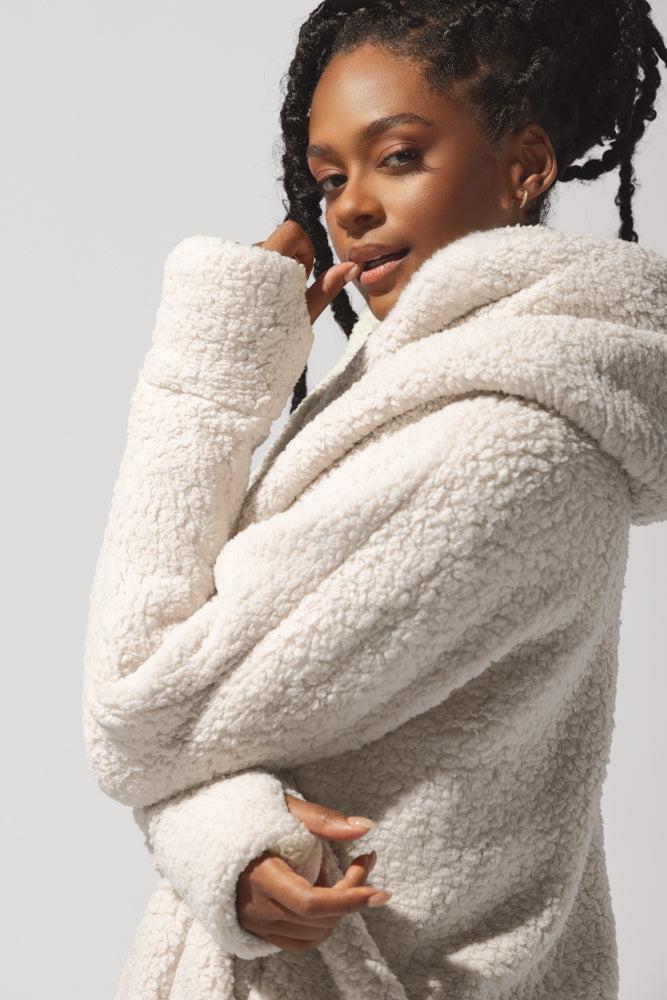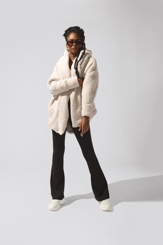 When temps drop, you cocoon up. Designed with a luxe faux sherpa fabric, the Cocoon Coat makes layering a breeze (ironic, right?). Pair with your go-to jeans or workout ootd.