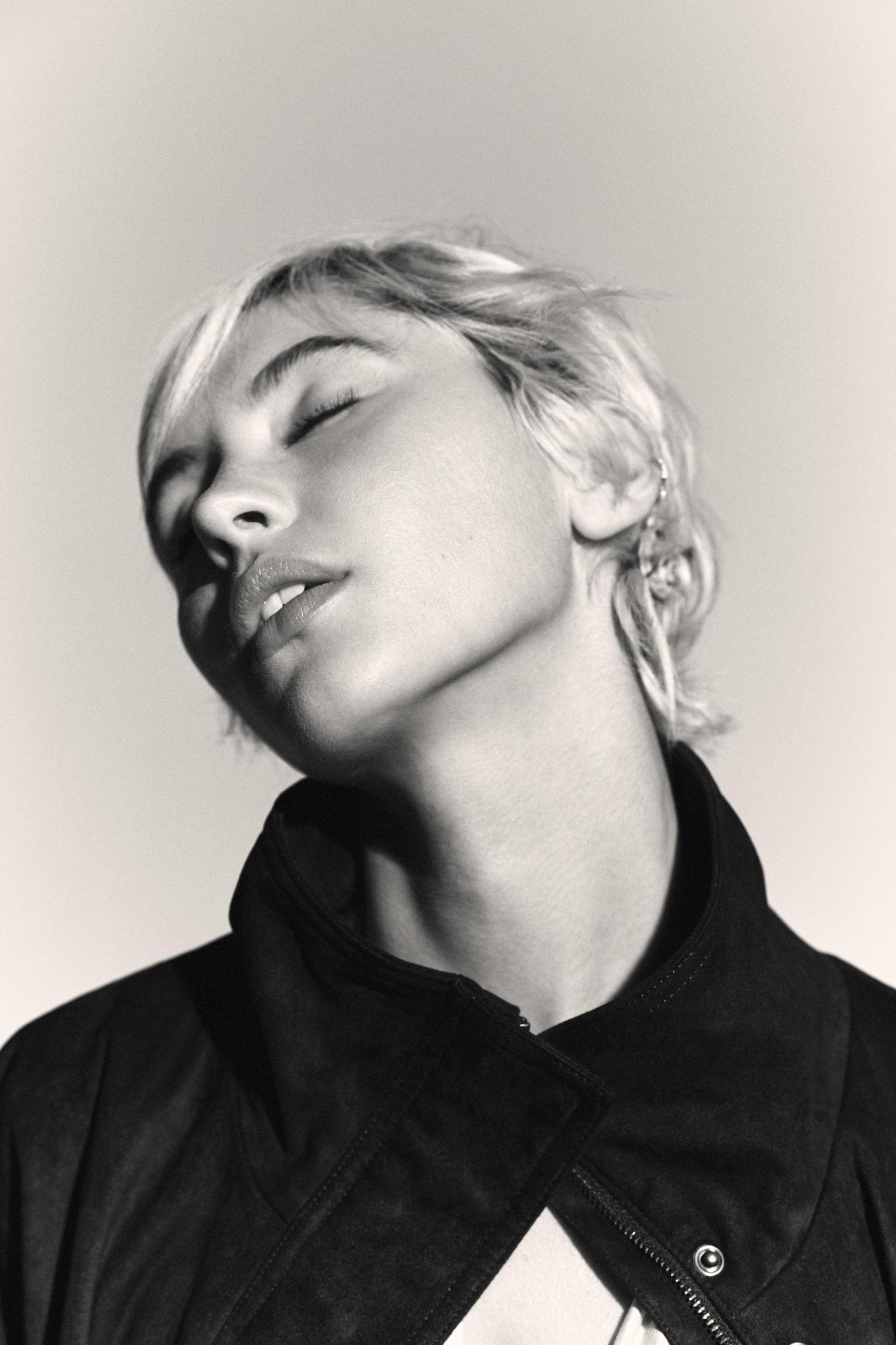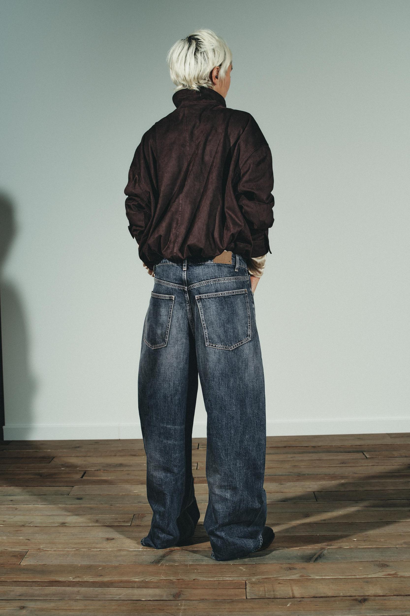High neck bomber jacket with long sleeves and cuffed hems. Front pockets. Hem with pleats and volume. Interior lining. Front zip closure with snap buttons concealed by a placket.