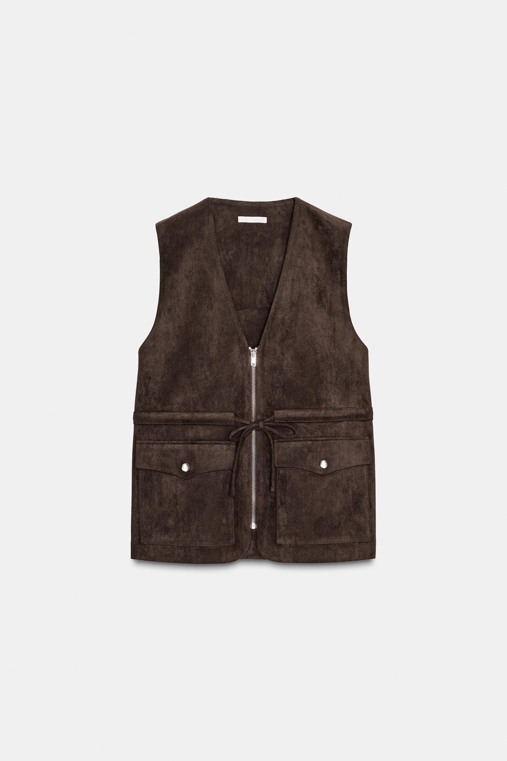 Vest made in faux suede fabric. V-neck and sleeveless. Patch pockets with flap and snap button. Adjustable drawstring waist. Front metal zip closure.