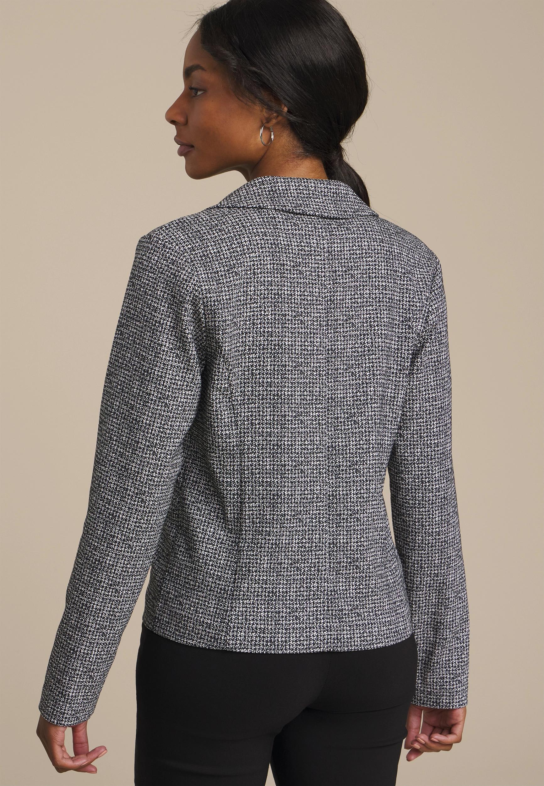 A timeless classic with a modern edge—this tweed blazer brings effortless polish to every look. Crafted from a stretchy bengaline fabric for comfort and movement, it features a refined notched lapel and a single-button closure that creates a sleek, flattering silhouette. Perfect for layering over a crisp blouse at the office or pairing with denim for a chic weekend vibe, this blazer is your go-to piece for confidence and sophistication, wherever the day takes you. .mar-pdp-section .mar-product-description {color: #000;}.mar-pdp-section .mar-product-description ul, .mar-pdp-section .mar-product-description ul>li {margin-left: 10px;padding-left: 10px;}.mar-pdp-section .mar-product-description .mar-product-description-content ul li{list-style-type: disc;margin: 0 0 5px;padding-left: 5px;}.mar-pdp-section .mar-product-description p {color: #000;padding: 5px 0;}@media only screen and (max-width: 1023px){.mar-pdp-section .mar-product-description .mar-product-description-content ul li{list-style-type: disc !important;} .mar-pdp-section .mar-product-description .mar-product-description-content .mar-tab-content ul{padding-left: 10px;}.mar-pdp-section .mar-product-description .mar-product-description-content .mar-tab-content {font-weight: 300;}} Features: stretchy bengaline fabric faux tweed pattern long sleeves with cuffed detail notch lapel detail single button closure faux welt pockets