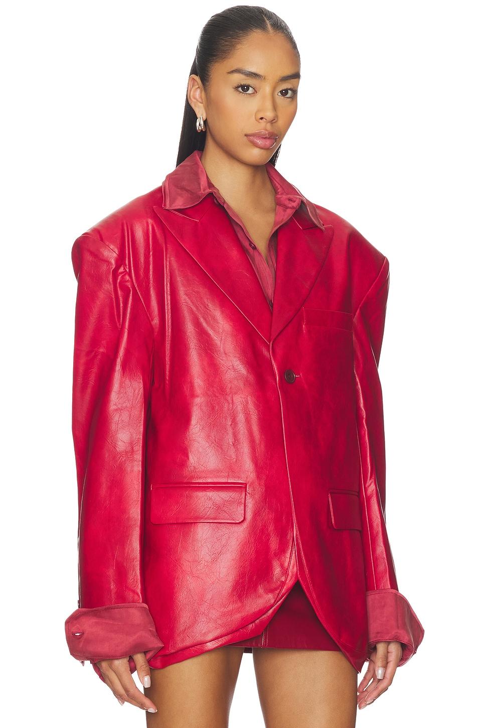 Self: 55% rayon, 45% polyurethaneSelf 2: 100% regenerated celluloseLining: 100% polyester. Made in China. Hand wash cold. Front button closure. Heavyweight faux leather fabric with satin lining. 3-pocket styling. Notched lapel collar. Revolve Style No. MRKN-WO12. Manufacturer Style No. MN2502173.