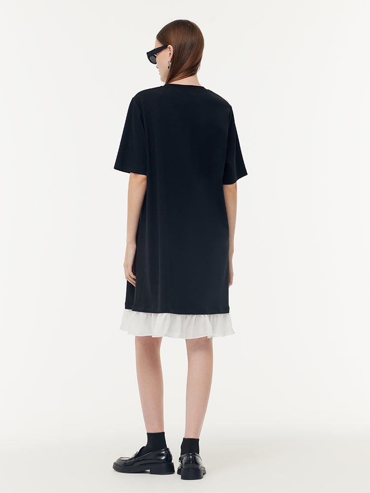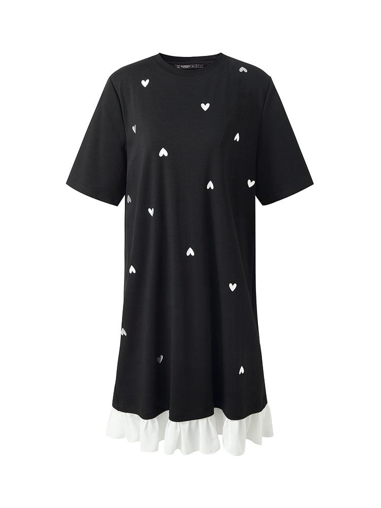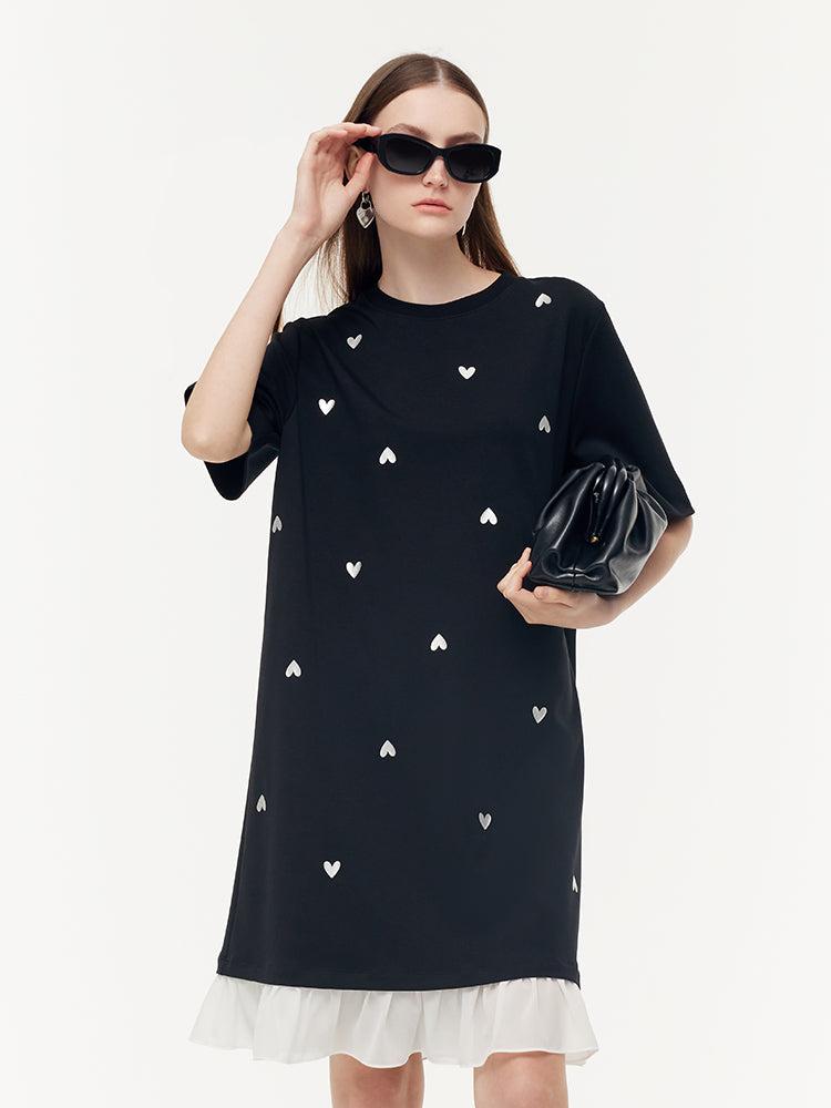 -Faux two-piece -Cotton -Loose fit This cotton dress is soft, comfy, and breathable against the skin. Adorable silver heart accents add a sweet, playful vibe to the design. The unique layered hem creates a trendy two-piece look without the hassle of mixing and matching. With its relaxed fit, it's super flattering and v