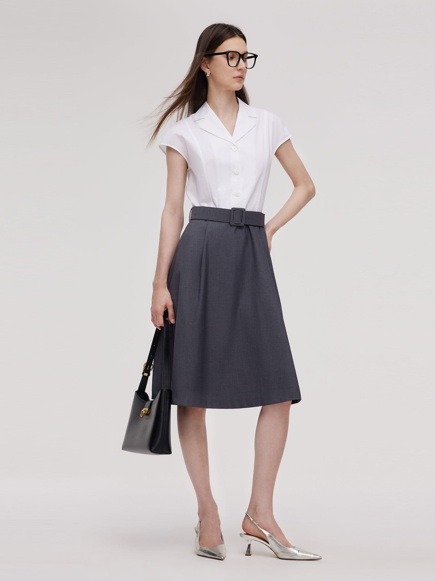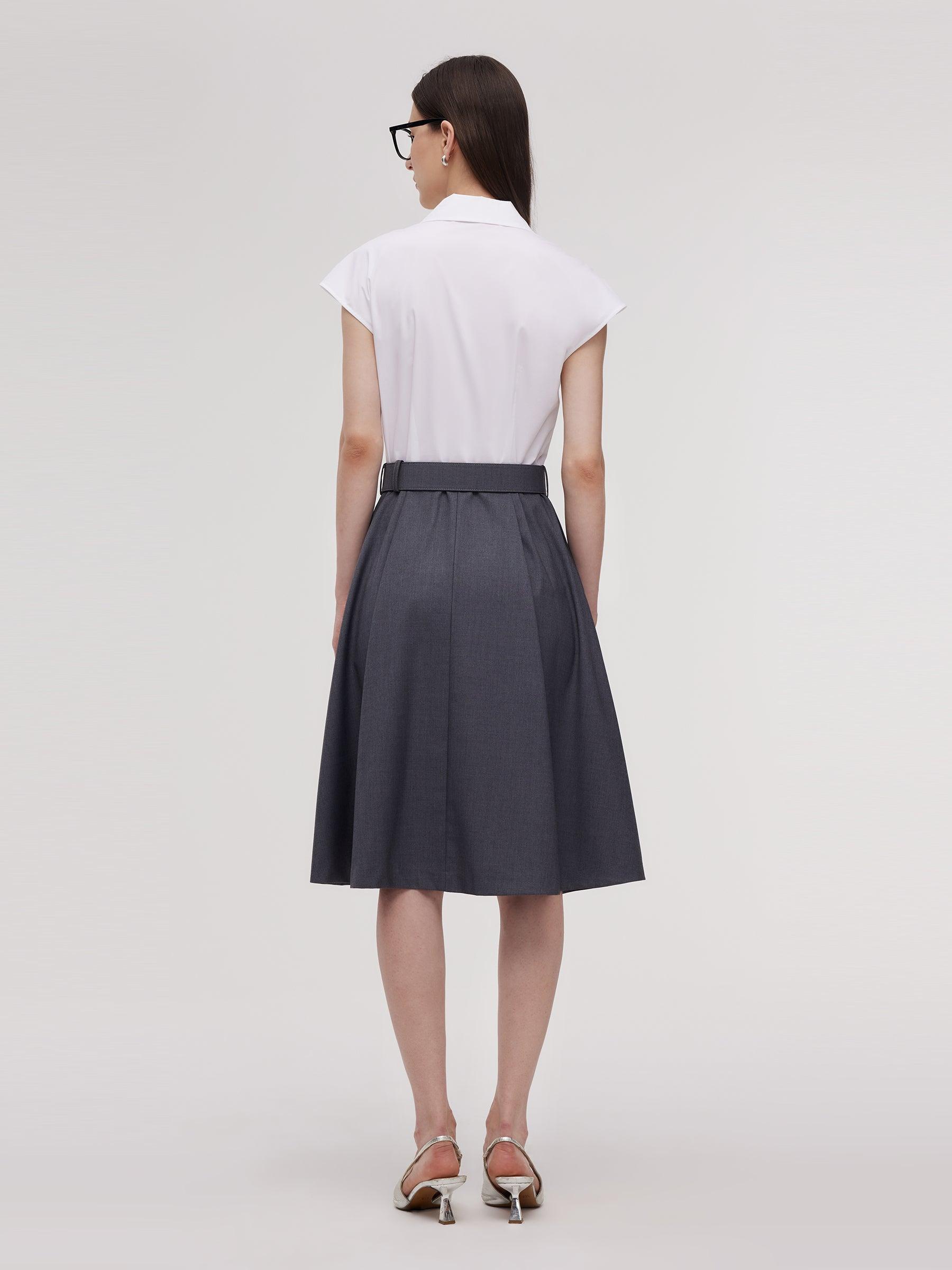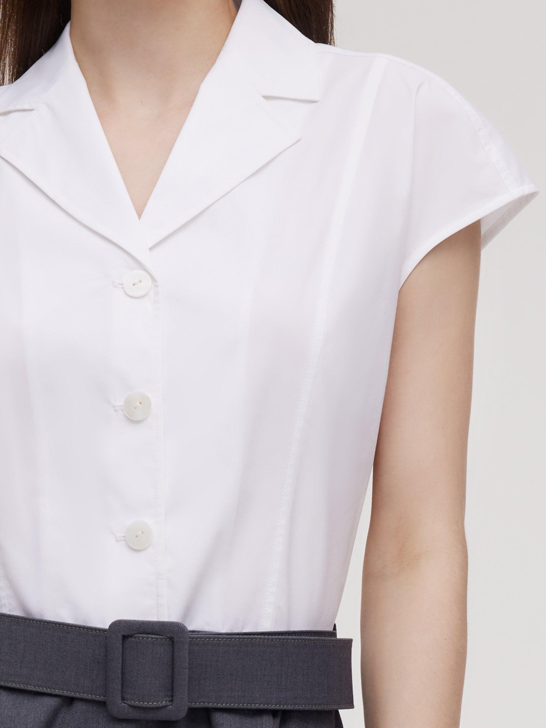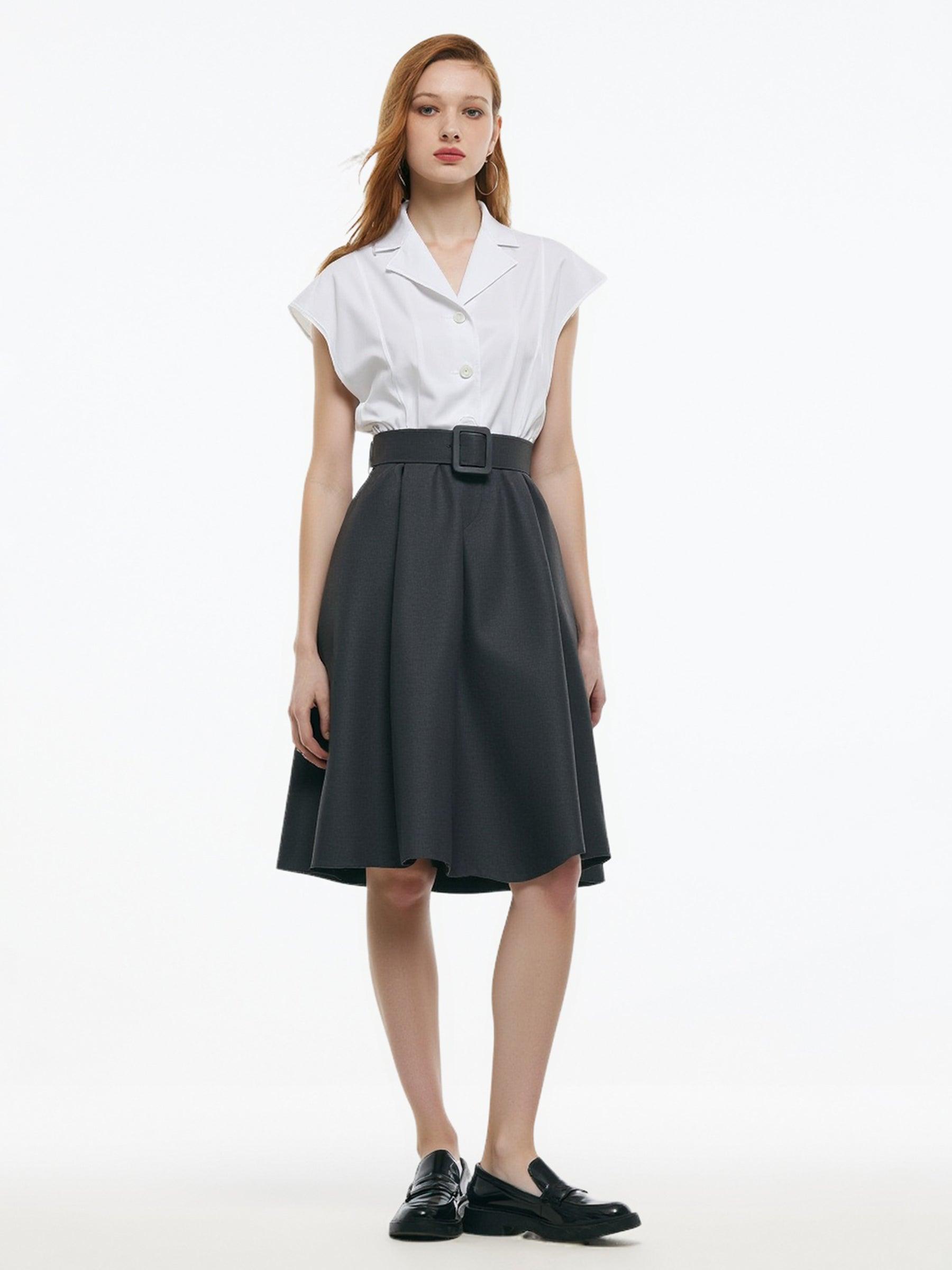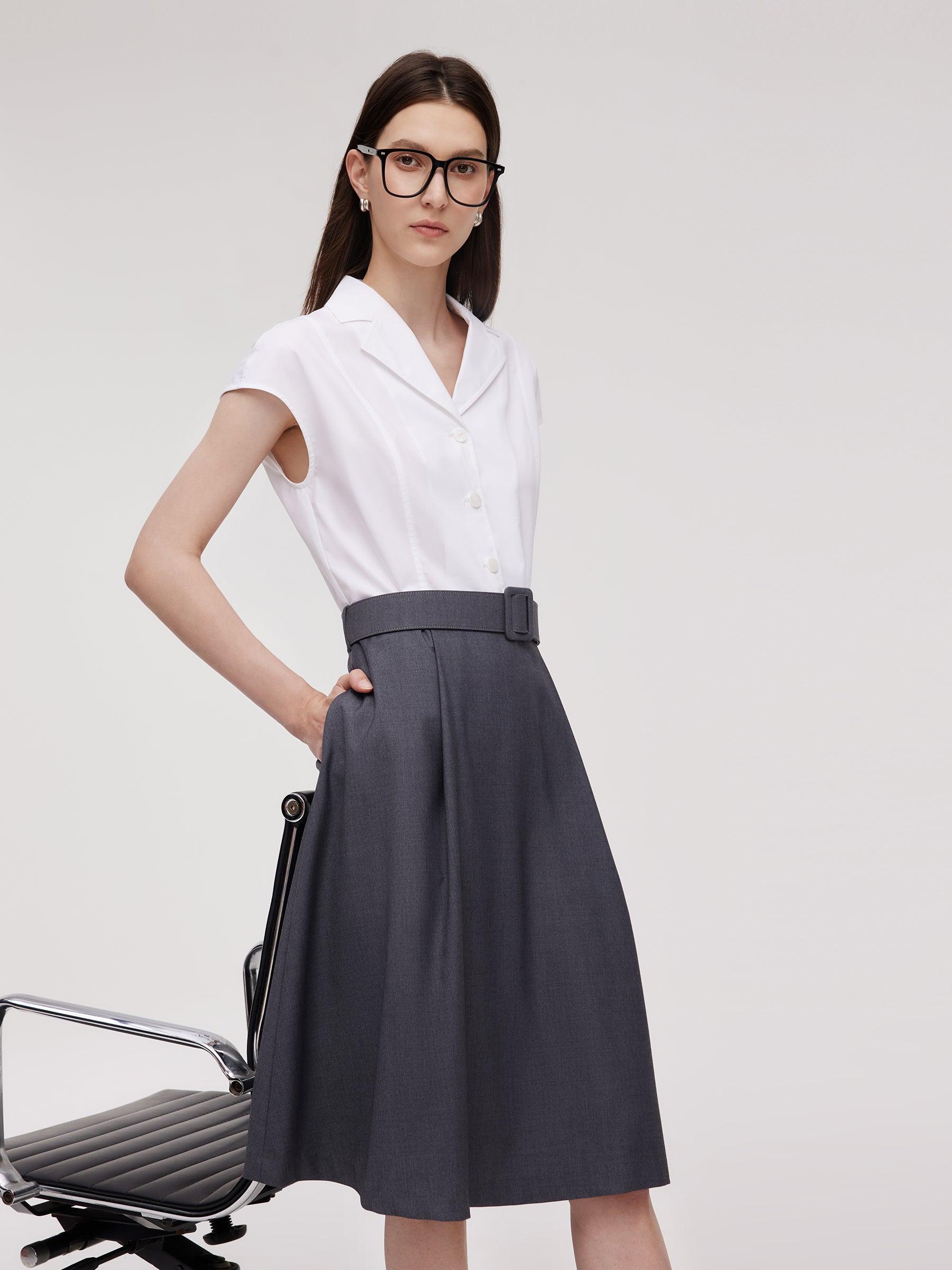 -Cotton blend stretchy fabric -With belt -Faux two-piece design Offered in chic white and grey hue, this midi dress marries elegance with practicality. The cinched waist accentuates your figure, while the A-line skirt adds a touch of feminine grace. The small cap sleeves offer a versatile touch, perfect for both formal