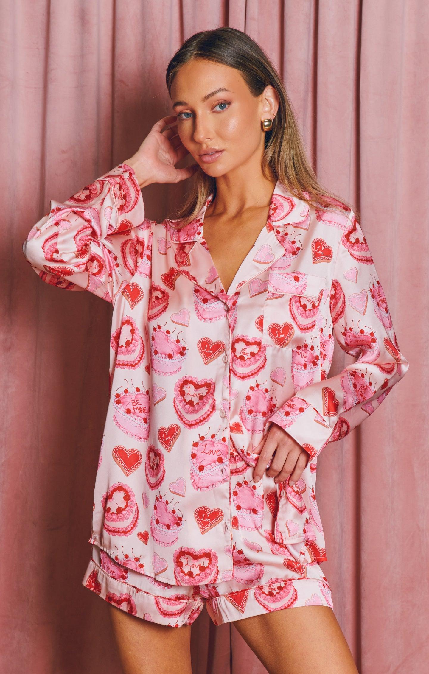 Love's in the air with our favorite pj set! You'll want to wake up every morning in this silky soft outfit! We paired drawstring waist shorts with a long sleeve button up blouse in our Icing On The Cake print.