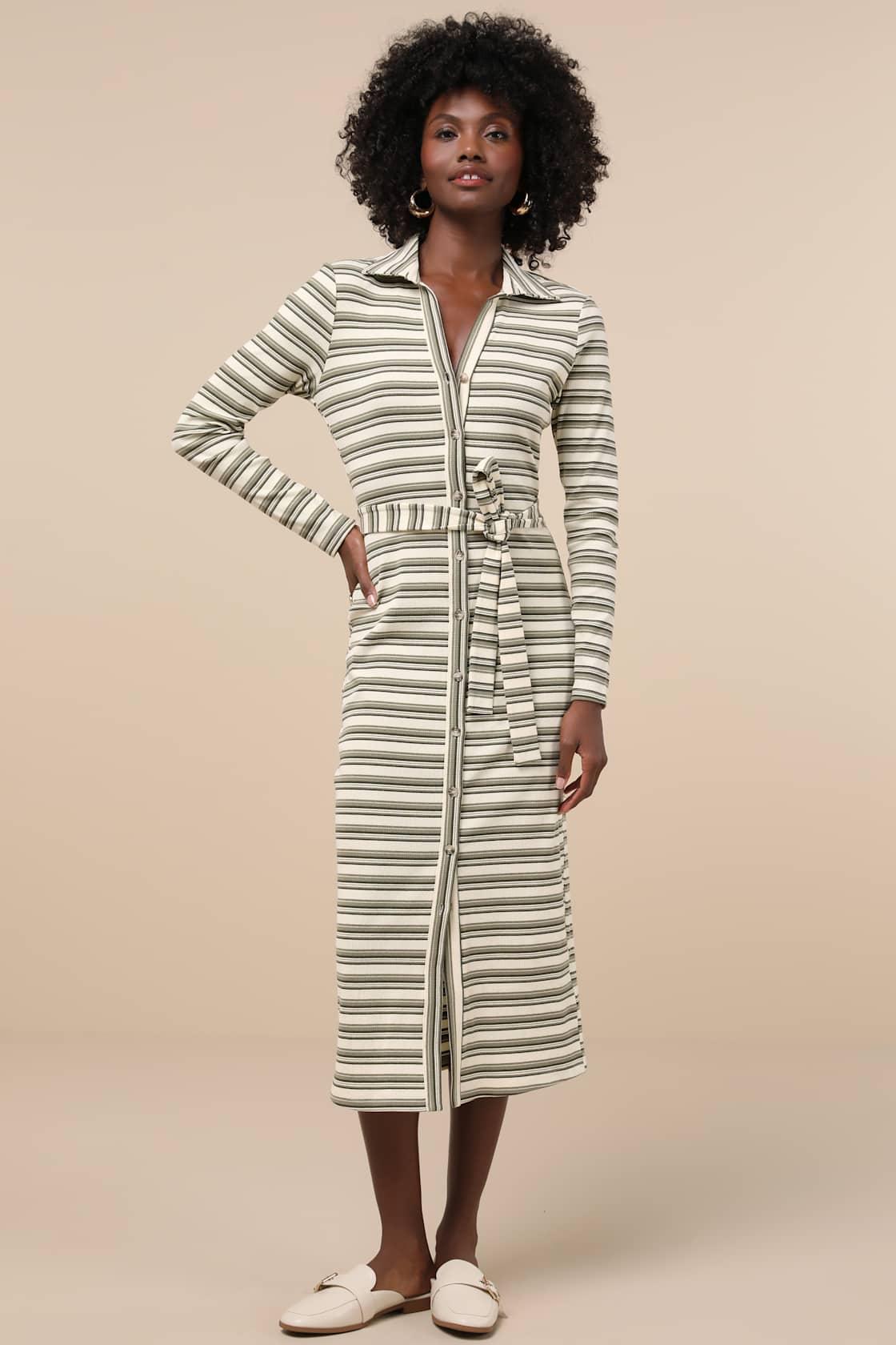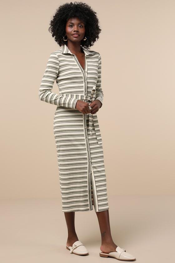 Styling the Lulus Favorite Potential Ivory and Olive Striped Ribbed Midi Dress is about to become a weekly treat! An ivory and olive green striped pattern accents stretchy ribbed knit as it shapes this effortless dress with a collared neckline framed by long sleeves. A functional button placket accents the figure-fitting bodice and continues through the sash-belted waist down to the chic midi hem. Elevate the look with your favorite gold jewelry!