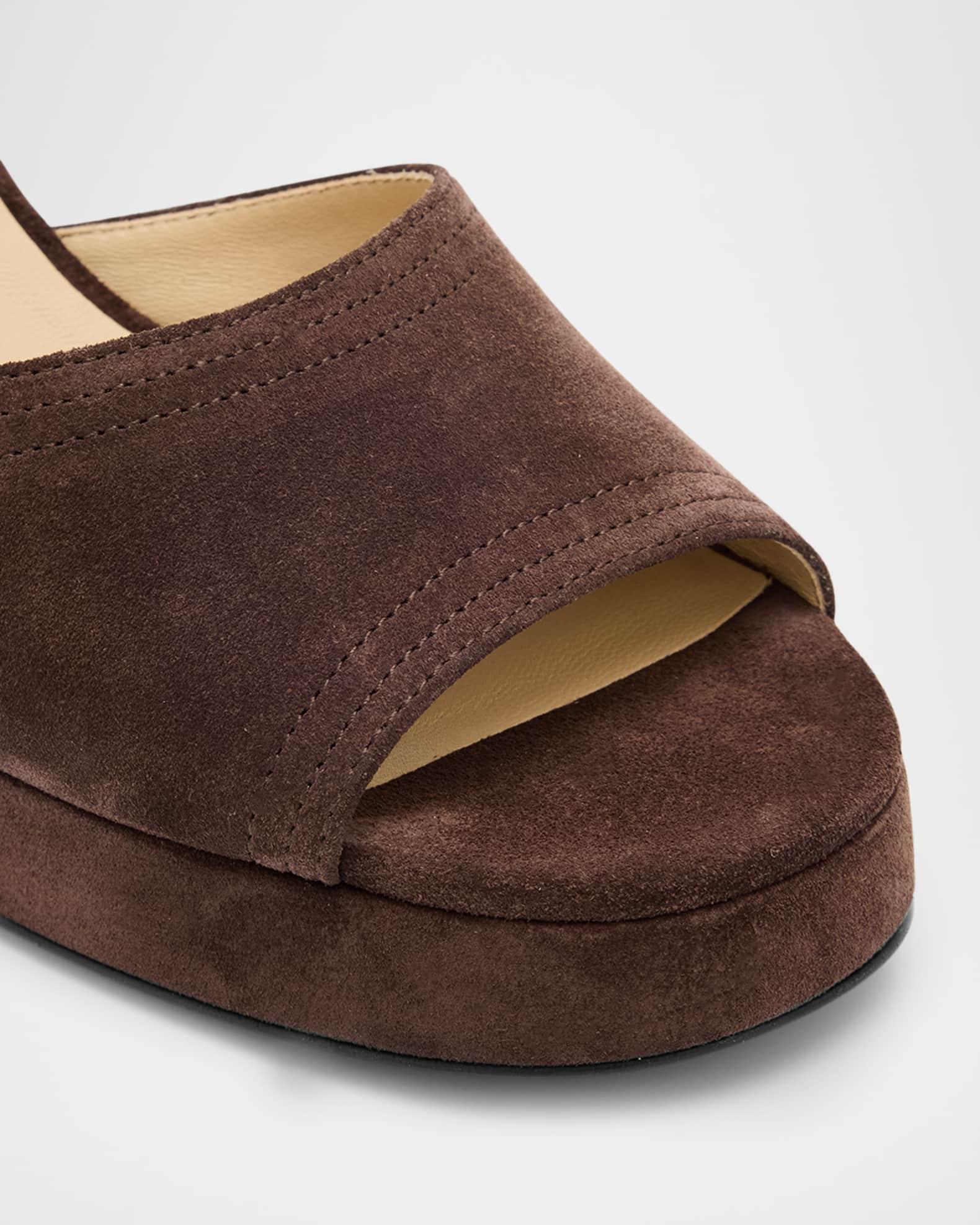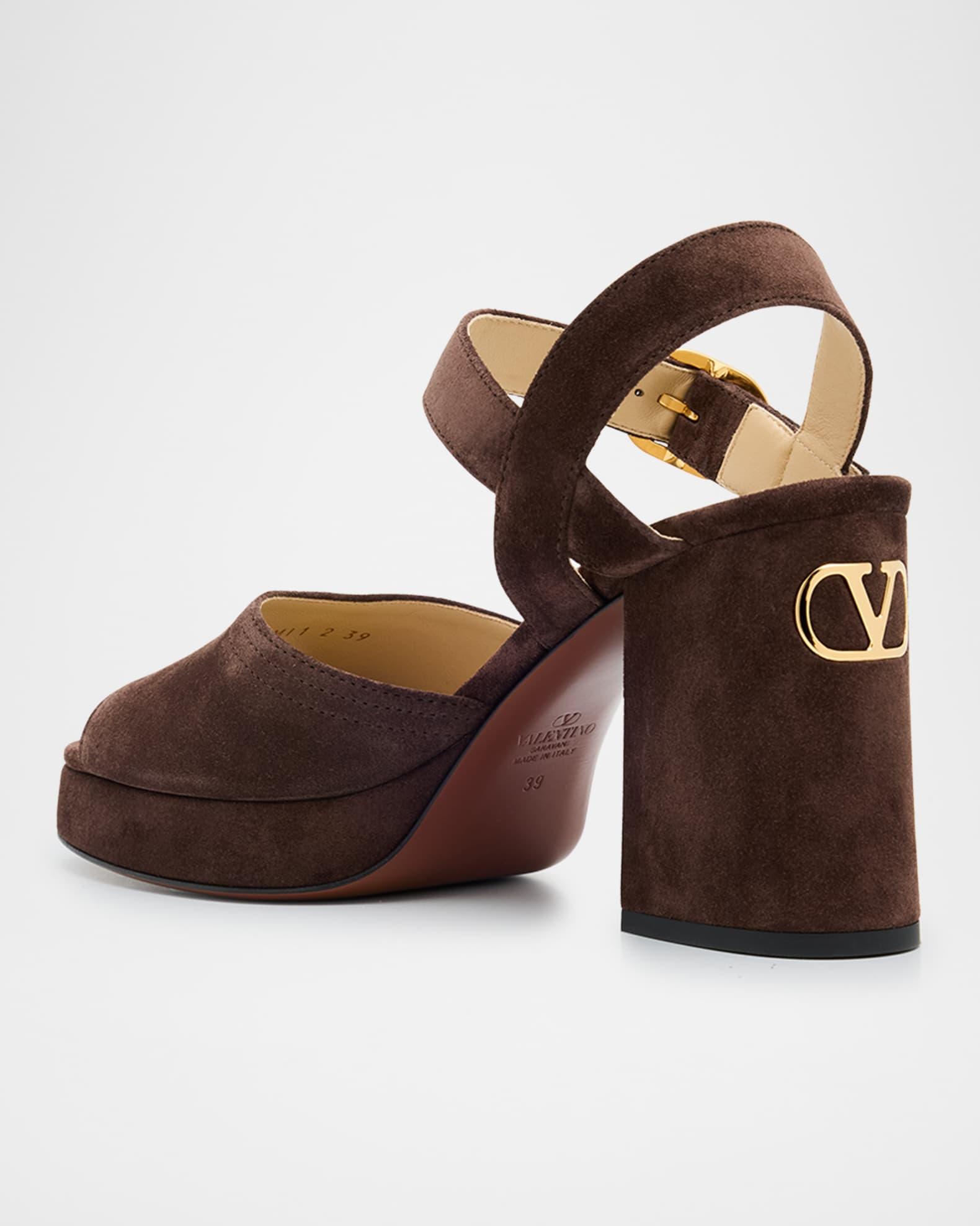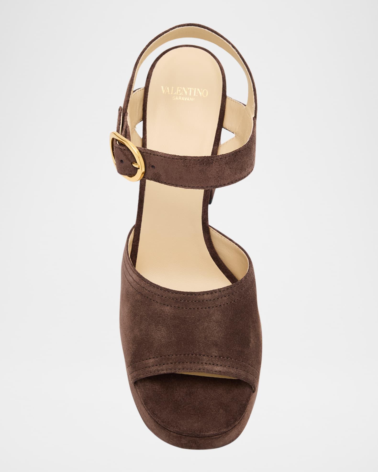 Valentino Garavani "Fawcette" calf suede platform sandals with V logo medallion accent 4.00 in / 100 mm covered block heel Open toe Single vamp strap with topstitching Adjustable ankle strap Leather outsole Lining: Leather Made in Italy