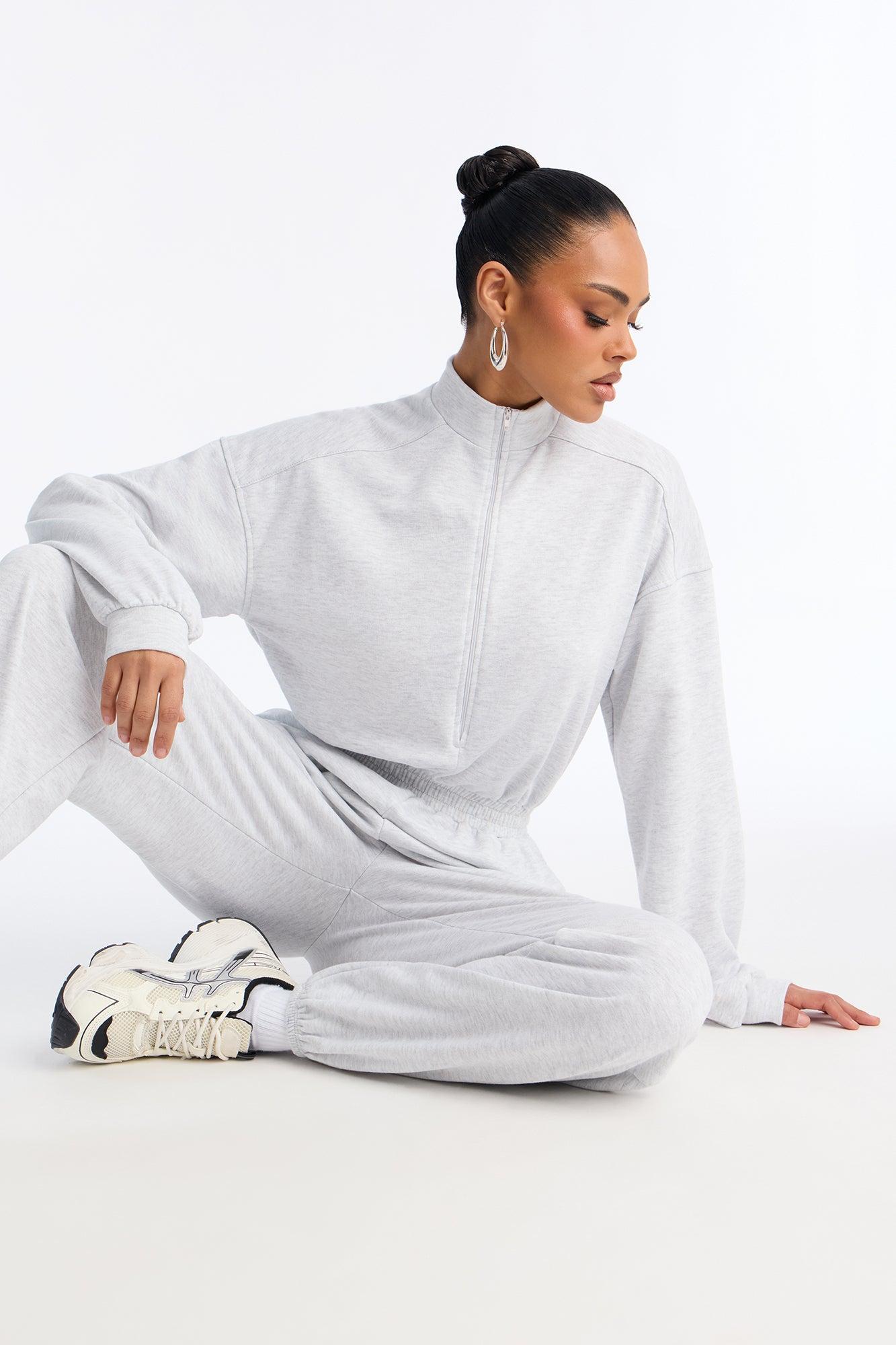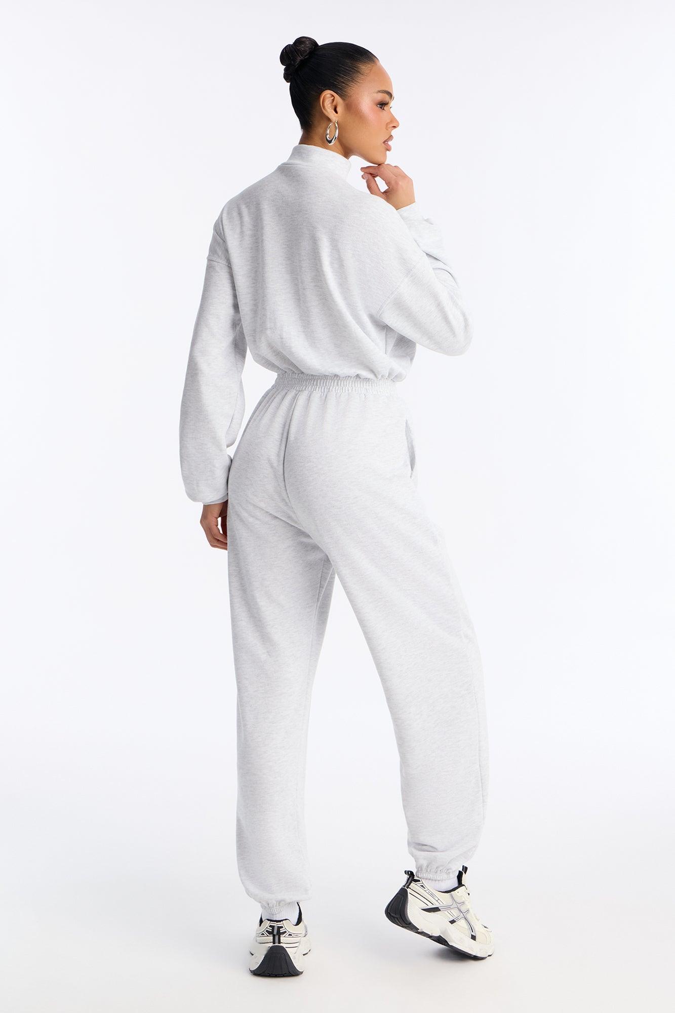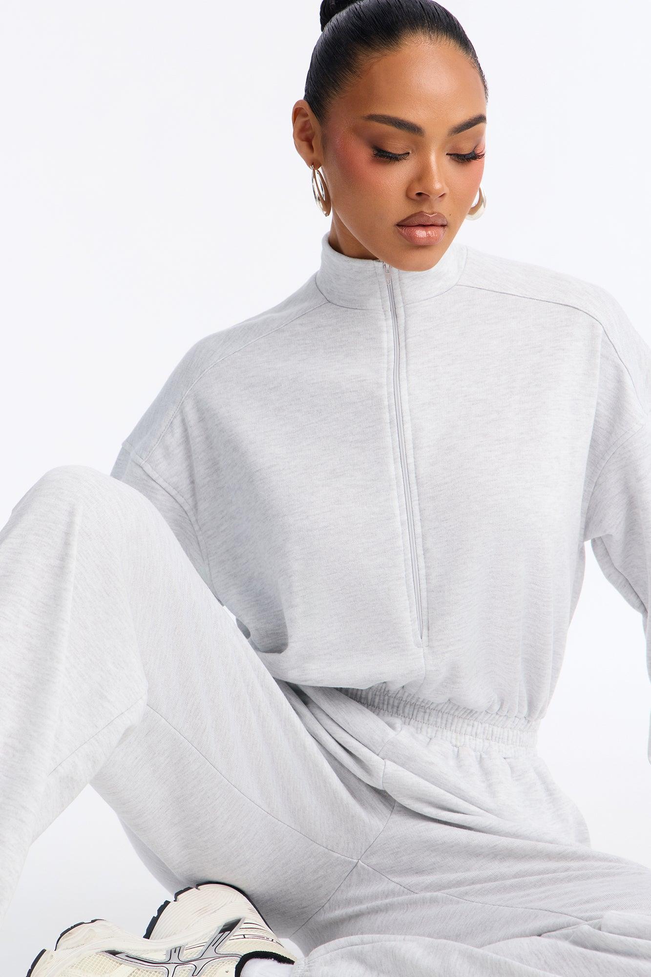 Available In Heather Grey. Jumpsuit Stretch Long Sleeve Mock Neck Jogger Leg Zipper Front Top Closure Elastic Waistband Pockets 30" Inseam 70% Polyester 30% Cotton Imported California Proposition 65WARNING: Cancer and Reproductive Harm - www.P65Warnings.ca.gov.