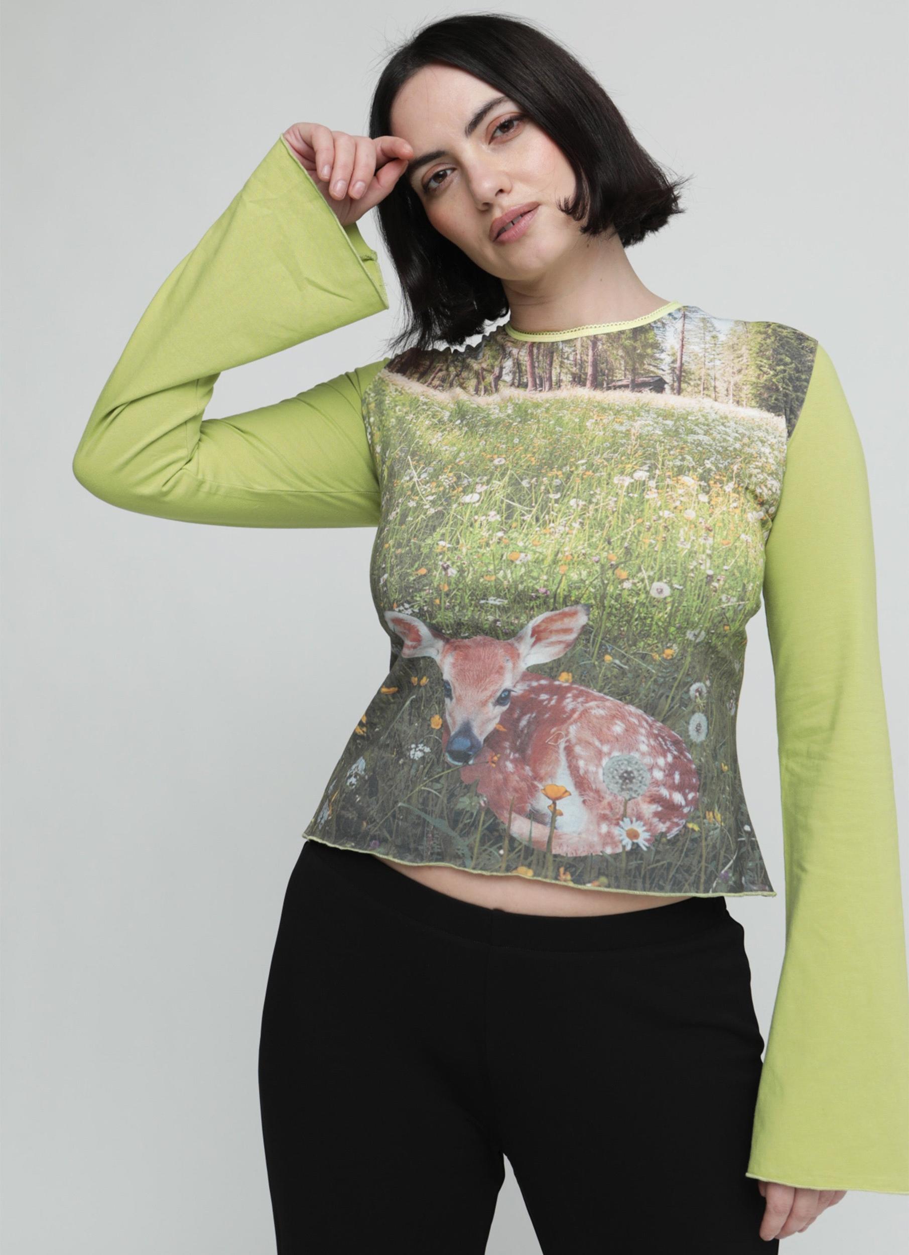 Our Fawn Long sleeve could not be more perfect for the chillier weather. The print features an adorable fawn sitting in a grassy landscape, the sleeves are a similar green shade and the yellow collar was made to match the fun flowers in the print! Your order will ship in 4-5 weeks!