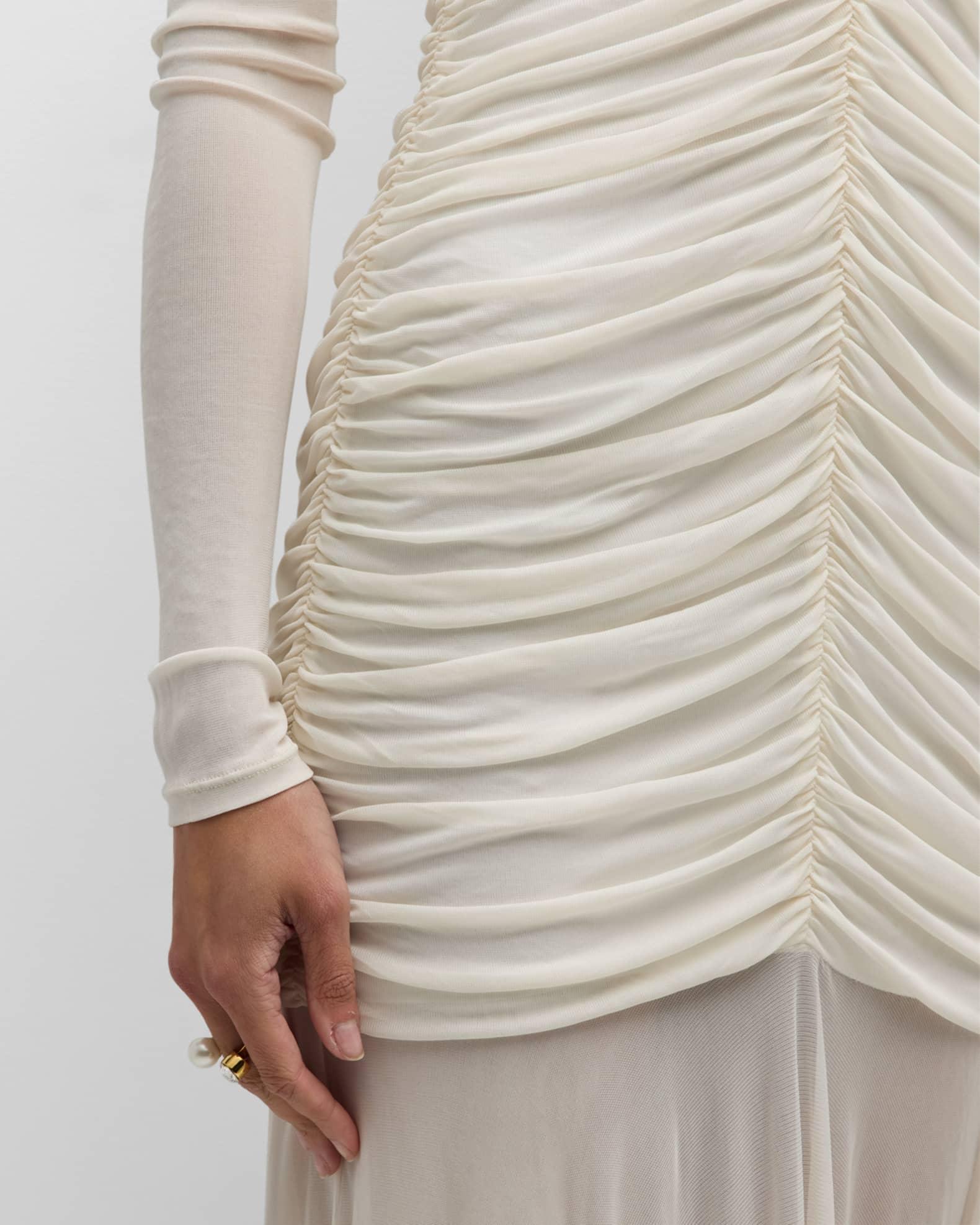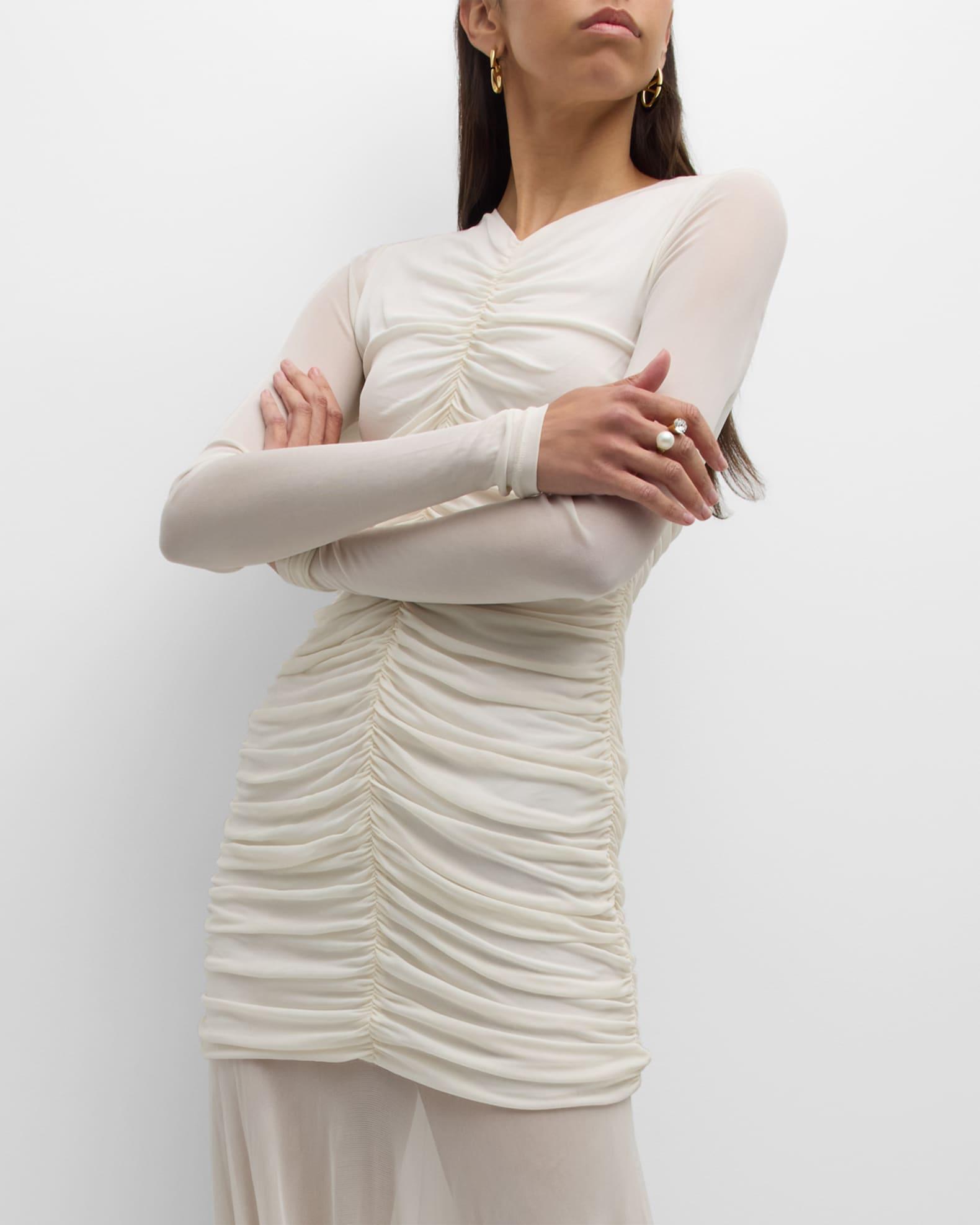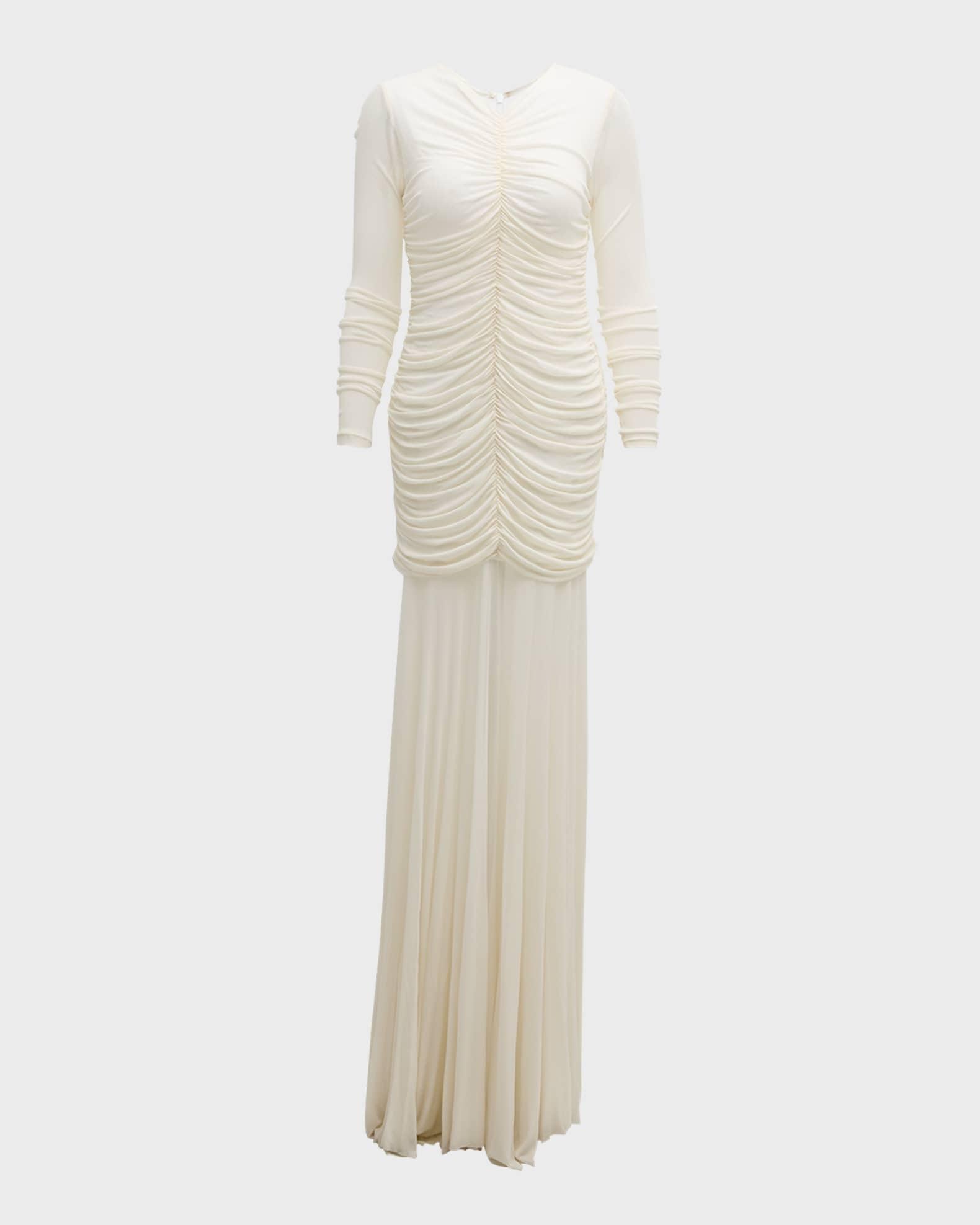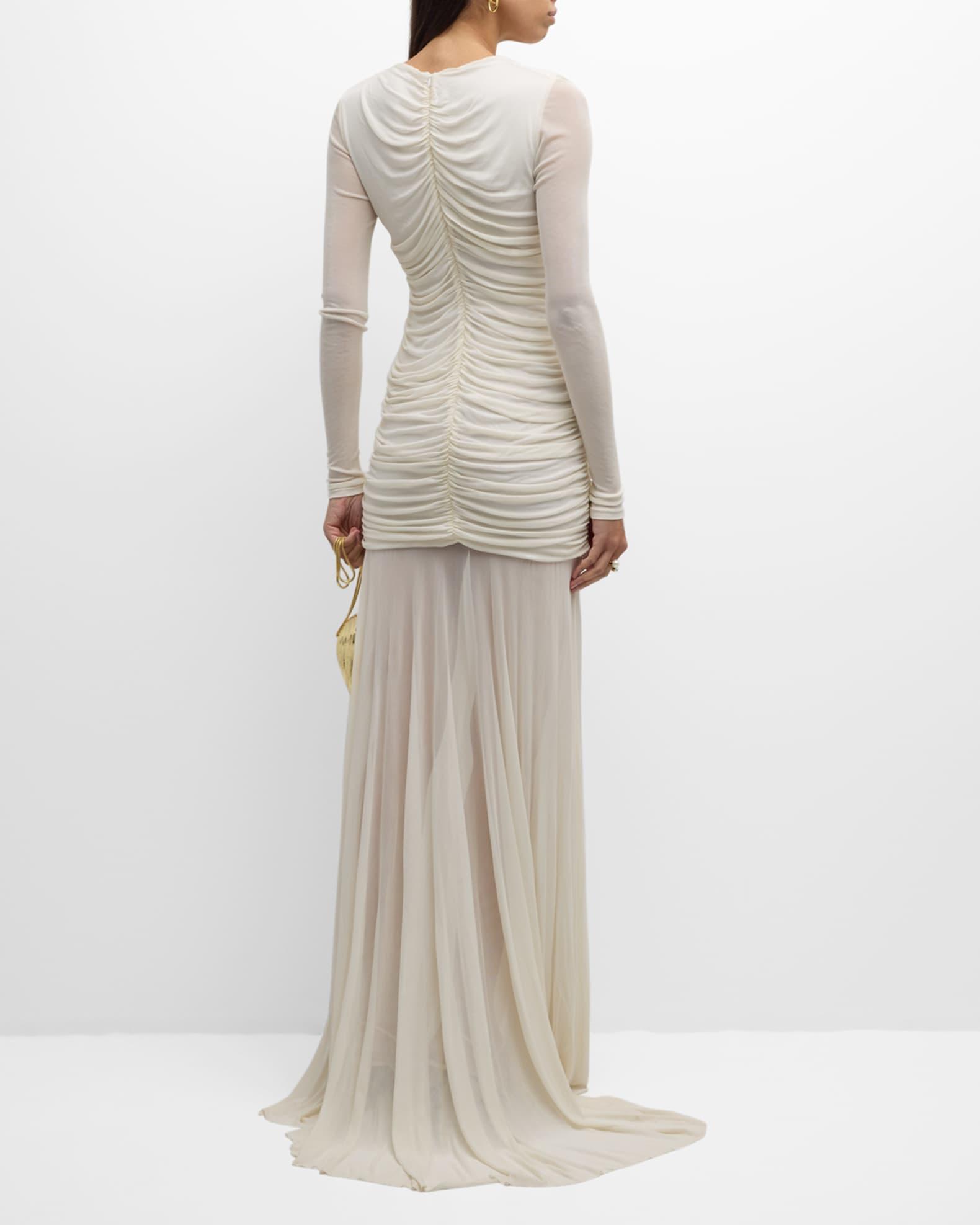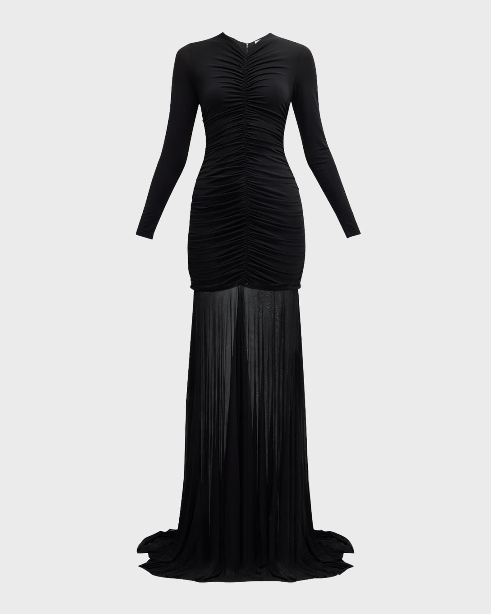 A.L.C. "Fawn" ruched gown with semi-sheer skirt Approx. 59"L from shoulders to hem V neckline Long sleeves Floor-sweeping hem Column silhouette Invisible back zipper Rayon/cellulose acetate/viscose/polyester Dry clean Imported Model is 5'10"/177cm. Size Note: Item runs small, consider ordering a size up.