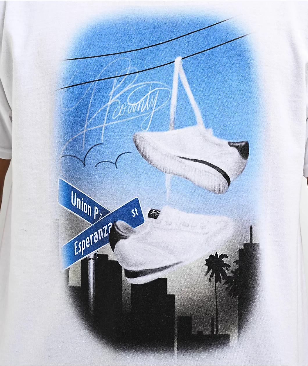 FB County introduces the white Shoes t-shirt for casual streetwear style. Airbrush style art is displayed on the tee's chest showcasing a pair of white shoes strung over a wire, with a backdrop inspired by LA's Esperanza Street. FB county is written