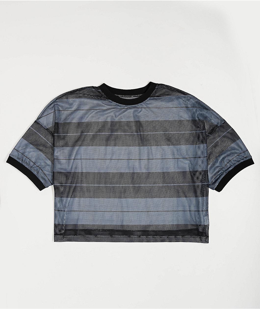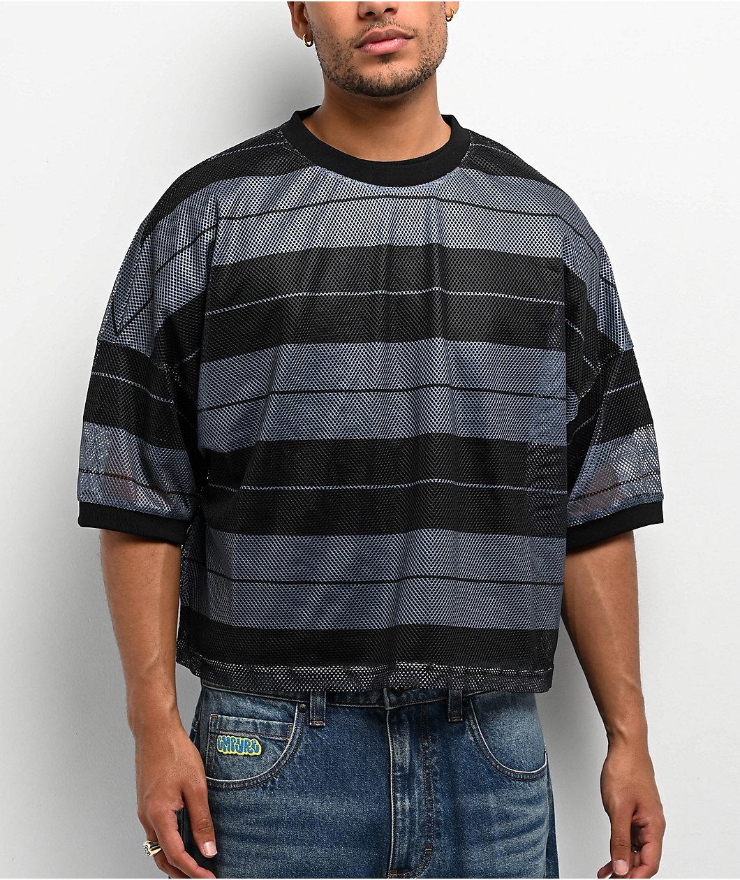 The Charlie Brown shirt from FB County is reimagined as a football jersey in a black polyester build with a horizontal stripe pattern throughout. Cropped and boxy, the breathable fashion-forward short sleeve employs a mesh semi-translucent look that'