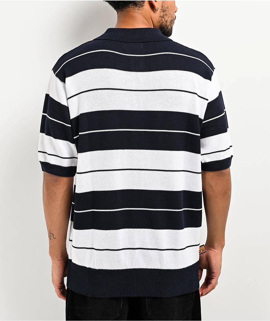 From streetwear label FB County, the Charlie Brown polo shirt features a navy blue design - with chunky white striping throughout. The knit polo has a loose silhouette, with a classic button-up collar and custom branded hardware. Featuring a minimally bra
