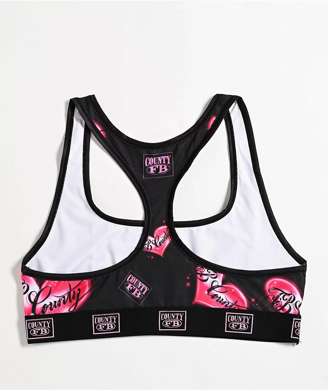 Enjoy superior comfort and style in the Heart Print sports bra from FB County. The black racerback bra features pink box logo and airbrush-style heart branding throughout for a romantic streetwear look. An underbust band and lined front provide secur