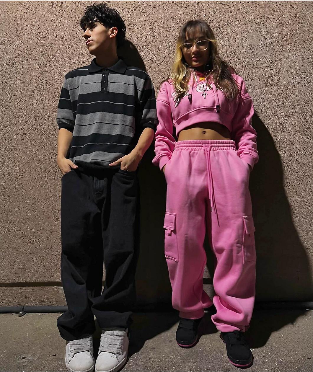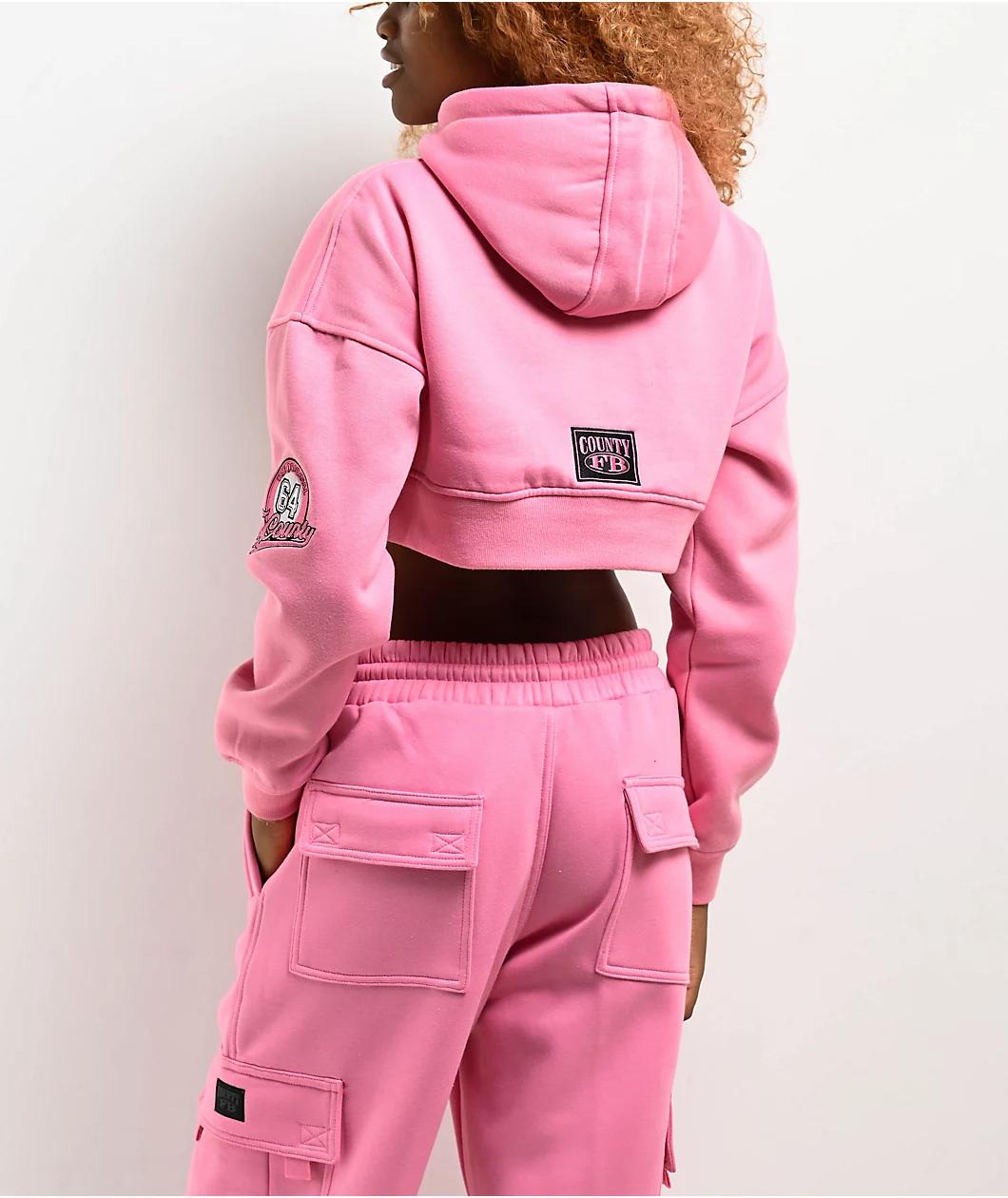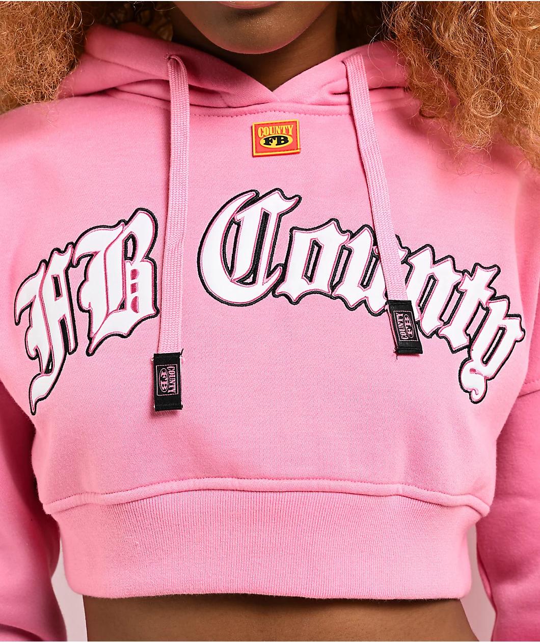 FB County's Old School crop hoodie lands in a bright pink colorway. Brand embroidery is featured throughout on the back, chest, and left sleeve. The largest graphic on the chest has FB County brand script in a black and white Old English font for a c
