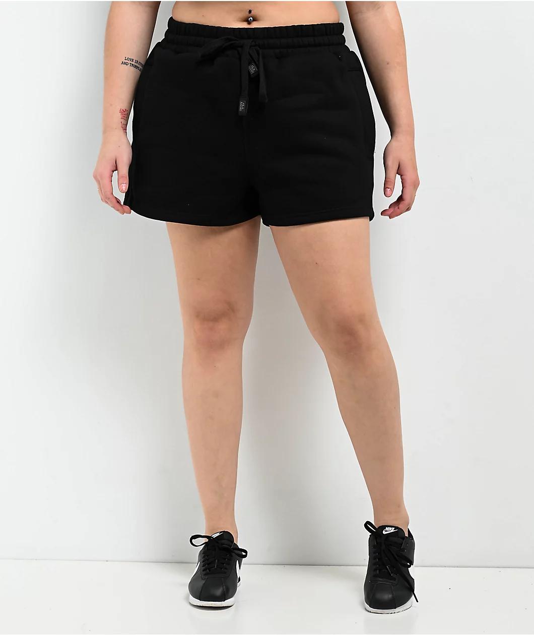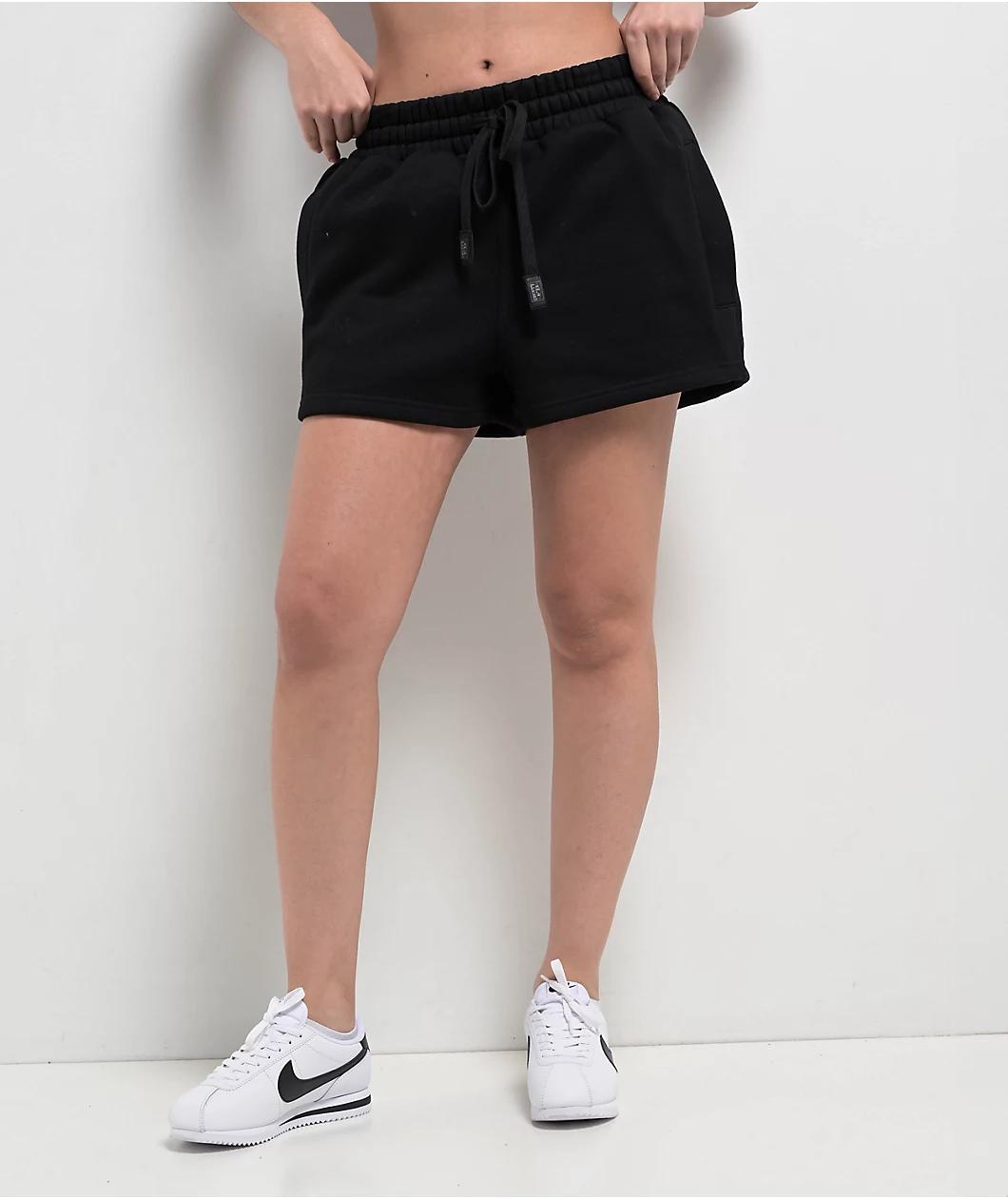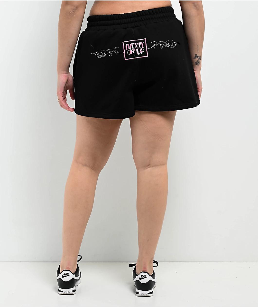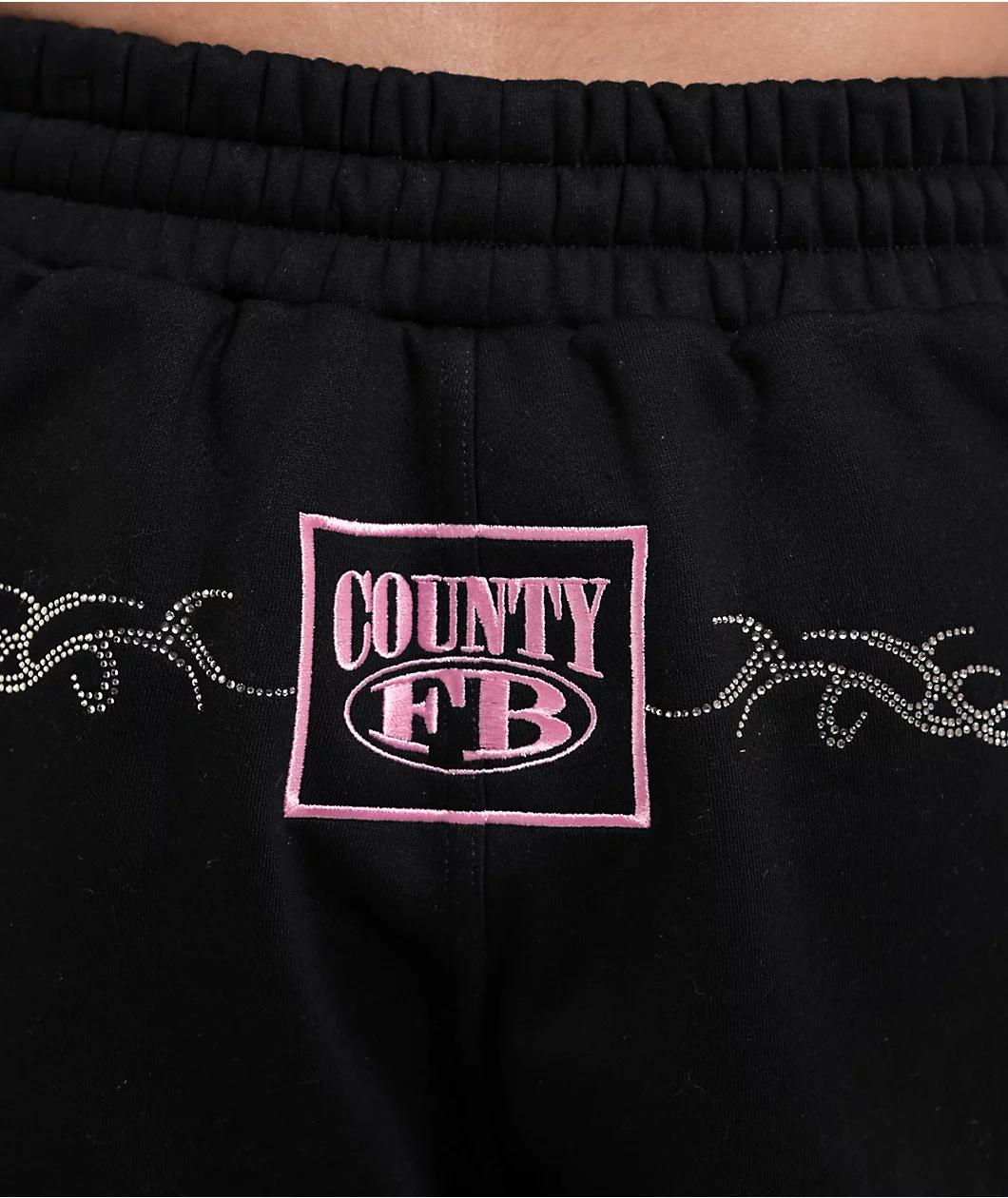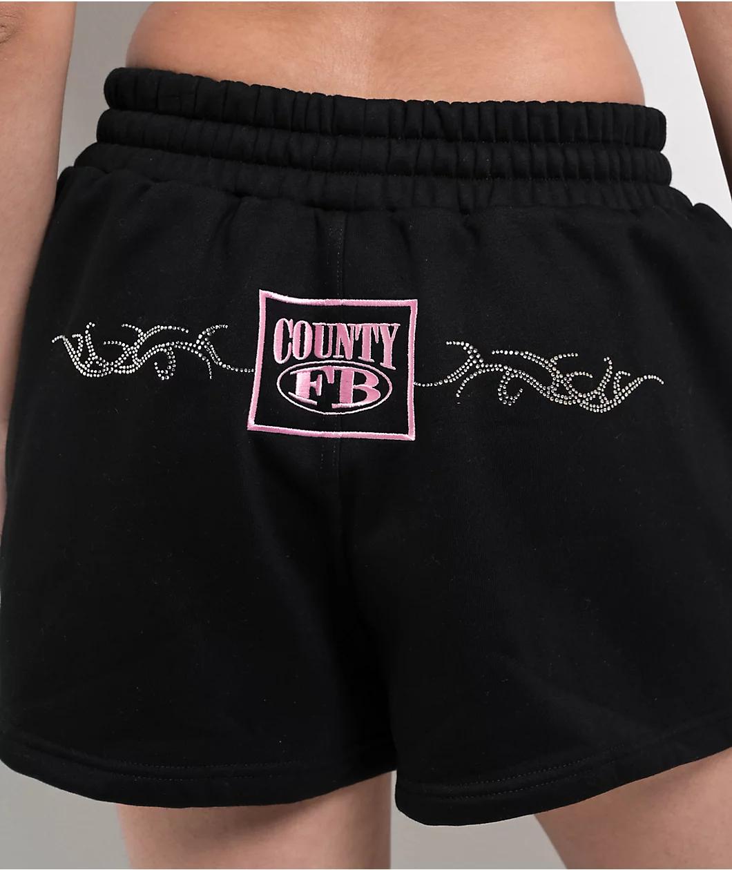Prepare to stay cozy with black sweat shorts from FB County, featuring embroidered branding and rhinestone designs on the back for a luxury loungewear look. Utilizing two roomy hand pockets for essentials, the comfy streetwear bottoms include a brand