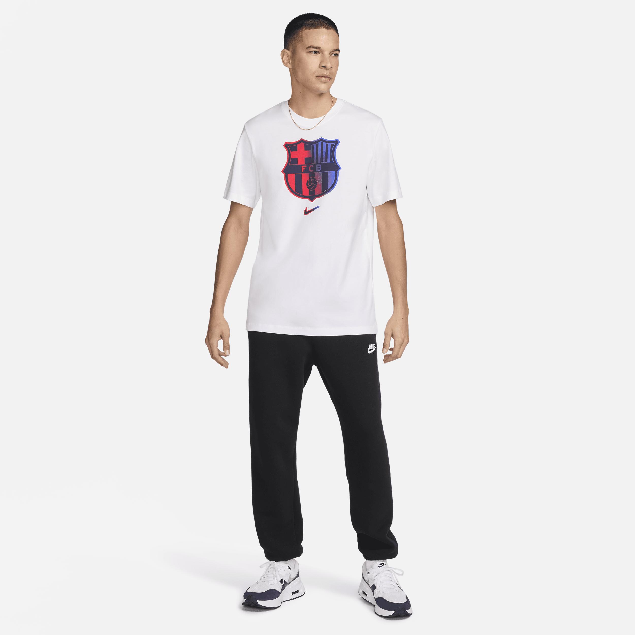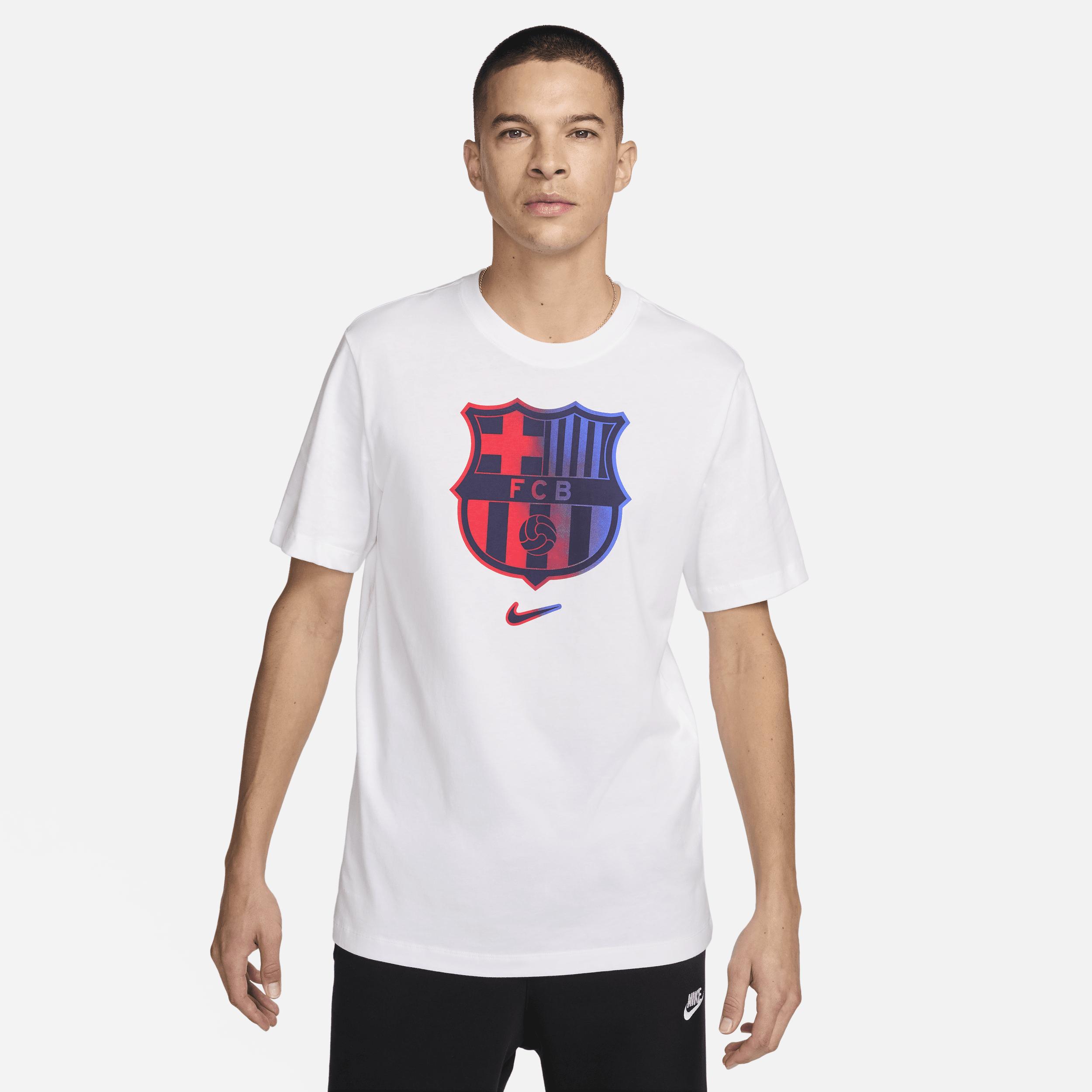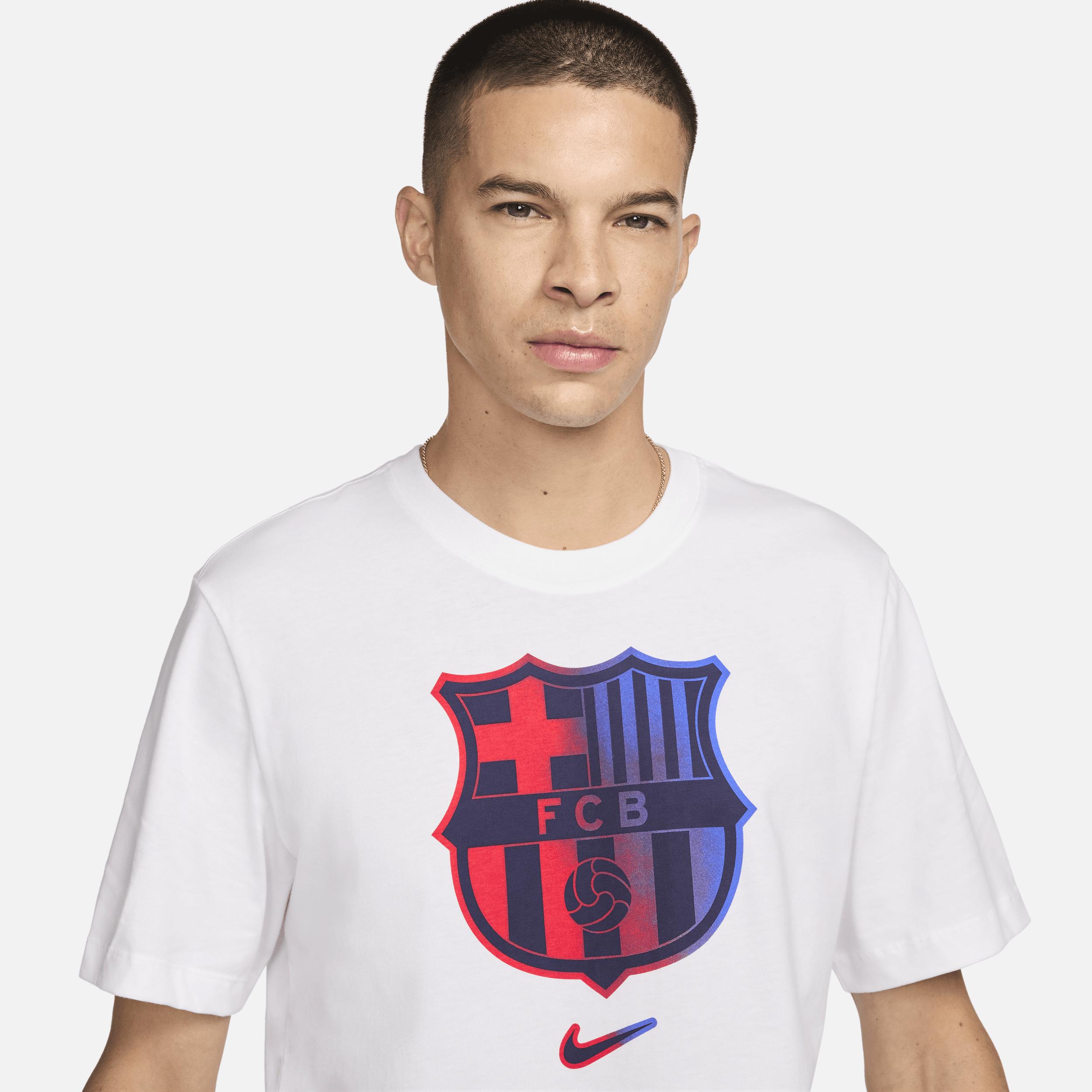 There's no mistaking your squad loyalty when you're wearing this soft cotton FC Barcelona tee. Product Details:100% cotton. Machine wash. Imported. Style: FV8566; Color: White; Size: L; Gender: Male; Age Group: Adult | FC Barcelona Men's Nike Soccer T-Shirt in White, Size: Large | FV8566-100