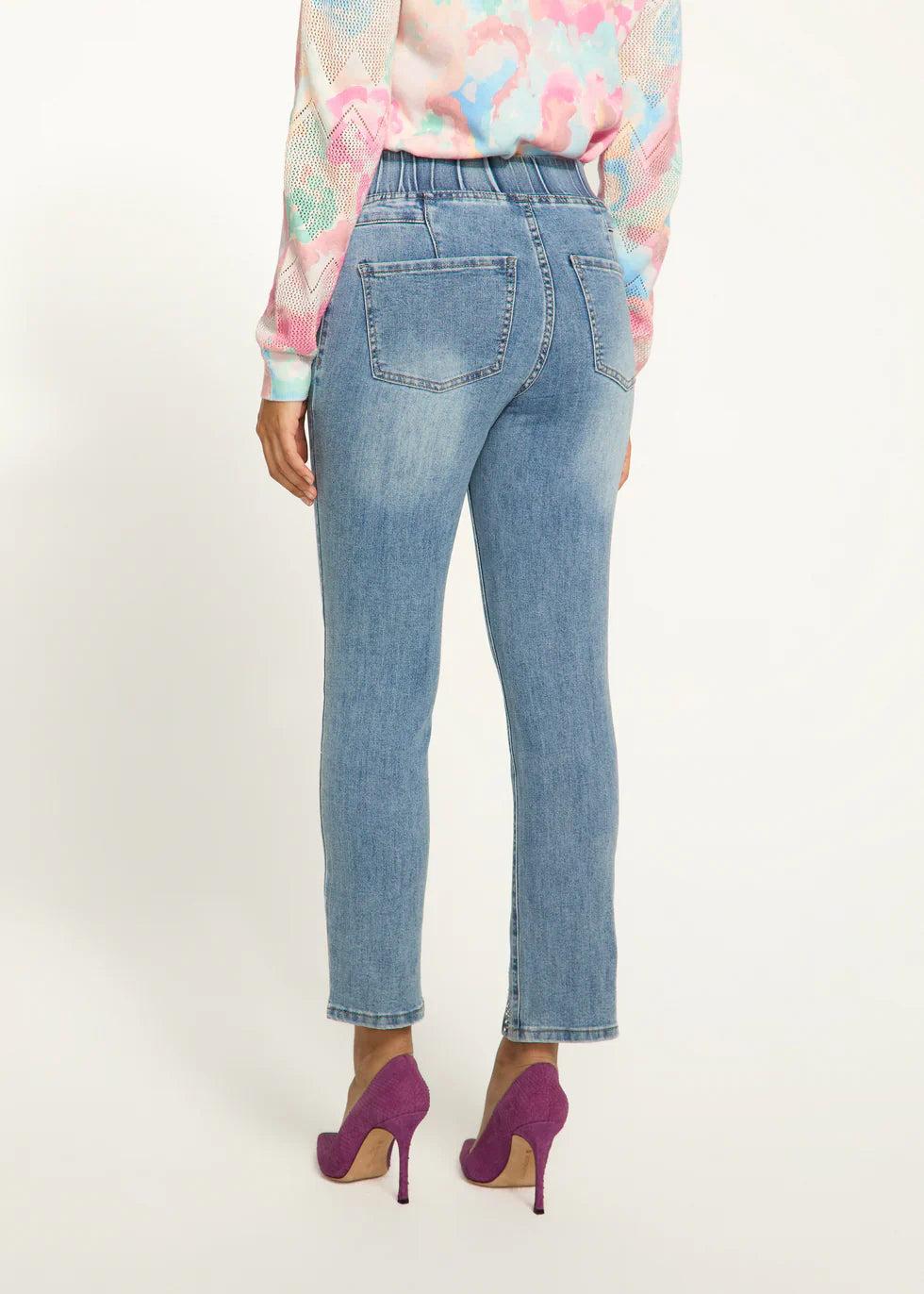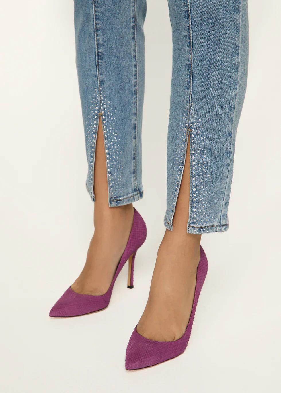 Sleek and modern, these ankle-length denim pants offer trendy front slits with sparkle detail for a chic finish. Just pull them on like leggings and off you go. They are a mid rise with a 28" inseam.