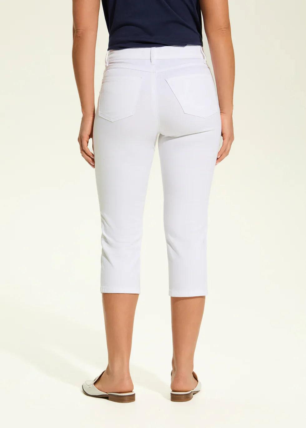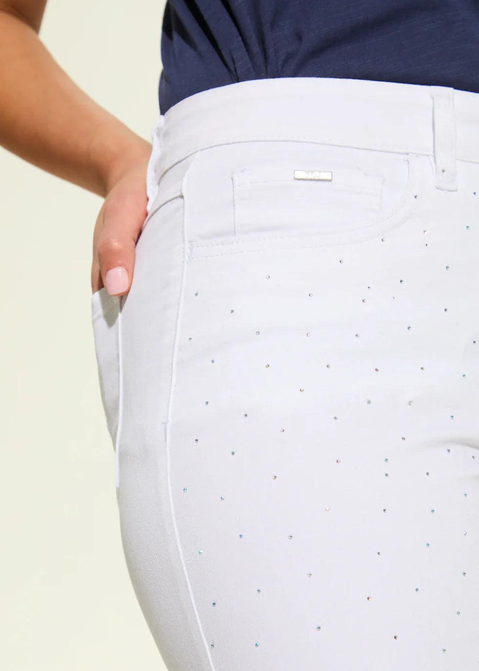 These white slim capris are a versatile wardrobe staple with added sparkle. With a 5-pocket design, zipper closure, and a mid rise with a 21" inch inseam.