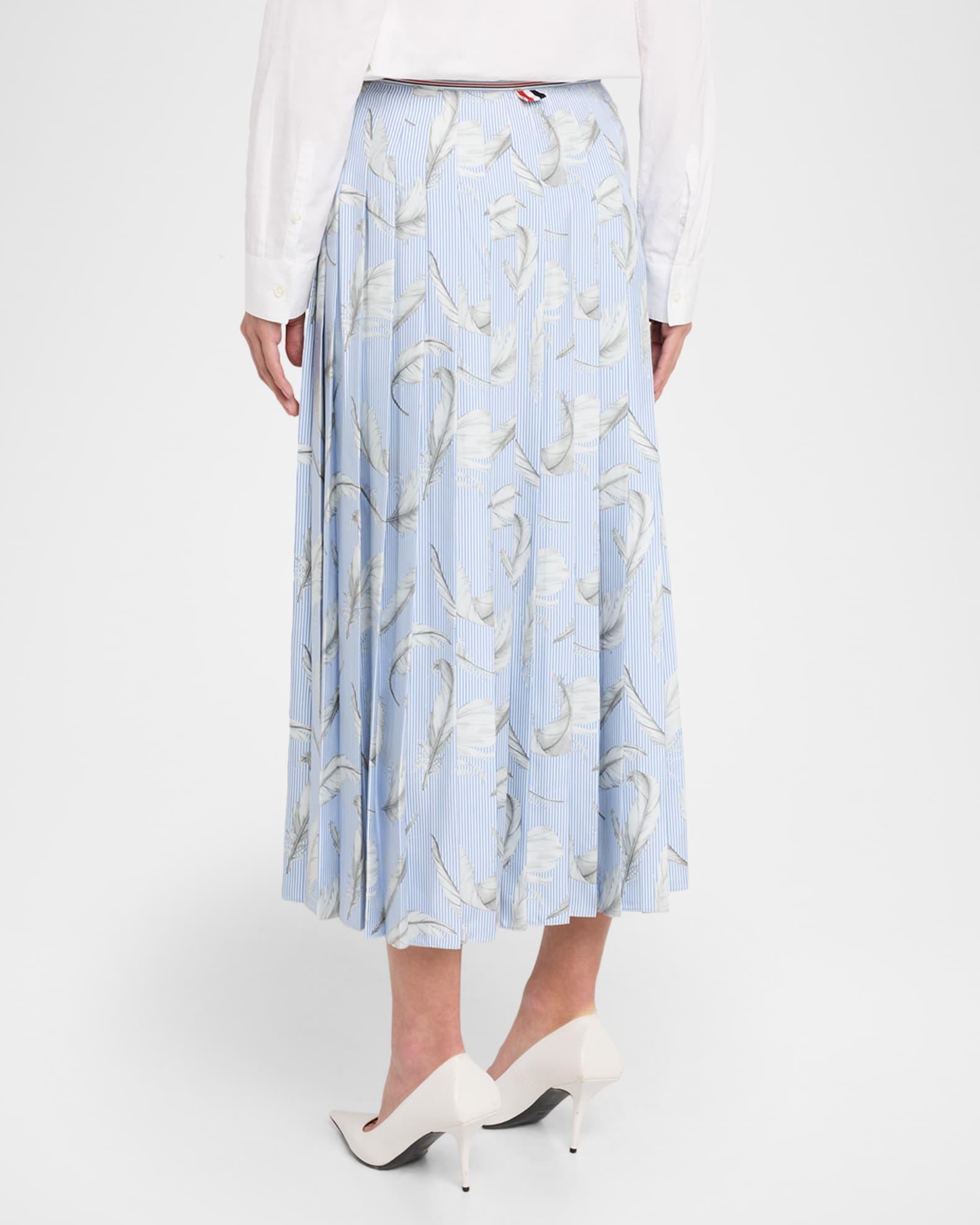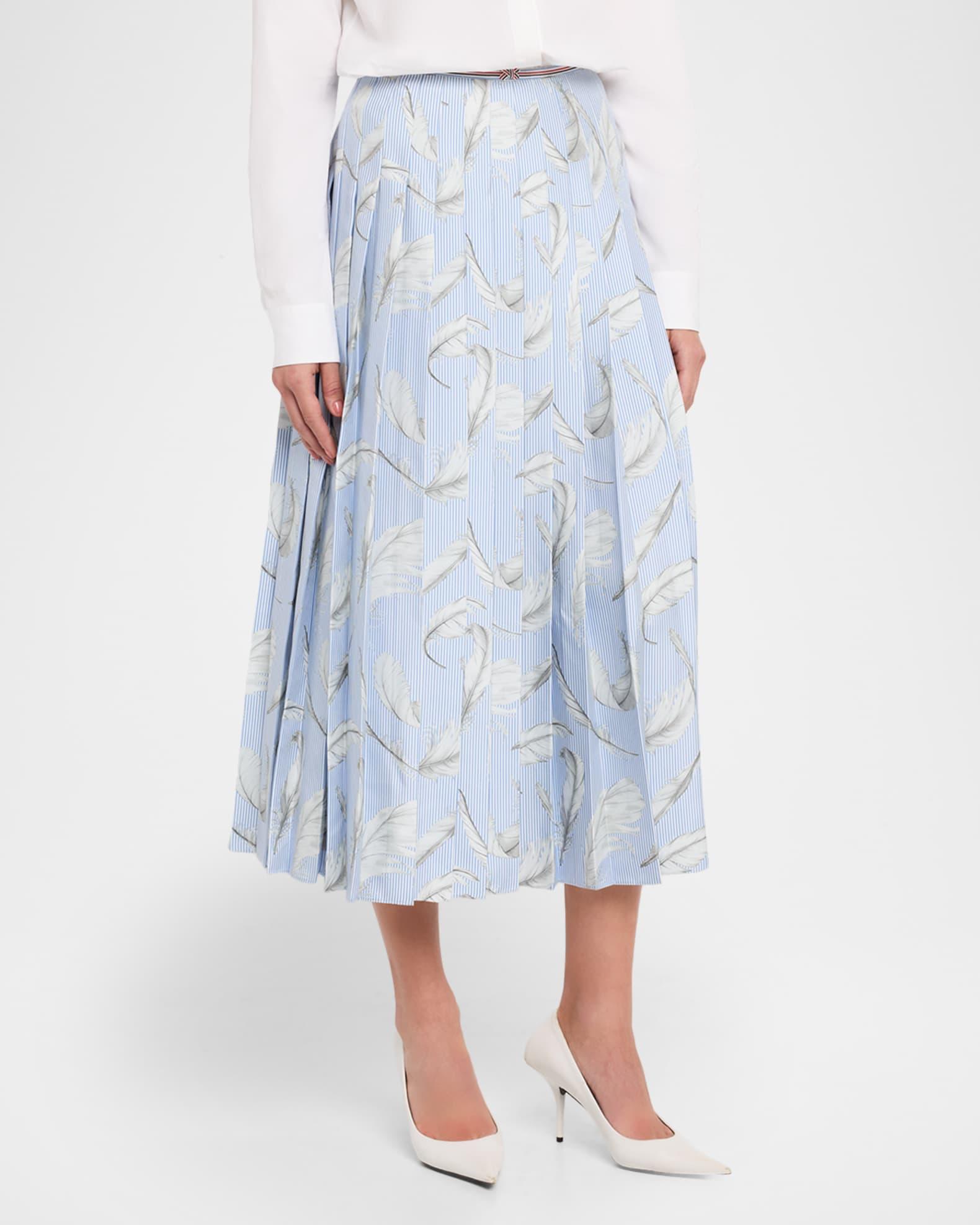 A study in contrasts, this silk twill Thom Browne midi skirt features sharp knife pleats overlaid with an ethereal feather print drifting across tailored pinstripes Signature striped grosgrain trim around the waist with a bowed front Sits at the natural waist Signature striped grosgrain loop-back tab Calf length A-line silhouette Silk Made in Italy