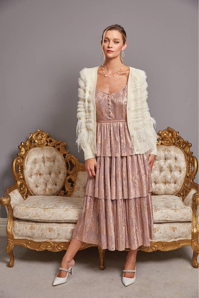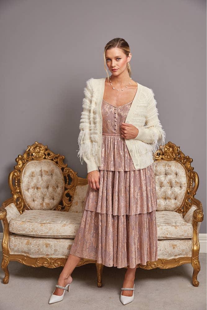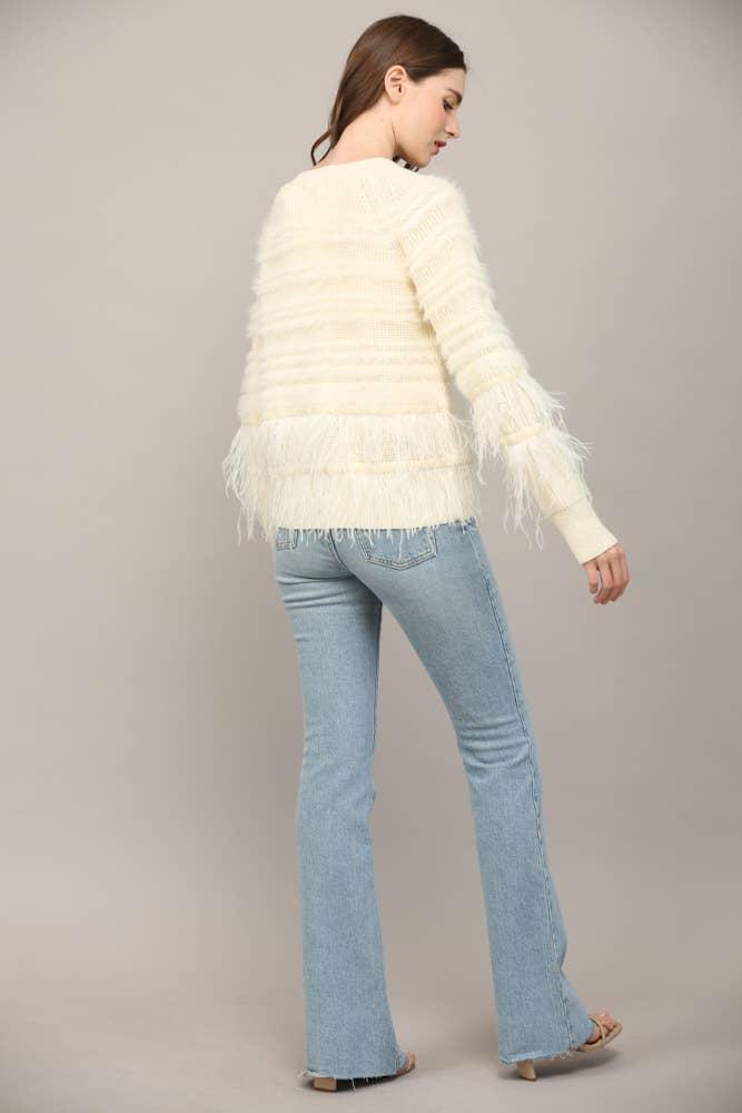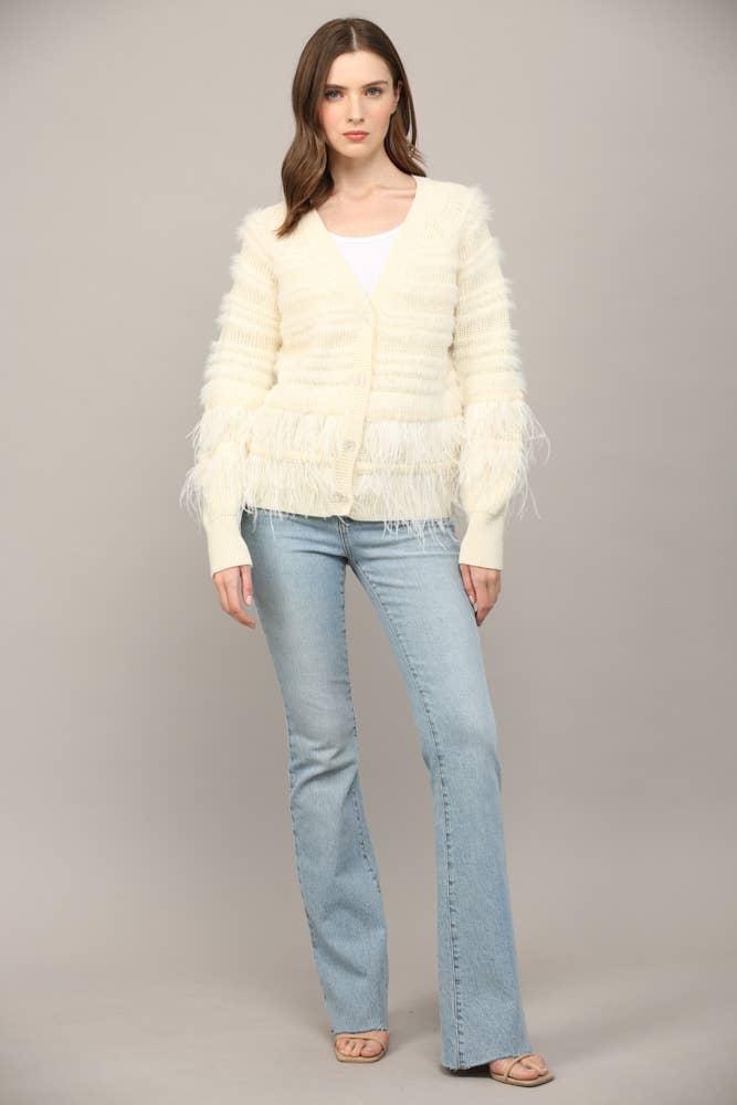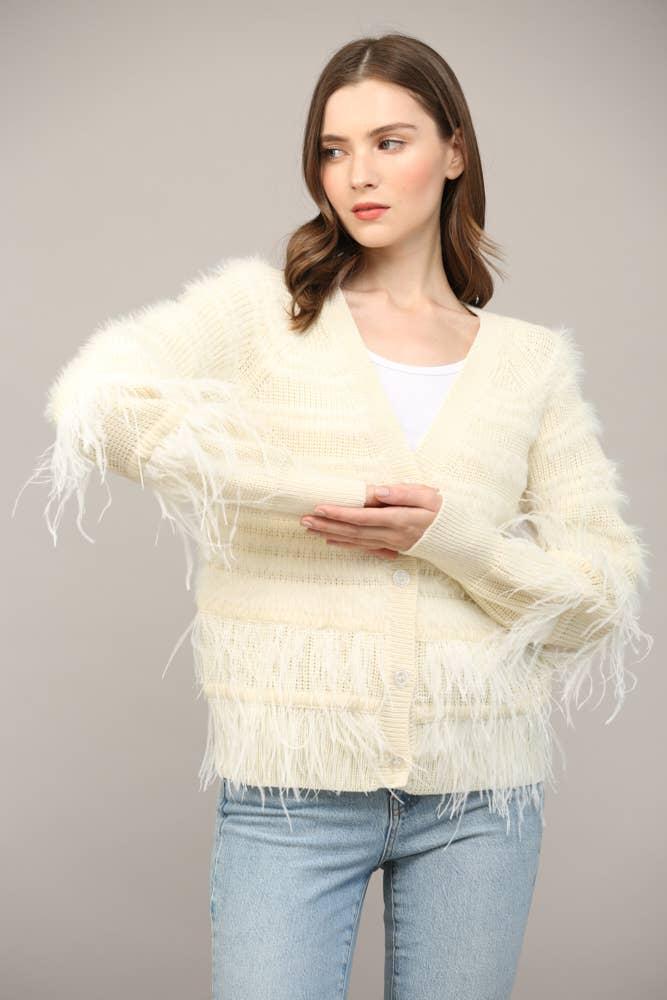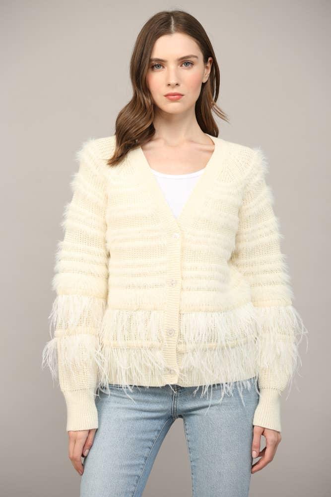 FEATHER TRIM WOOL BLEND CARDIGAN 50%ACRYLIC 30%WOOL 20%NYLON