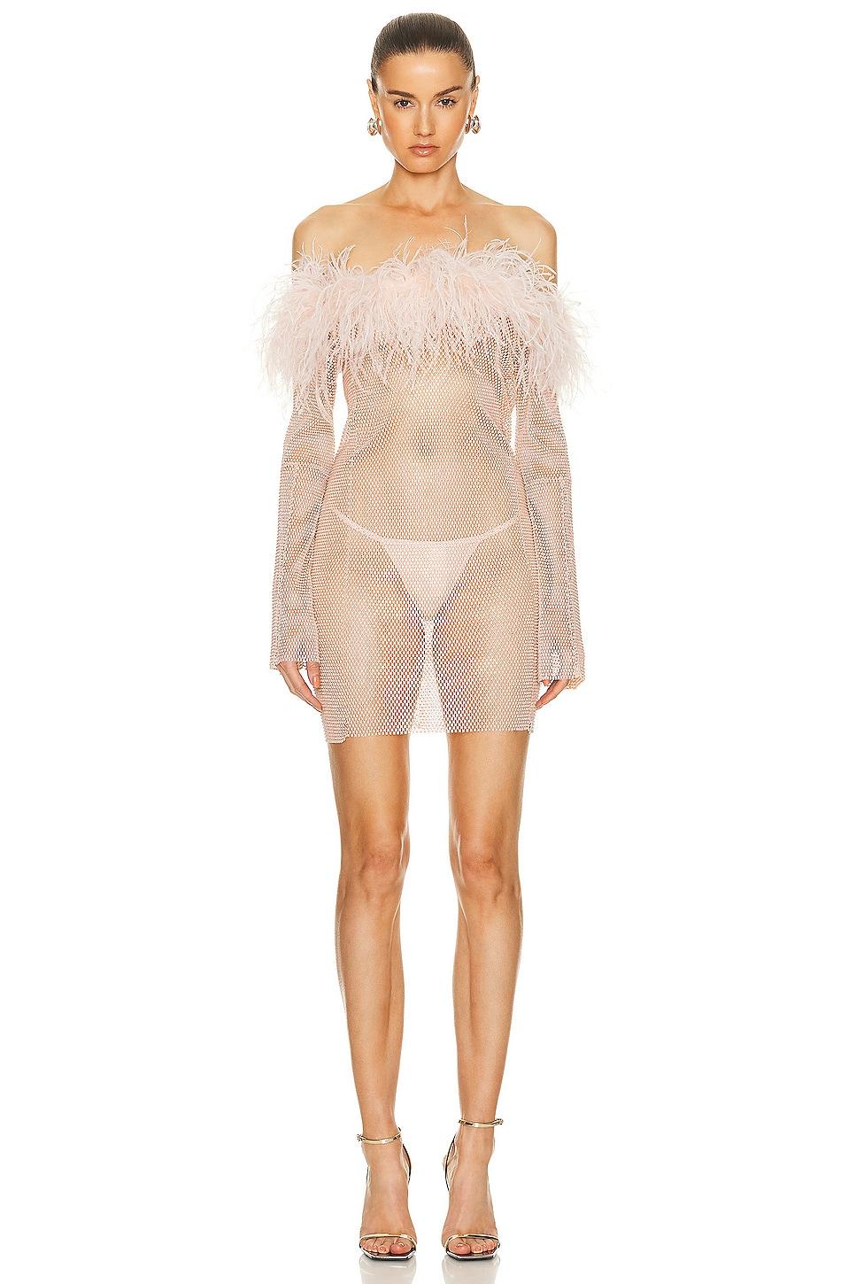 Santa Brands Feathers Mini Dress in Blush,Metallic Neutral Self: 50% rhinestone 30% polyester 20% cotton Contrast Fabric: 60% ostrich feathers 30% turkey feathers 10% polyester. Made in Ukraine. Hand wash. Unlined. Pull-on styling. Feather-embellished off-the-shoulder neckline. Crystal-embellished crochet knit fabric. Garment is intentionally sheer, undergarments will show through. Please note undergarment not included. SBRF-WD20. SB_FW_MDF_BL. About the designer: