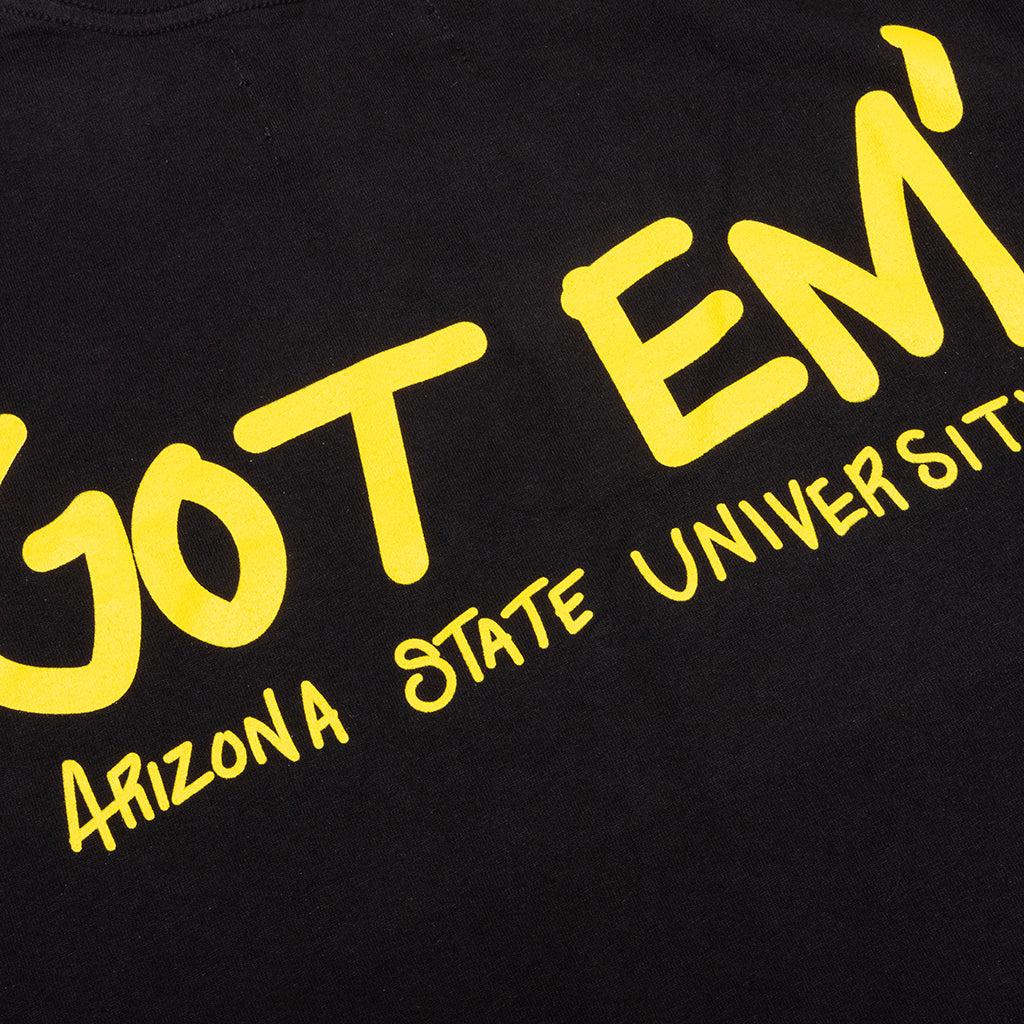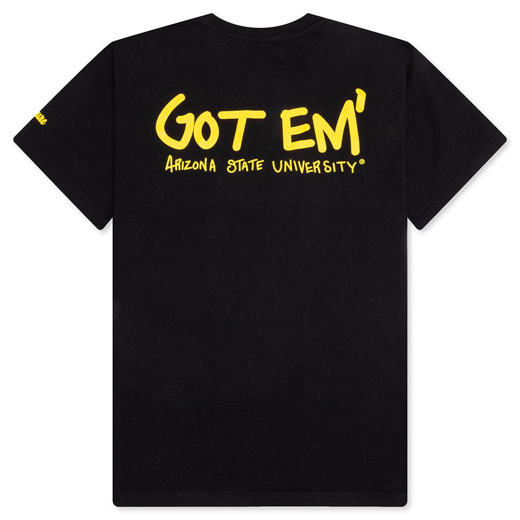 In our latest FEATURE x Arizona State University graphics capsule, we introduce the GotEm Tee. Composed of 100% cotton, this design has a crew neckline with ribbed trims and a boxy fit. The look is highlighted by the screen-printed Sun Devil motif at the front and the 'Feature' logo on the sleeve. The 'Got Em' graphic at the back completes the look. 100% Cotton Exclusive to FEATURE Crew neckline Ribbed trims Screen-printed graphics Sun Devil motif Style No: F040123X03BK