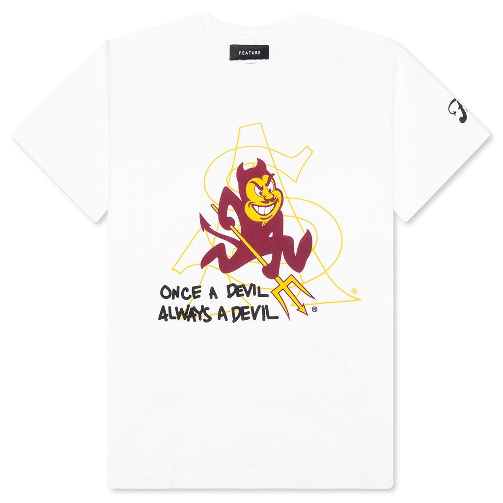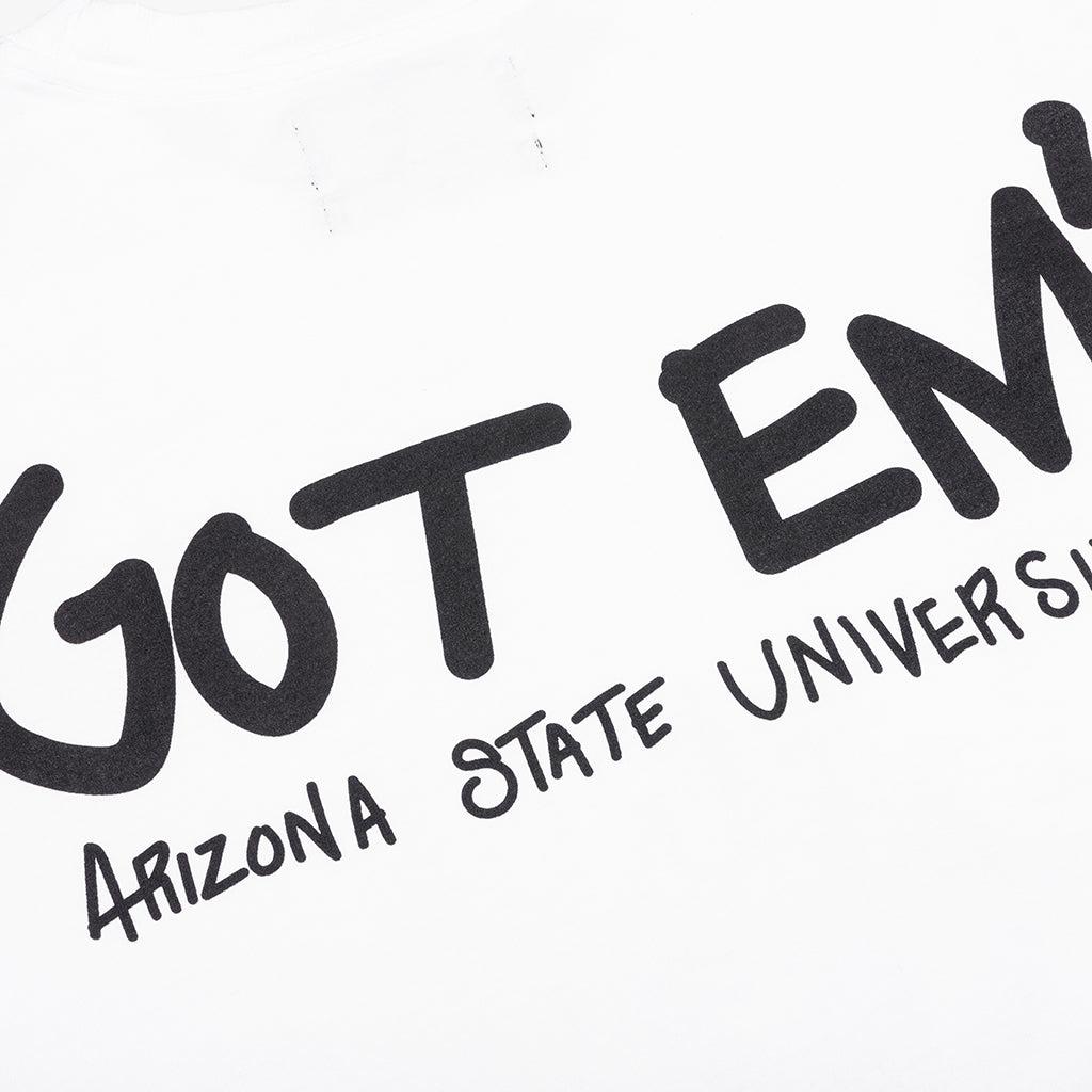 In our latest FEATURE x Arizona State University graphics capsule, we introduce the GotEm Tee. Composed of 100% cotton, this design has a crew neckline with ribbed trims and a boxy fit. The look is highlighted by the screen-printed Sun Devil motif at the front and the 'Feature' logo on the sleeve. The 'Got Em' graphic at the back completes the look. 100% Cotton Exclusive to FEATURE Crew neckline Ribbed trims Screen-printed graphics Sun Devil motif Style No: F040123X03WH