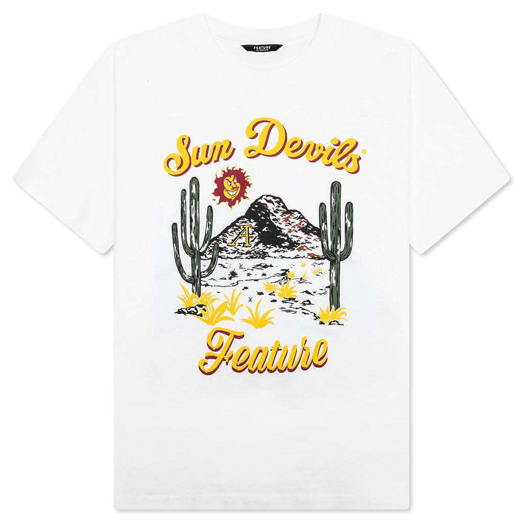 In our latest FEATURE x Arizona State University graphics capsule, we introduce the Hill Tee. Composed of 100% cotton, this design has a crew neckline with ribbed trims and a boxy fit. The look is highlighted by the screen-printed desert hill motif at the front that showcases the ASU Sun Devil, accompanied by co-branded FEATURE x ASU elements to complete the look. 100% Cotton Exclusive to FEATURE Crew neckline Ribbed trims Screen-printed graphics Co-branded graphics Style No: F120624X06-WHT