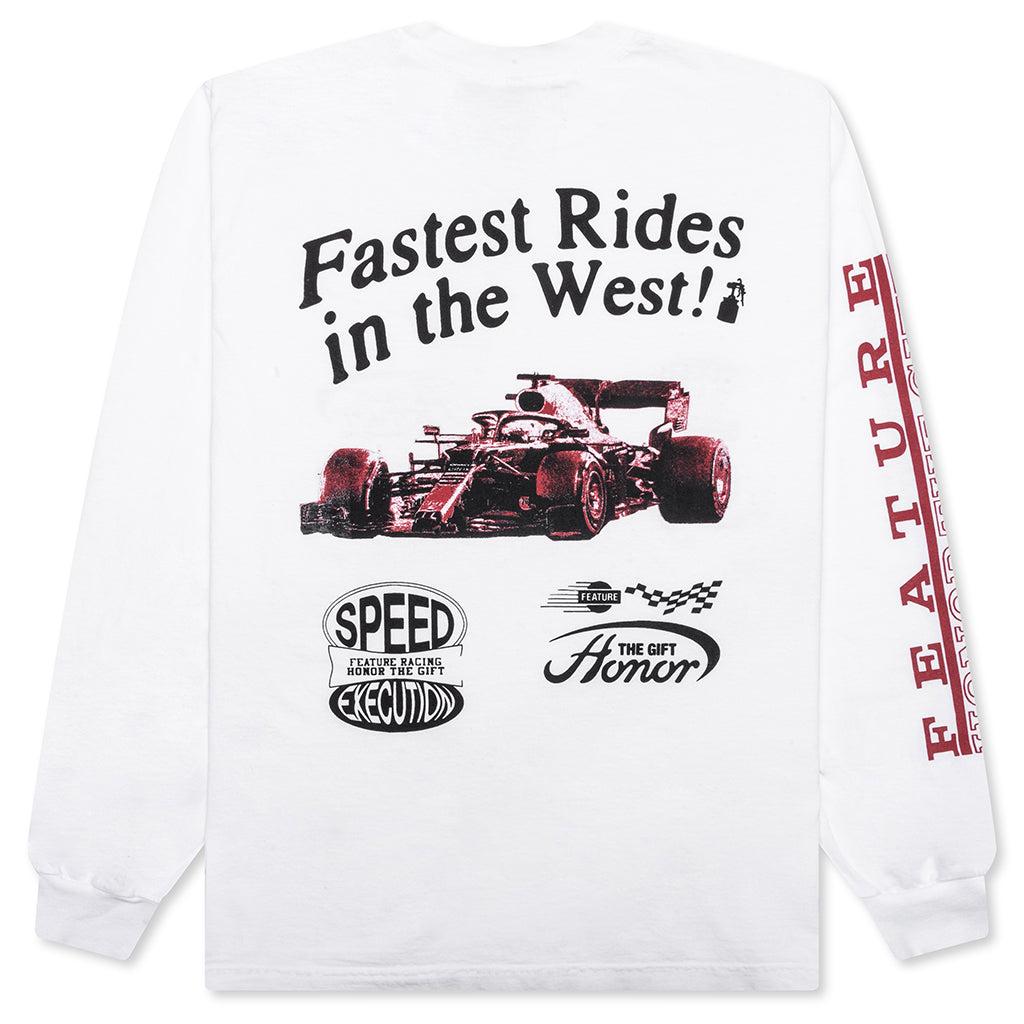 The FEATURE x Honor The Gift Fastest Rides L/S Tee in White combines motorsport-inspired style with a premium streetwear feel. Crafted from cotton in an oversized fit, this long-sleeve tee features co-branded graphics on the front, back, and sleeves for a bold, all-around look. A woven label tag at the seam adds a final touch, embodying the energy and collaborative spirit of FEATURE and Honor The Gift. THIS PRODUCT DOES NOT QUALIFY FOR DISCOUNTS OR SPECIAL PROMOTIONS. ALL SALES ARE FINAL. 100% Cotton Oversized fit Co branded printed graphic on front, back, & sleeves Motorsport inspired graphics Woven label tag at seam Style No: HTG240502-WHT