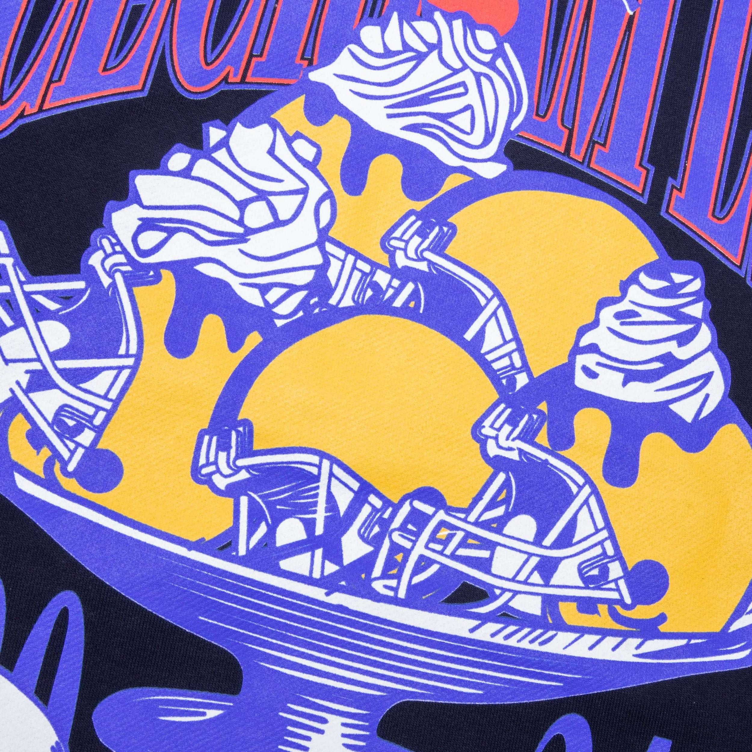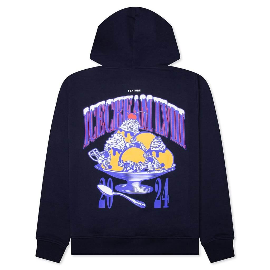 Our exclusive capsule collection, FEATURE x Icecream, the Super Bowl Hoodie is a classic pullover with an adjustable drawstring hood, and an original, unique graphic of football helmets as scoops of ice cream, with an 'Icecream LVIII' on the back. Made with a kangaroo pocket and ribbed cuffs and hem. DUE TO THE NATURE OF THIS PRODUCT, ALL SALES ARE FINAL. THIS ITEM IS NOT ELIGIBLE FOR DISCOUNTS OR SPECIAL PROMOTIONS. FEATURE Exclusive Standard fit Long sleeve 100% Cotton Style No: 441-0300-NVY