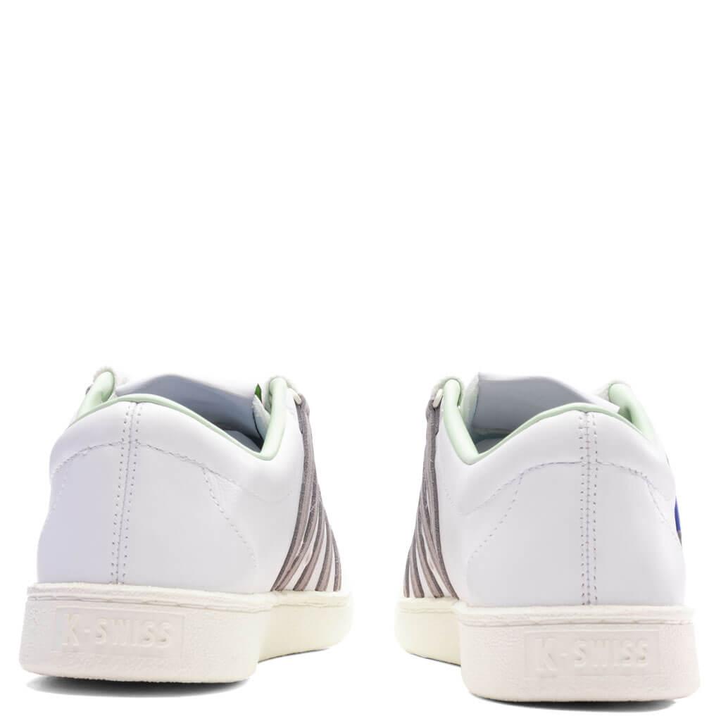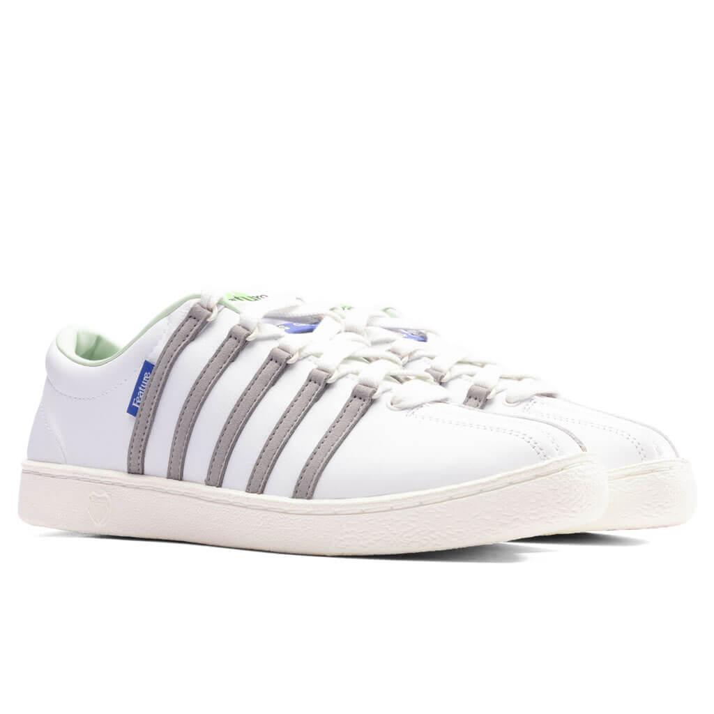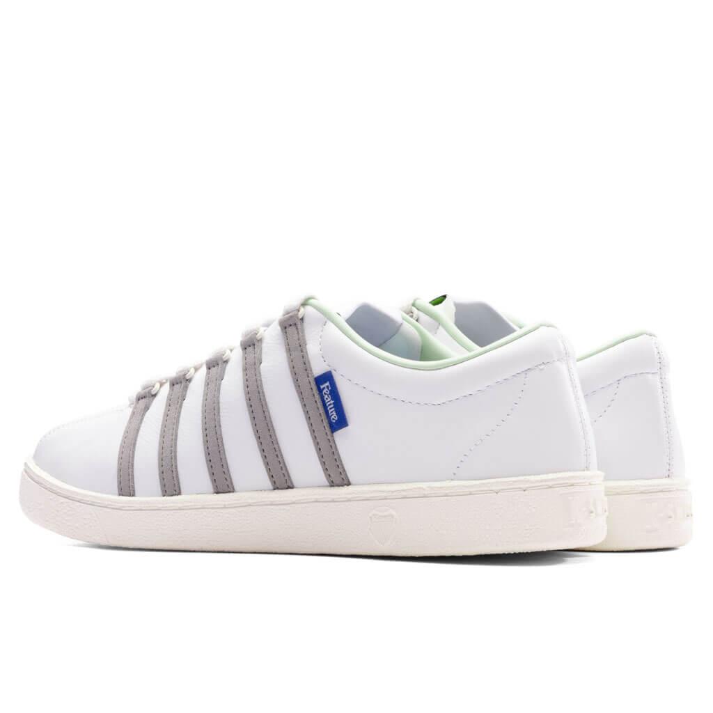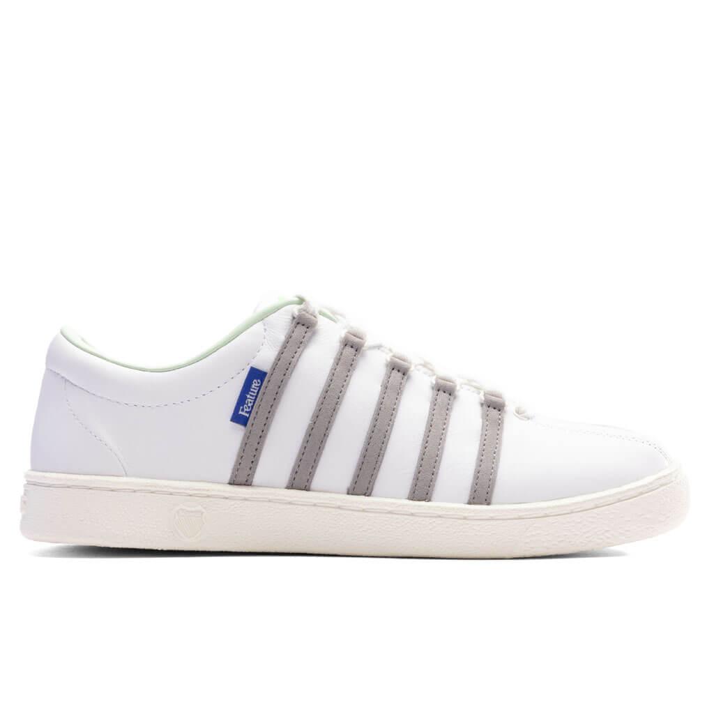 FEATURE joins the heritage lifestyle tennis label K-Swiss to introduce the newest iteration of ‘The Classic.’ In 1966, K-Swiss crafted their first sneaker ‘The Classic’ with a perfect balance of heritage tennis and modern day styling. The D-rings and three-piece toe were designed to support the lateral movements essential to the game of tennis. Over the years, the shoe has gone through subtle variations in material and silhouette, all while retaining its signature, timeless look. The FEATURE x K-Swiss adaptation of the iconic sneaker sports a Marshmallow leather upper with the brands signature leather striped overlay, now in Frost Grey. FEATURE tag branding can be seen on the lateral side, and the custom tongue tag sports a tennis ball stitched detail. The rubber outsole has K-Swiss debossed branding to round off the look. DUE TO THE NATURE OF THIS PRODUCT, ALL SALES ARE FINAL. Leather upper Leather overlays D-ring eyelets Three-piece toe FEATURE branding Rubber outsole Foam cushioning Style No: 78832-147-M