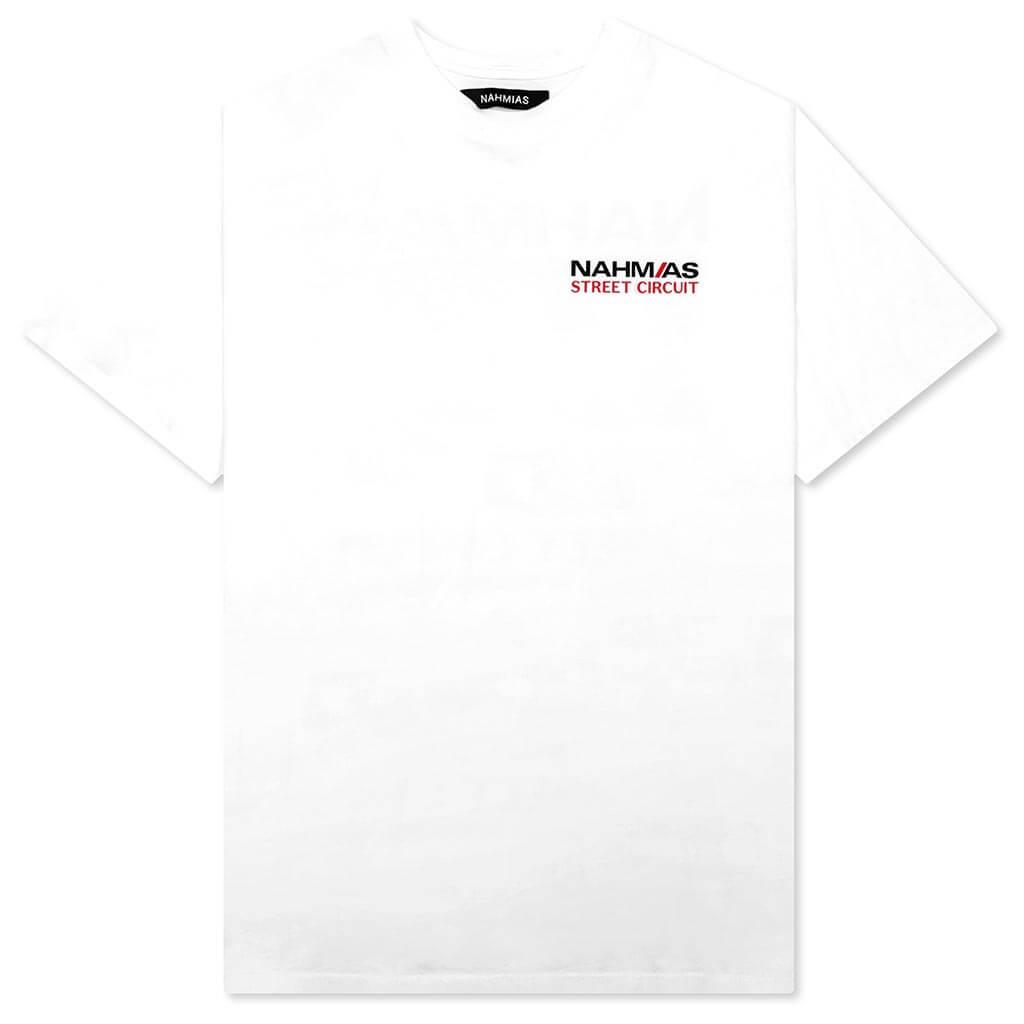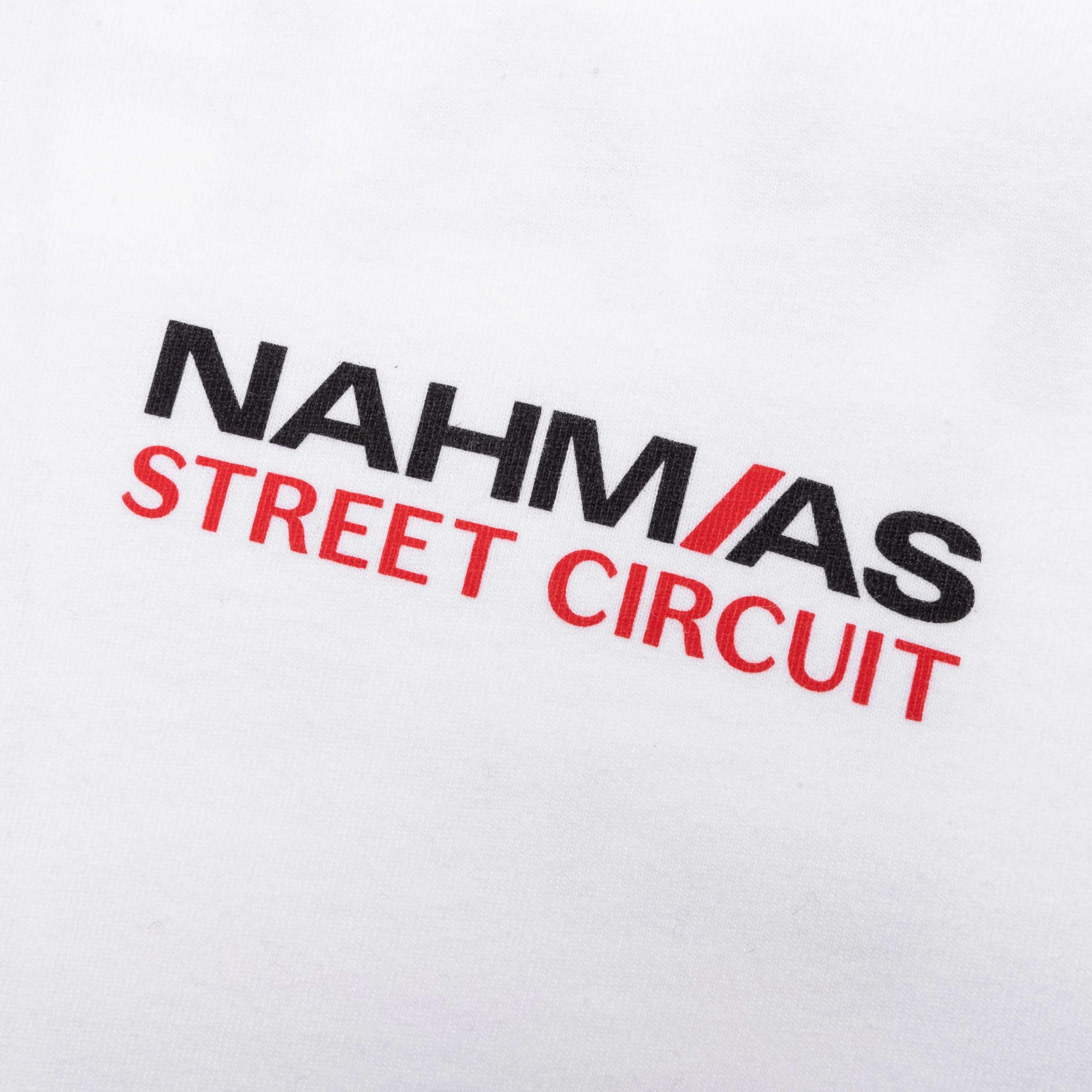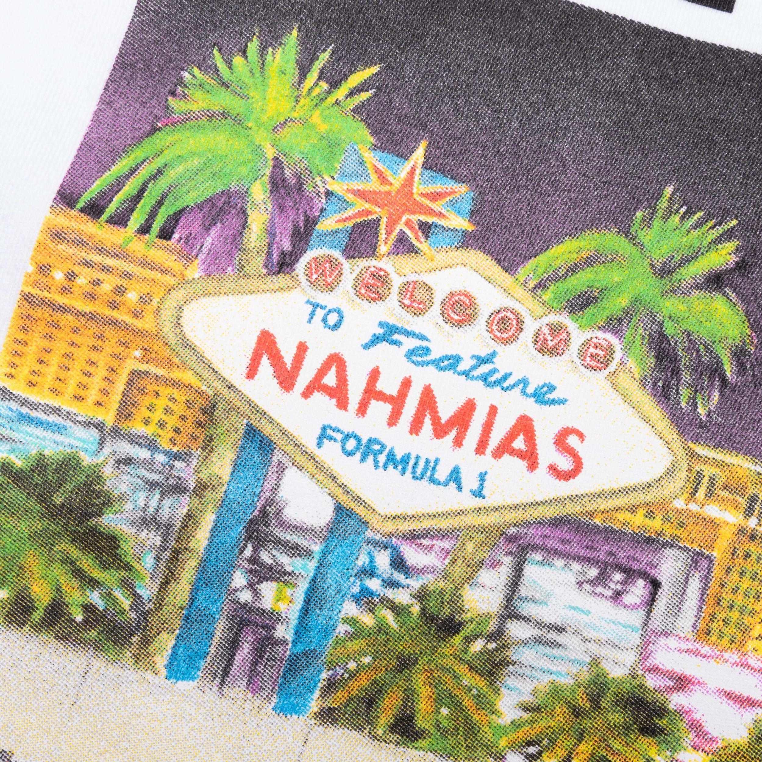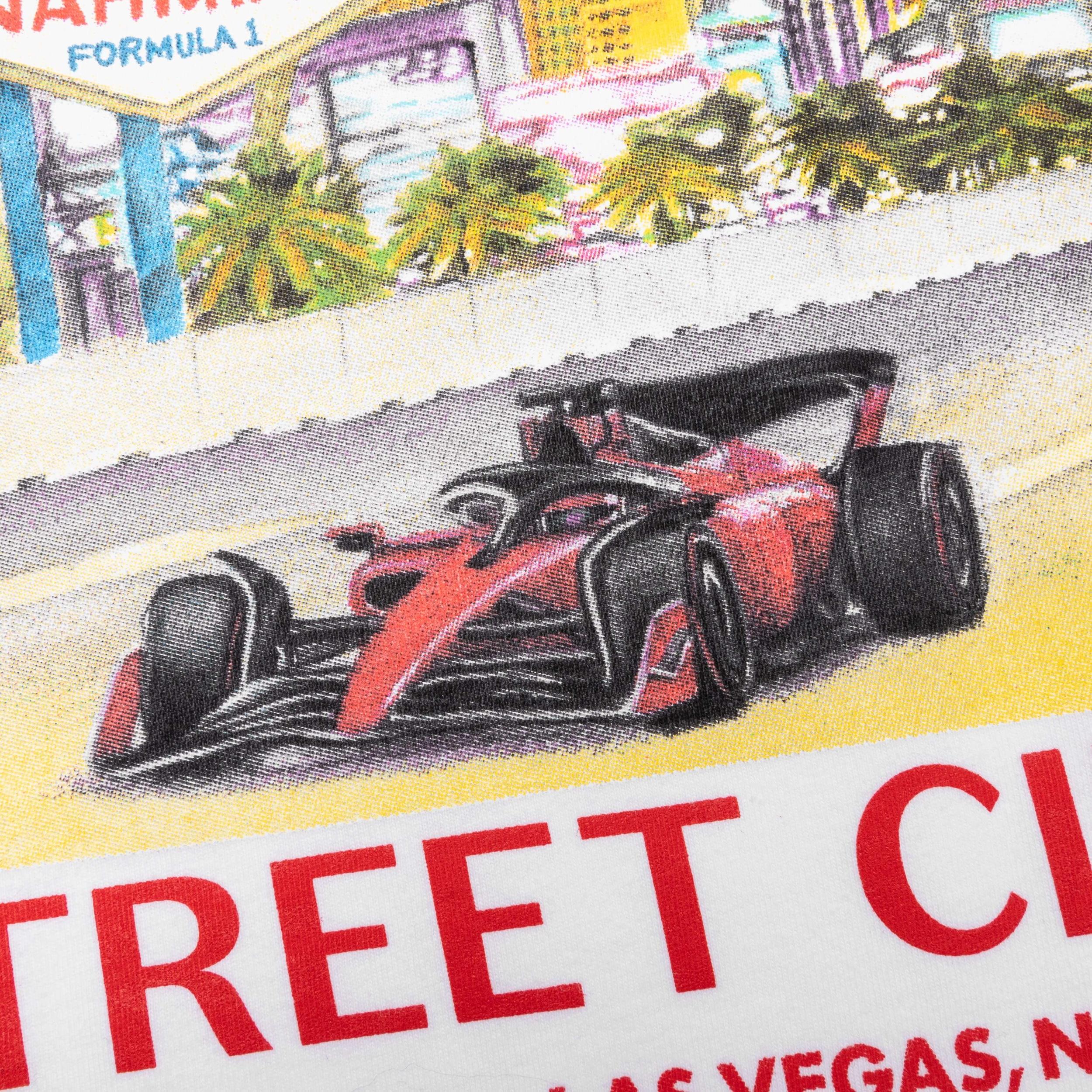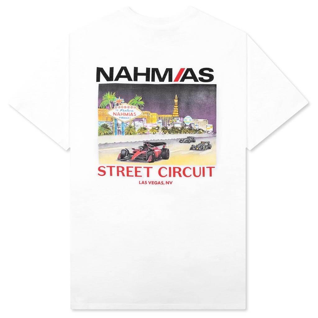 In celebration of the upcoming Las Vegas Grand Prix, FEATURE has teamed up with Nahmias to create a collection of F1 apparel. Introducing the FEATURE x Nahmias Street Circuit T-Shirt, this premium garment is cut from 100% cotton and features screen-printed graphics at the front and back, sporting F1 Las Vegas iconography. A crew neckline is placed, and ribbed trims are added to complete the look.DUE TO THE LIMITED NATURE OF THIS PRODUCT, ALL SALES ARE FINAL. THIS ITEM IS NOT ELIGIBLE FOR DISCOUNTS OR SPECIAL PROMOTIONS. 100% Cotton Made in Los Angeles Crew neckline Screen-printed graphics Ribbed trims Co-branded graphics Style No: Y1-T9K1-100