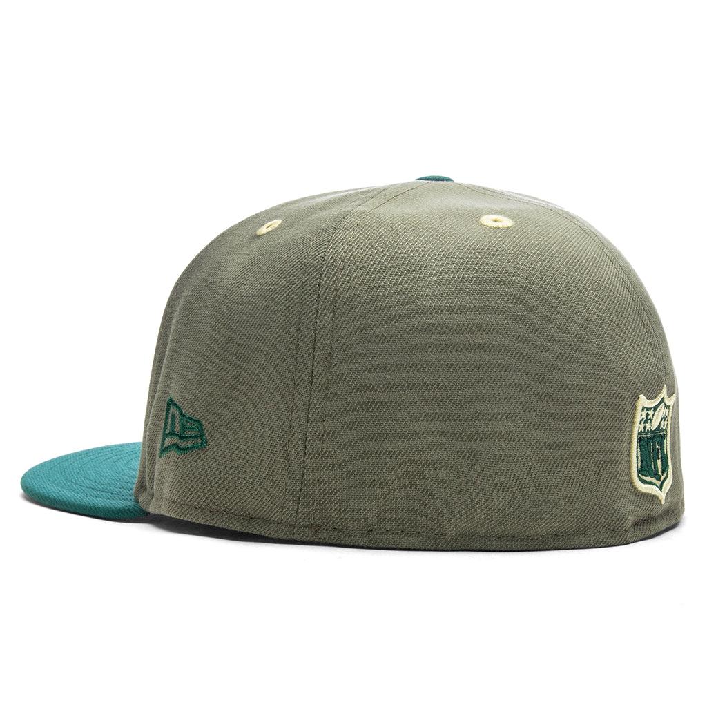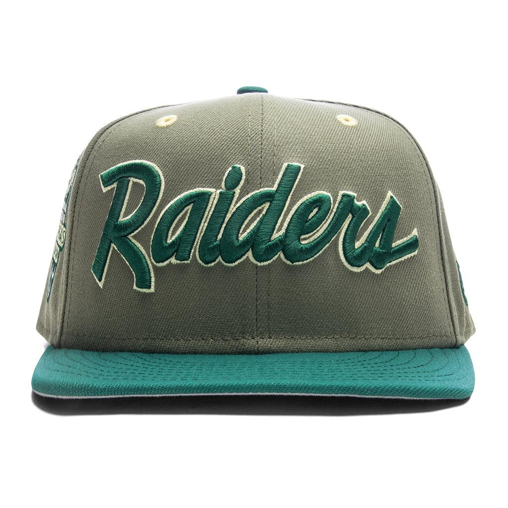 The Feature x New Era 59FIFTY Fitted Las Vegas Raiders Cap in Green Bark/Emerald Green is made from polyester, offering a durable and structured fit. It features embroidered branding, woven eyelets for breathability, and a classic flat brim. Designed as a fitted cap, it delivers a sleek, comfortable look representing the Raiders with style. 100% Polyester Embroidered branding Woven eyelets Fitted cap Flat brim Style No: 70897684
