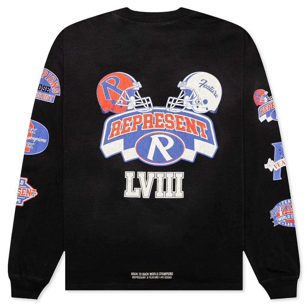 Made in collaboration with UK based brand, FEATURE x Represent's exclusive capsule collection arrives the Champions L/S T-Shirt, made with a clean vintage wash and an original double branded graphic for Super Bowl LVIII in Las Vegas. DUE TO THE NATURE OF THIS PRODUCT, ALL SALES ARE FINAL. THIS ITEM IS NOT ELIGIBLE FOR DISCOUNTS OR SPECIAL PROMOTIONS. Standard fit Crew neckline Waist length Style No: MLM4296-230