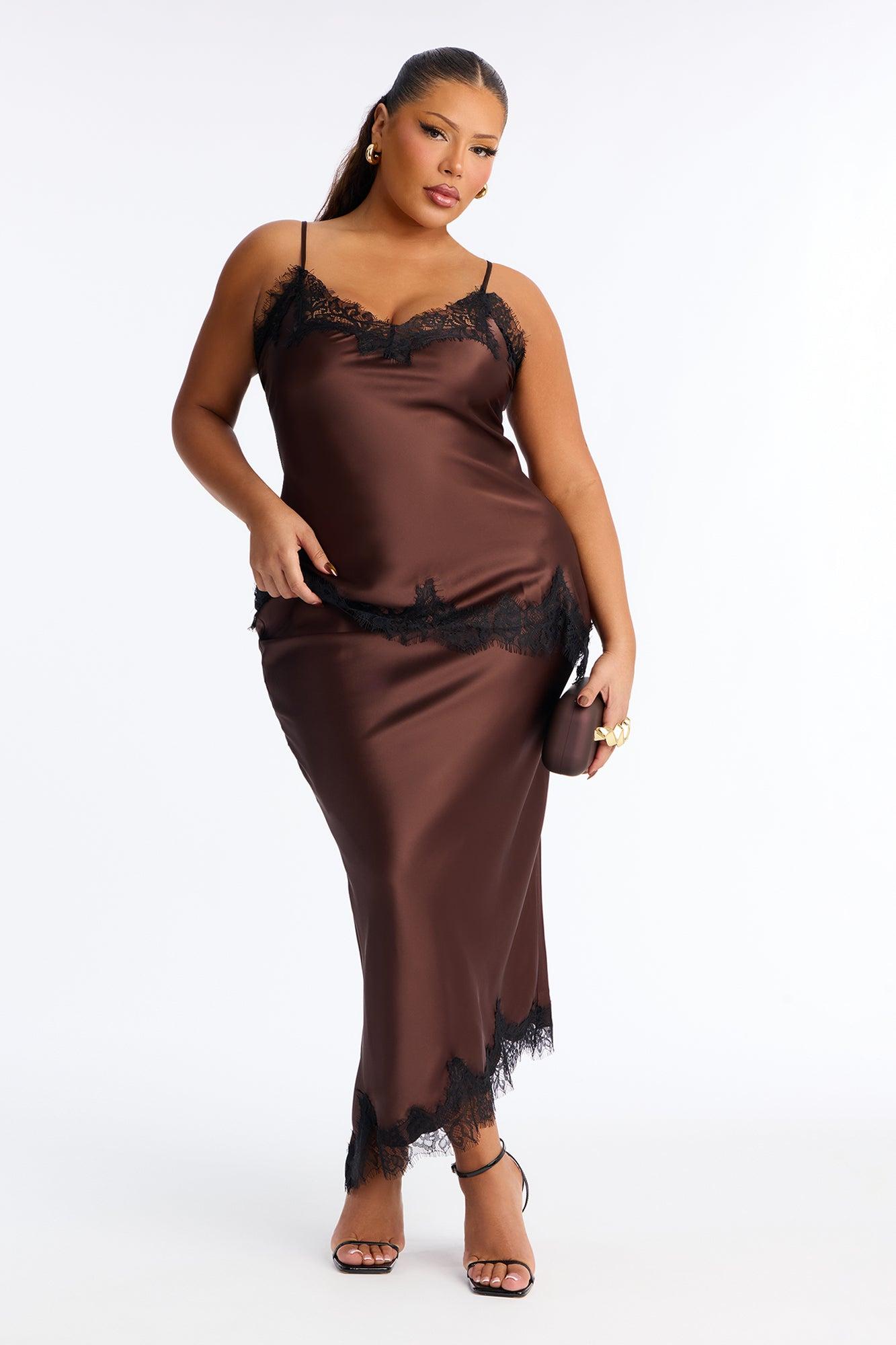 Available In Chocolate. 2 Piece Ensemble Cami And Midi Skirt Set Stretch Adjustable Straps Elastic Waistband Top & Bottom Self: 97% Polyester 3% Spandex Top & Bottom Contrast: 100% Nylon Imported California Proposition 65WARNING: Cancer and Reproductive Harm - www.P65Warnings.ca.gov.