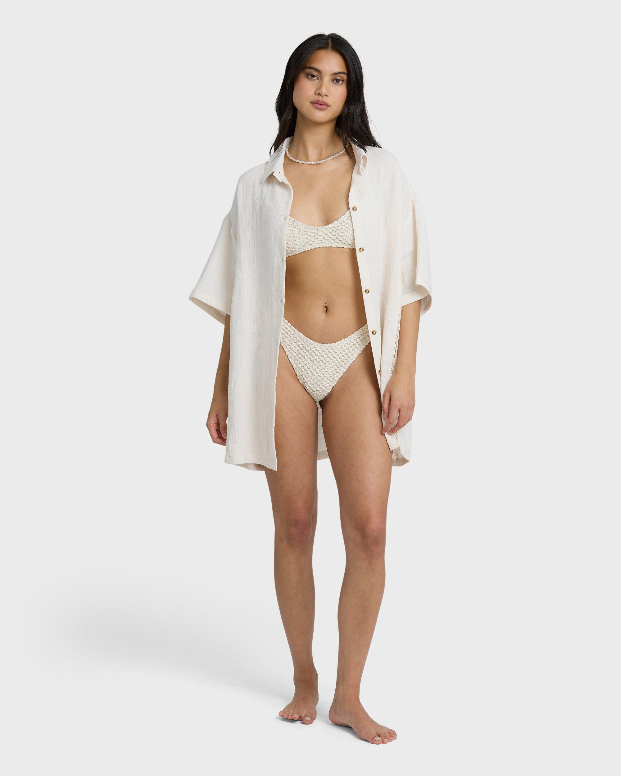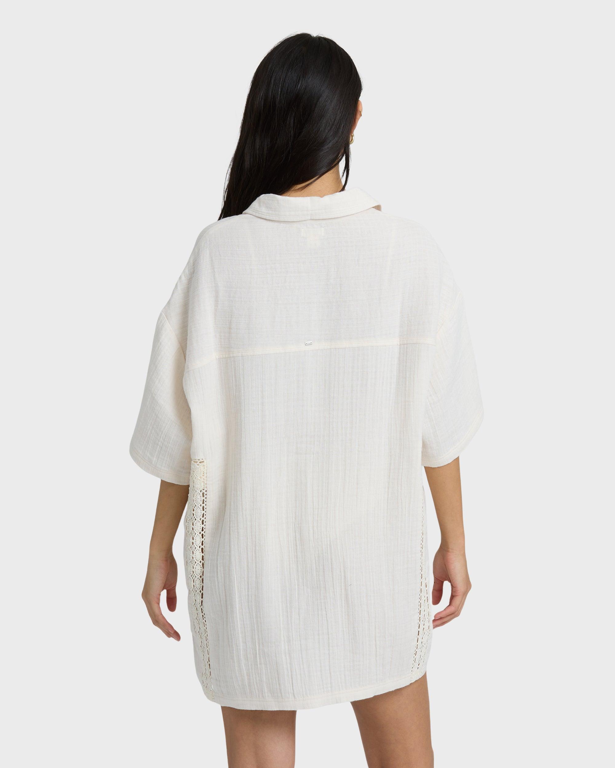 Keep it casual-cool in our Feelin Fine Shirt Dress. This oversized button-down silhouette crafted from 100% cotton offers breezy comfort while delicate inset lace trim adds a feminine touch. The classic collar and front placket create a versatile piece that transitions effortlessly from beach cover-up to dinner date. Features Fabric: 100% cotton check gauge Type: Oversized button down Fit: Front button placket, collar, and inset lace trim. Features: Metal plate