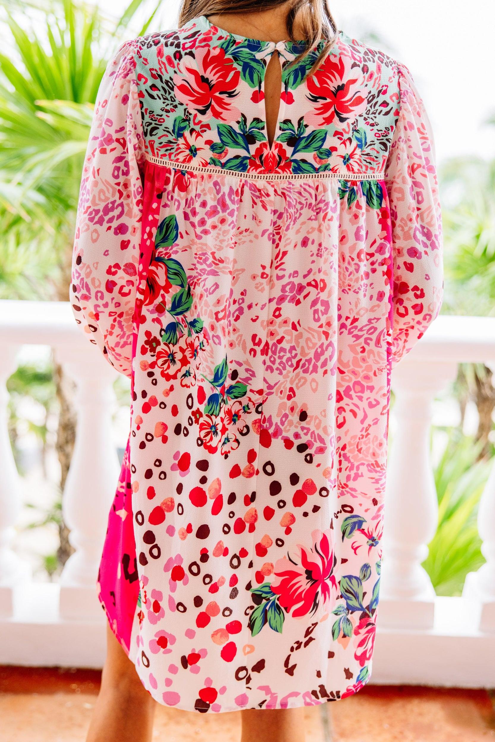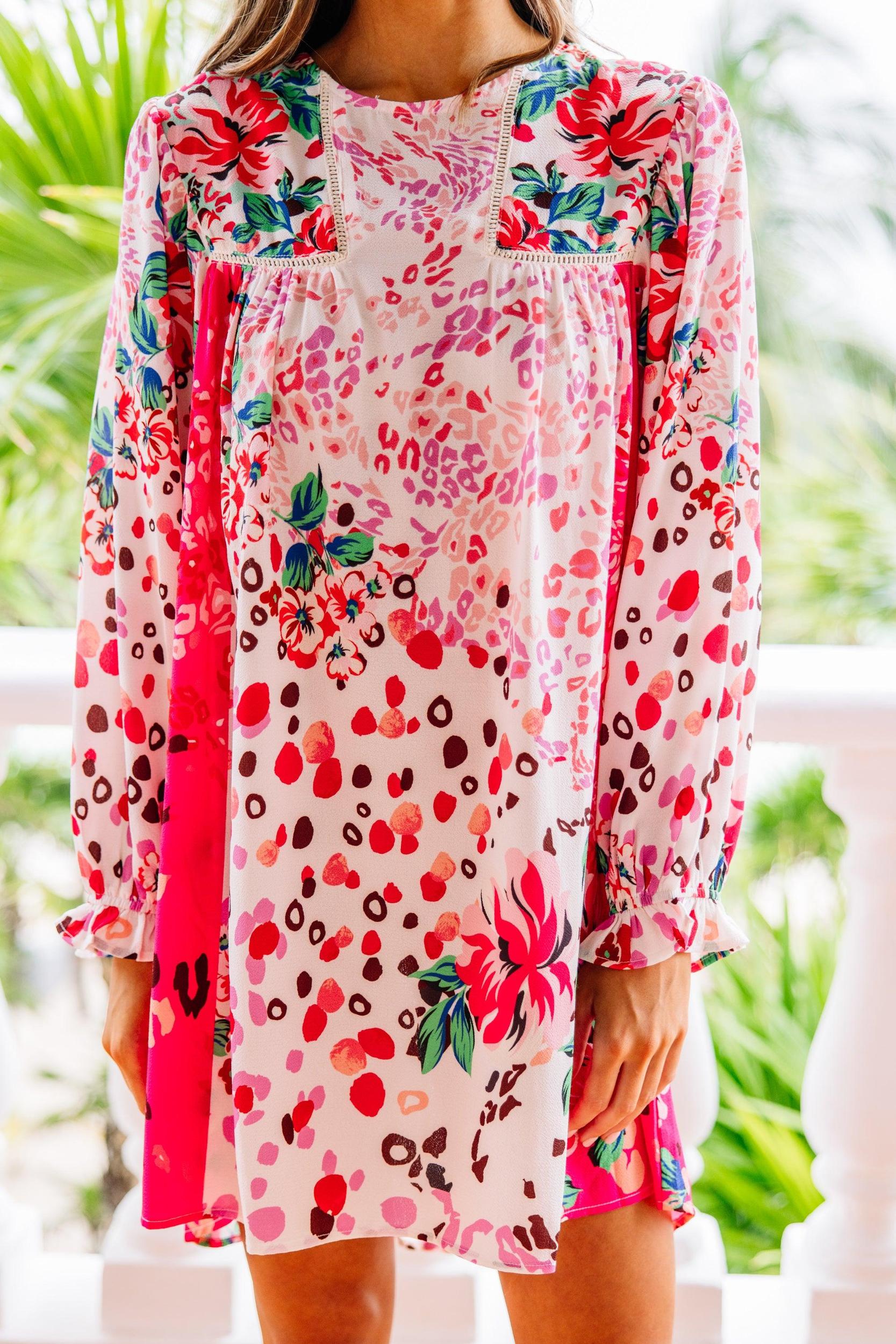 If you are feeling compelled to purchase this dress, you should probably go with that feeling! Those vibrant colors and the mix of florals and animal prints are fabulous together! This dress is a spring dream! This dress features long sleeves, with elastic cuffs, a round neckline, a mixed floral print, and a babydoll cut. Material has no amount of stretch.Sydney is wearing the small.