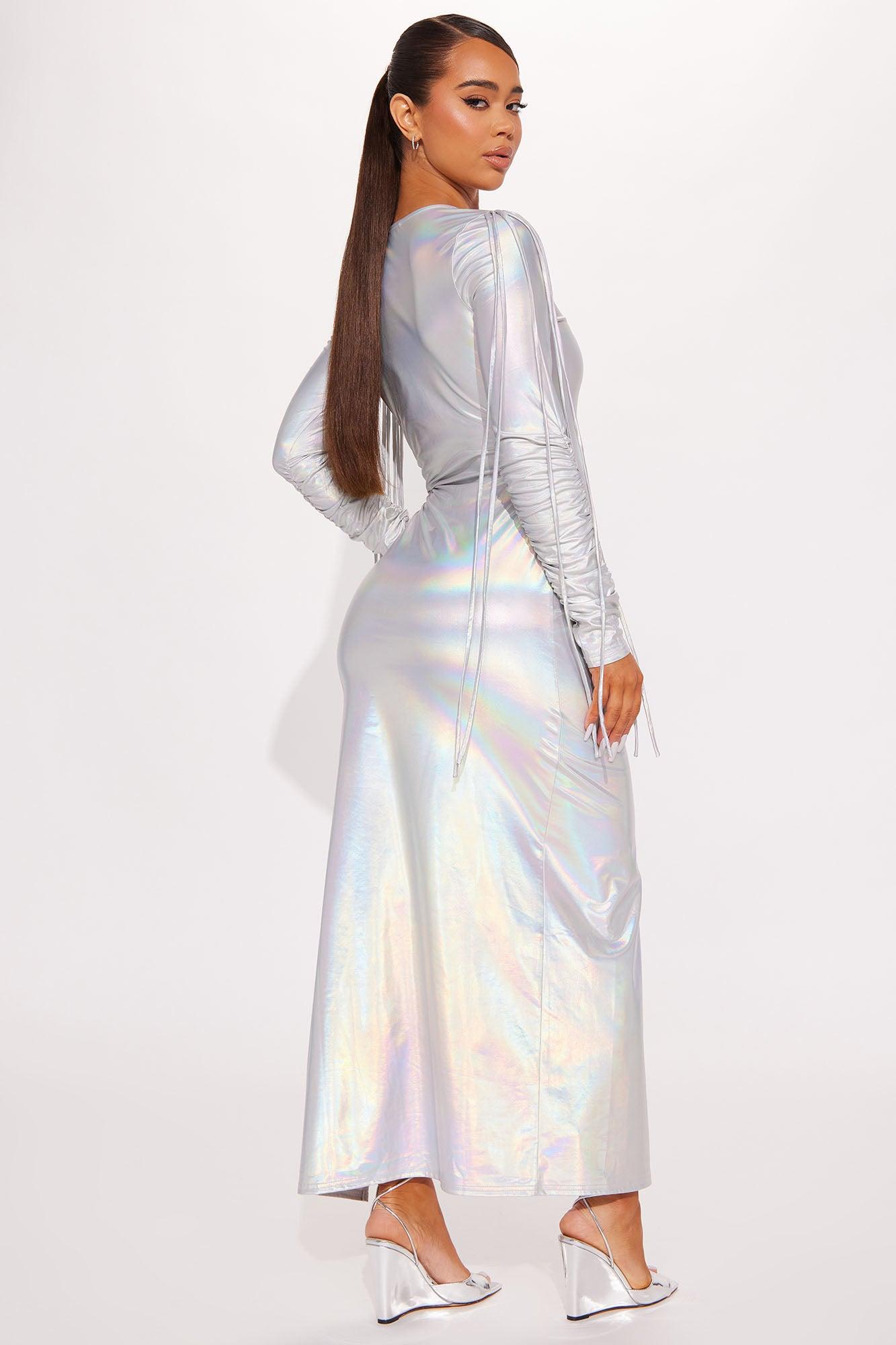 Available In Silver. Metallic Maxi Dress Long Sleeve Fringe Detail Cut Out High Slit Stretch Self 95% Polyester 5% Spandex Imported California Proposition 65 WARNING: Cancer and Reproductive Harm - www.P65Warnings.ca.gov.