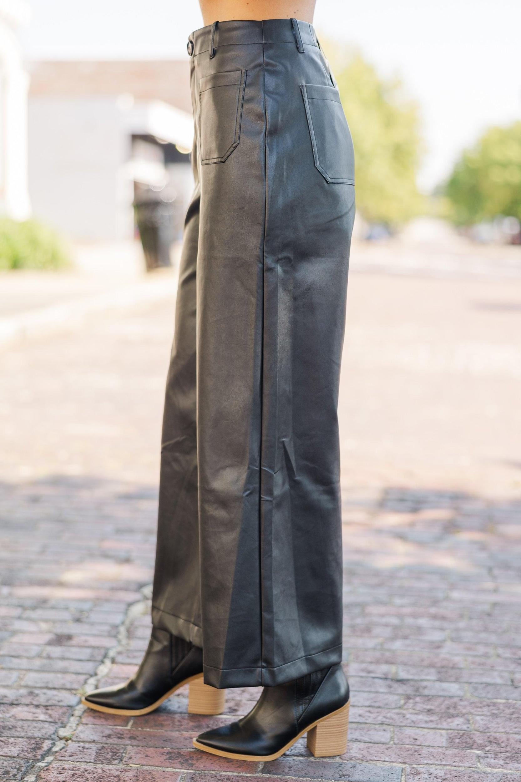 These wide leg pants are so chic! They will have you feeling so confident in your outfit, you'll be able to focus on any thing you put your mind too! That fabric is so perfect for the fall and these will look great with flowy blouses or cozy sweaters. Button/zip front closure Pockets Wide legs Faux leather fabric Minimal stretch Payton is wearing the small.