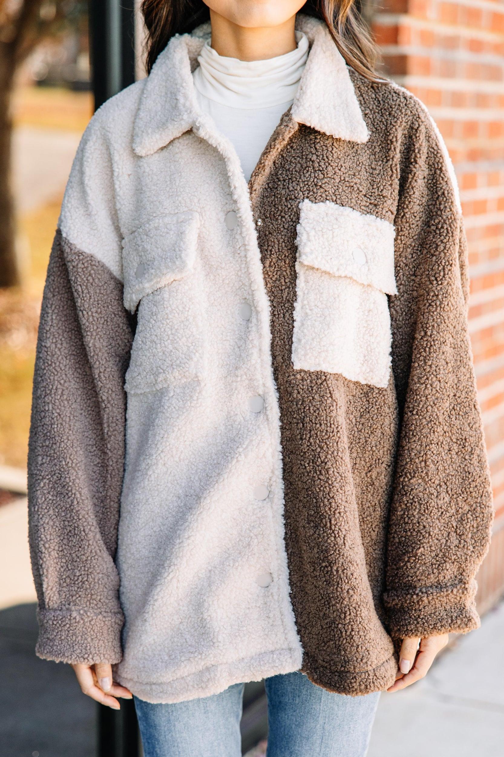 This shacket is super cozy and warm! That sherpa fabric is fabulous for the winter! Plus, the best part of a shacket is its versatility! You are going to love being able to style this shacket open or closed! This shacket features long sleeves, a collared neckline, button down front closure, breast pockets, a colorblock print, and full sherpa fabric. Material has no amount of stretch.Cindy is wearing the small.