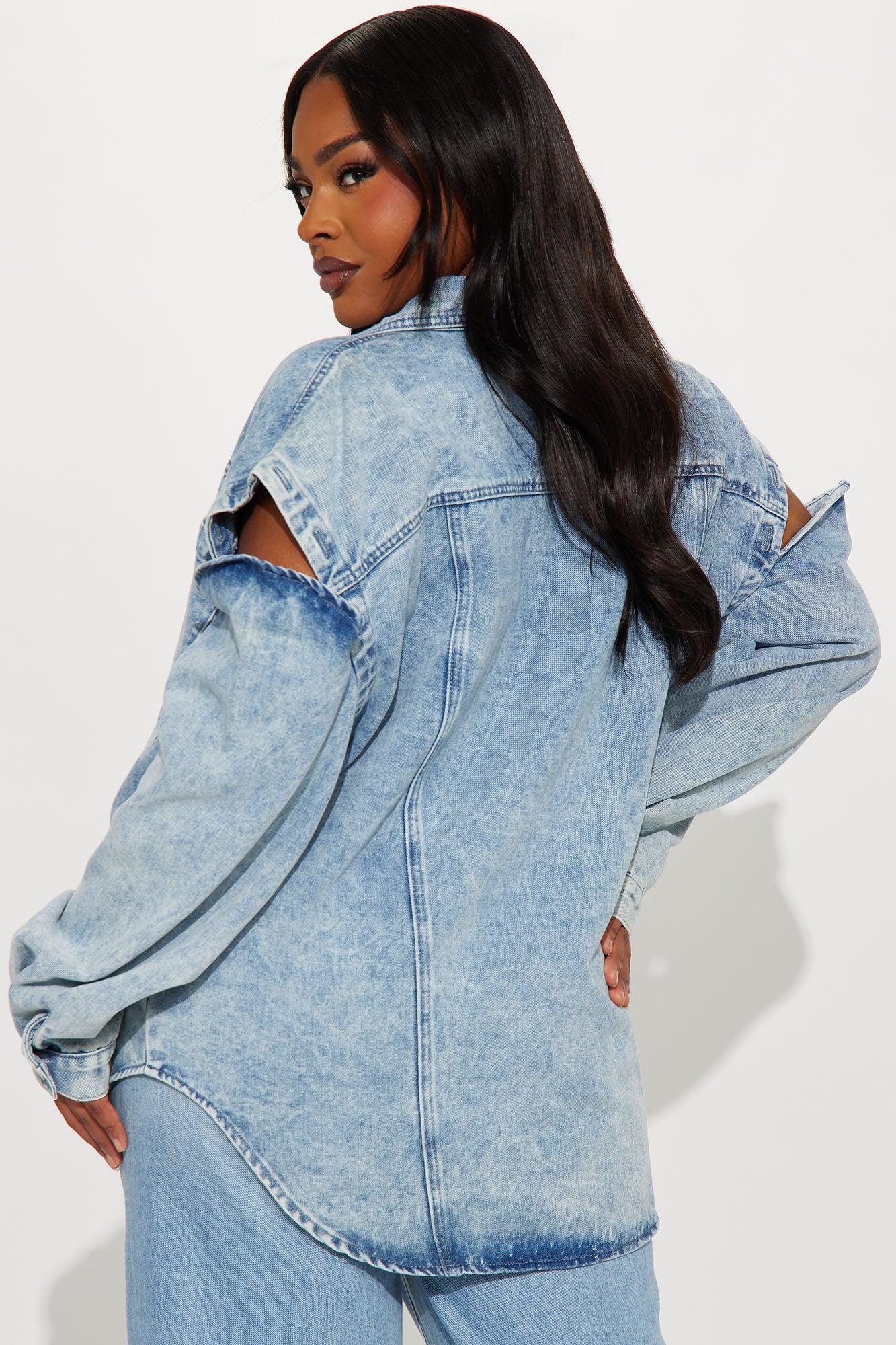 Available In Light Wash. Denim Jacket Collar Long Sleeve Denim Washed Cut Out Detail Button Closure Pocket Non Lined Disclaimer: Due To The Specialized Wash Process, Each Garment Is Unique. Shell 80% Cotton 20% Polyester Imported California Proposition 65WARNING: Cancer and Reproductive Harm - www.P65Warnings.ca.gov.