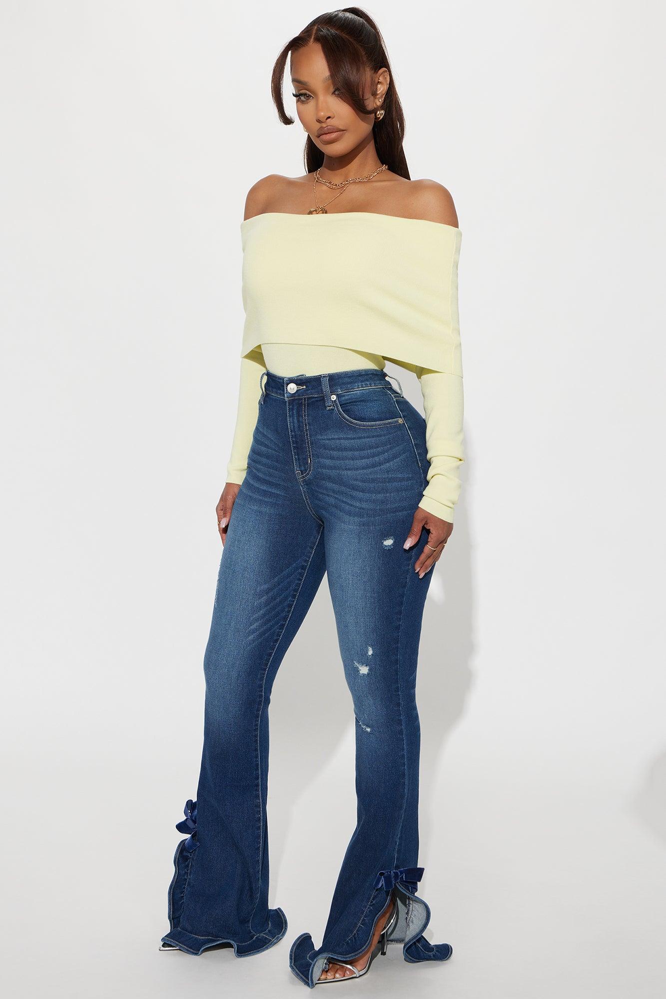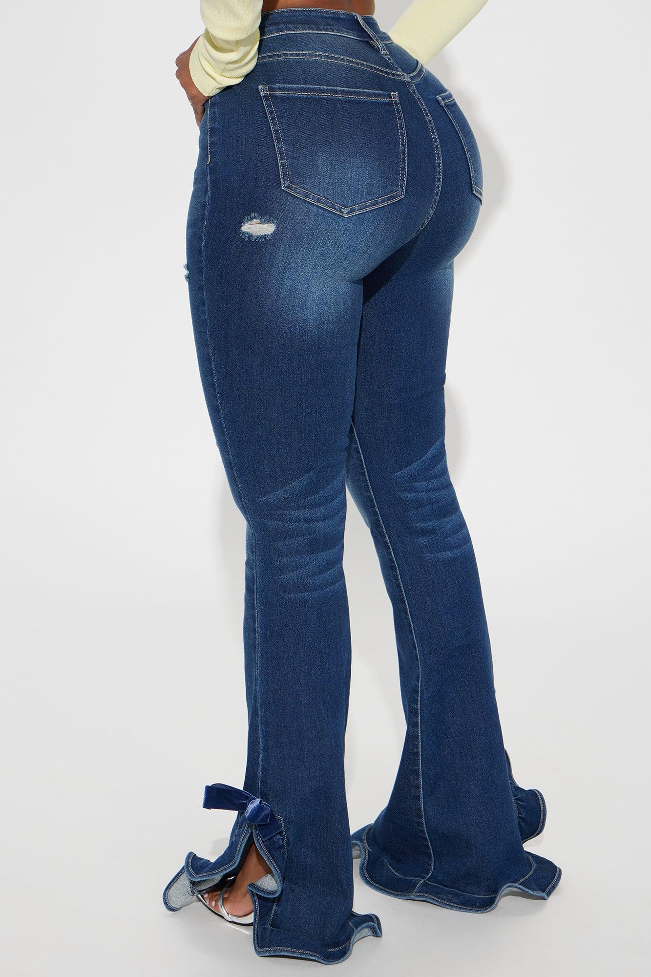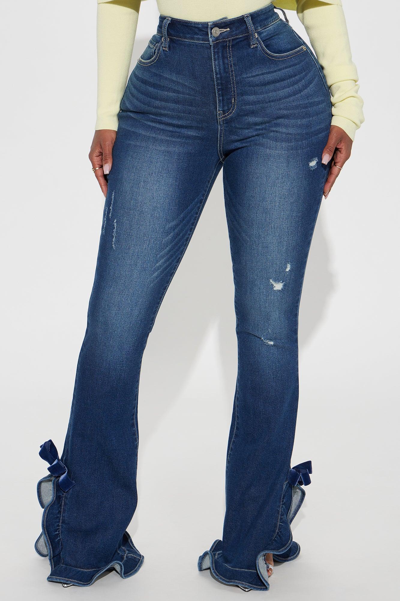 Available In Dark Wash. Bootcut Jean 5 Pocket Ruffle Hem Bow Detail Split Hem 11" High Rise 34" Inseam Medium Stretch Disclaimer: Due To The Specialized Wash And Distressing Process, Each Garment Is Unique. 68% Cotton 27% Polyester 3% Rayon 2% Spandex Imported